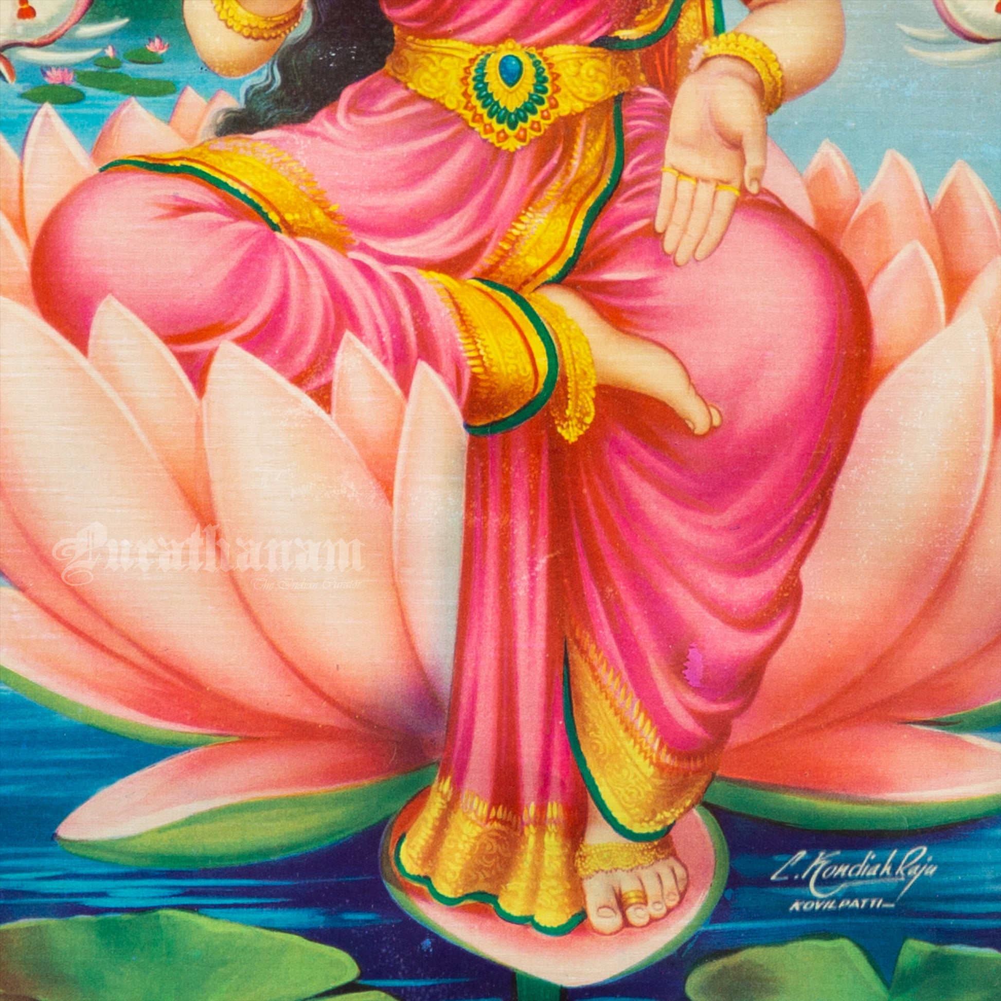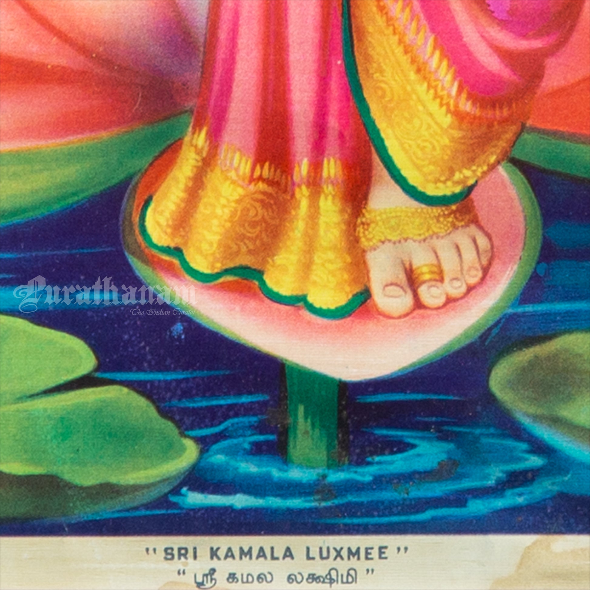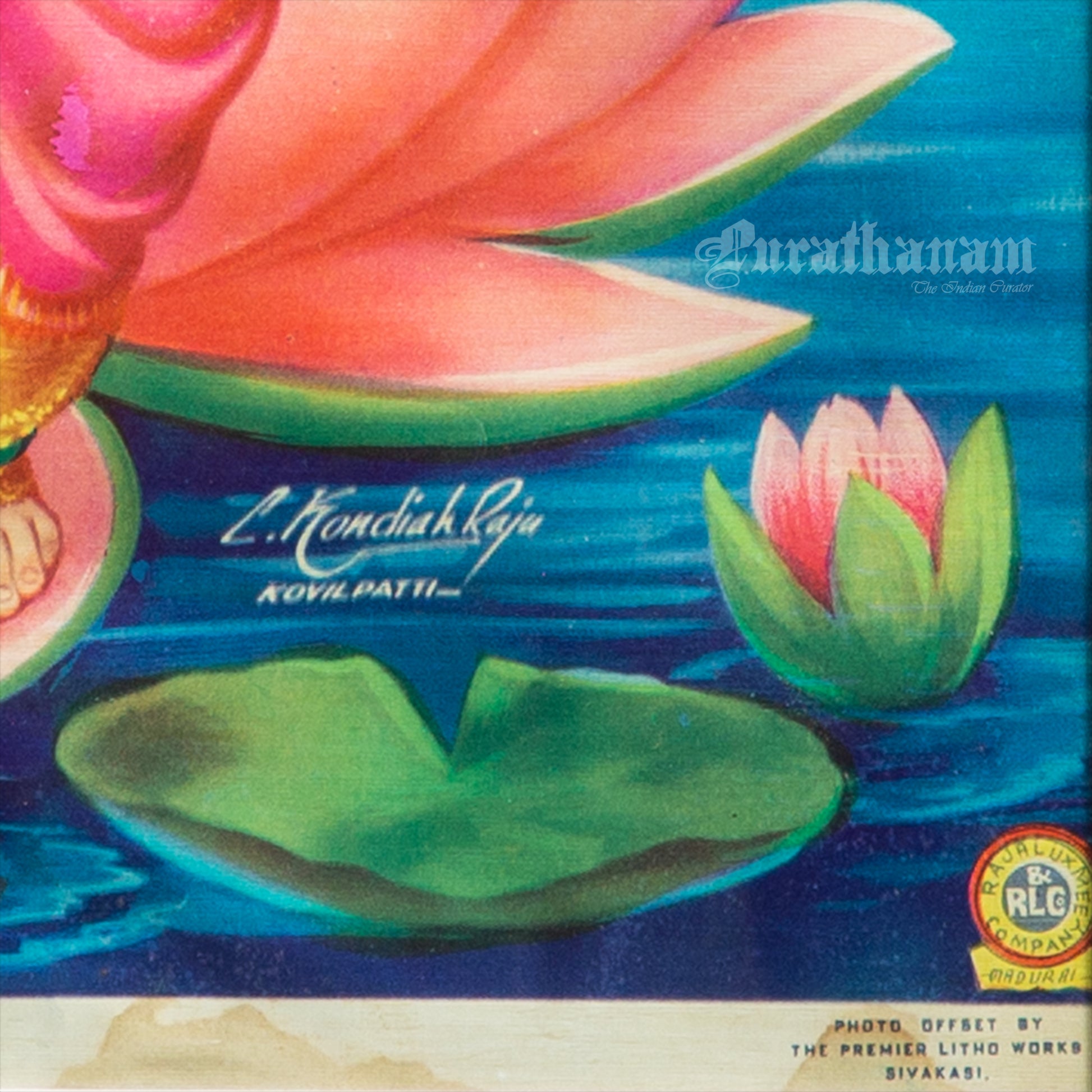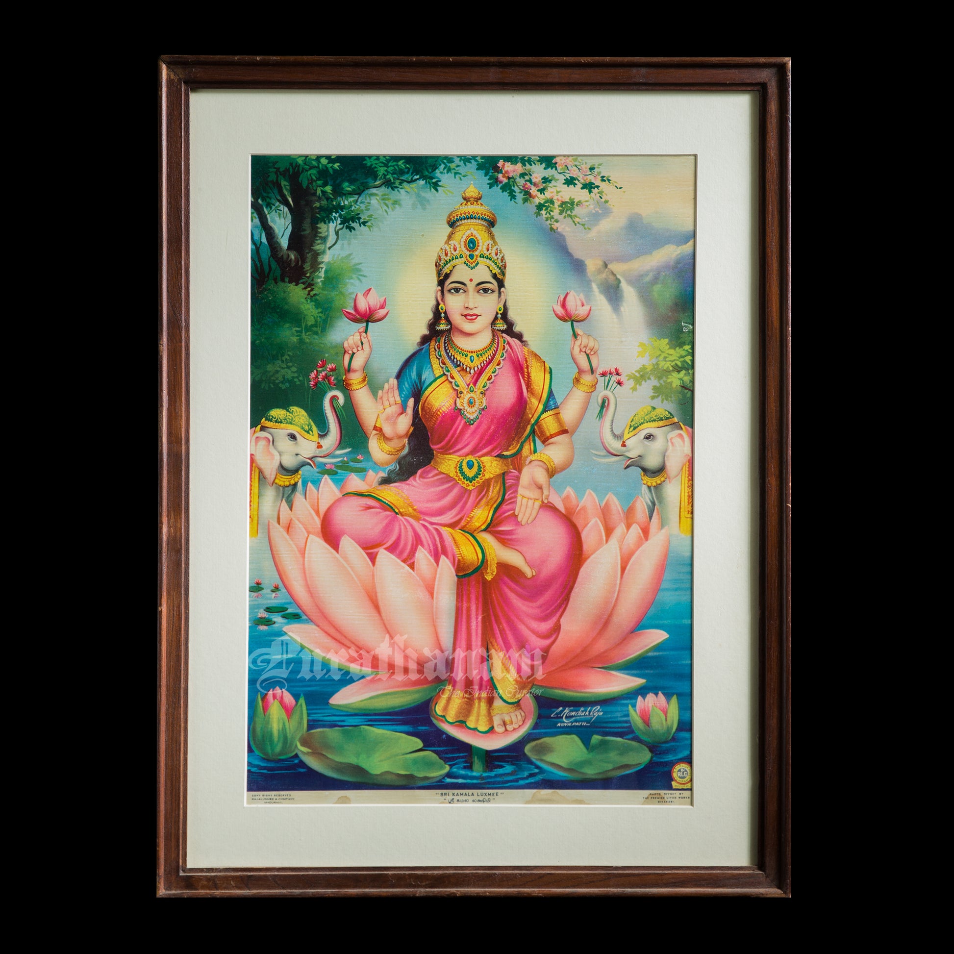 Here we have an off-set print from 1950s of Sree Kamal Lakshmi painting by the famous South indian artist Kovilpatti Kondiah Raju.. It may have some signs of fading due to its age which adds to it's beauty.