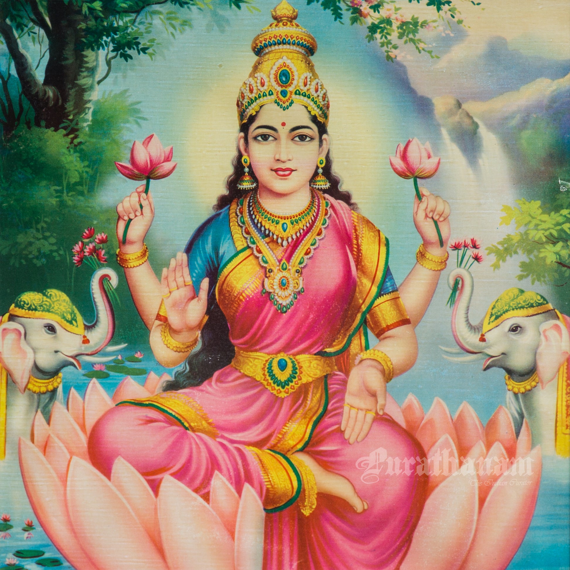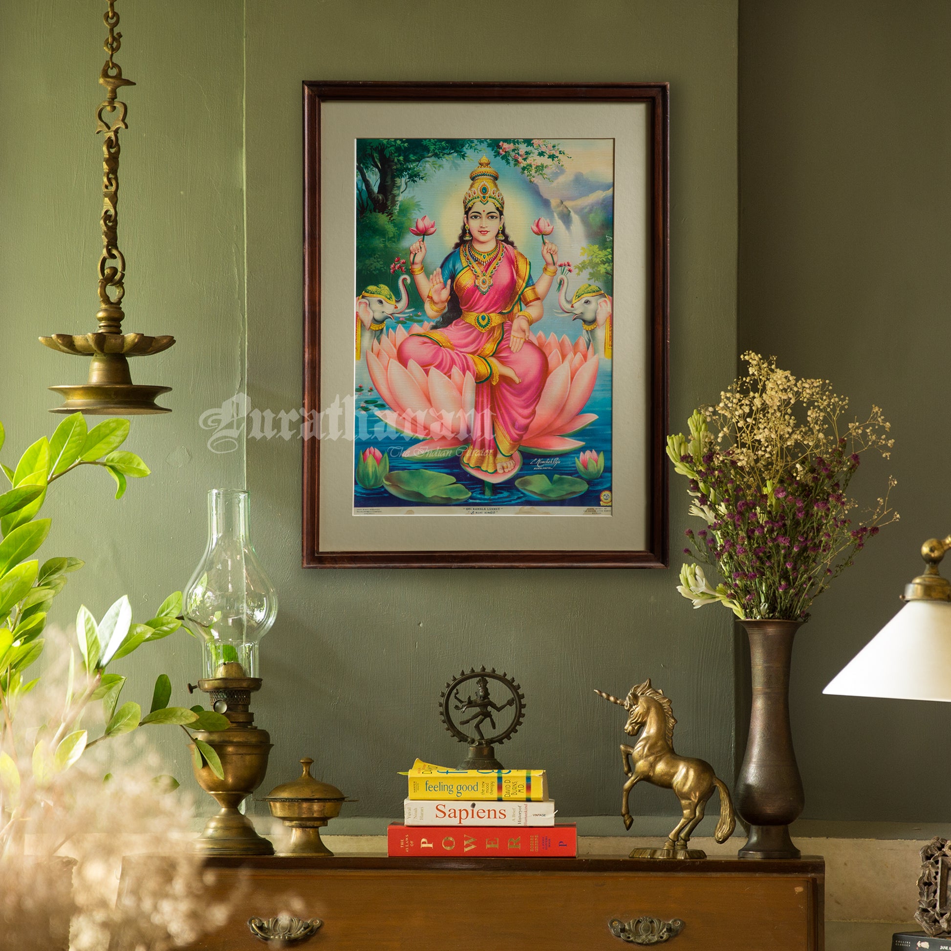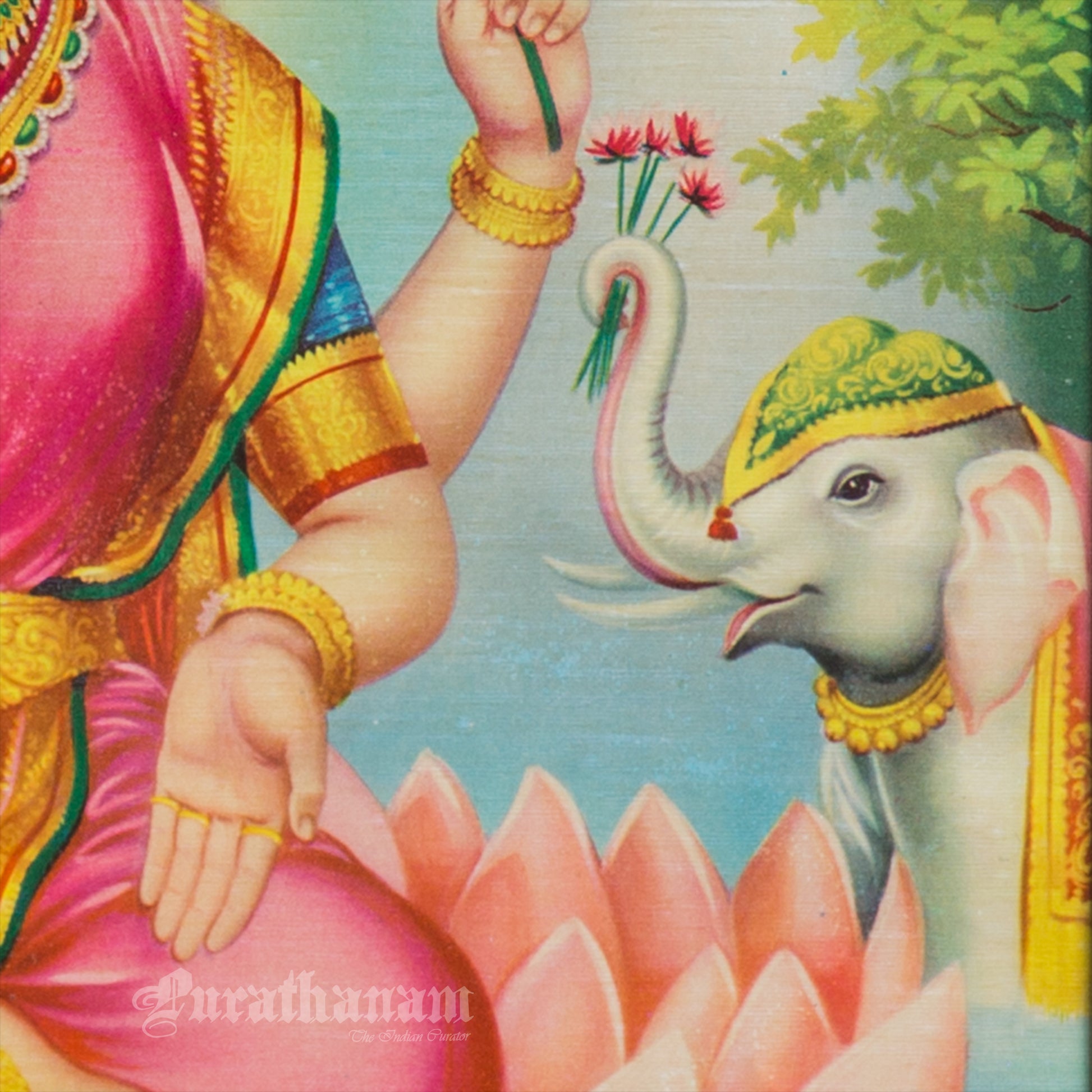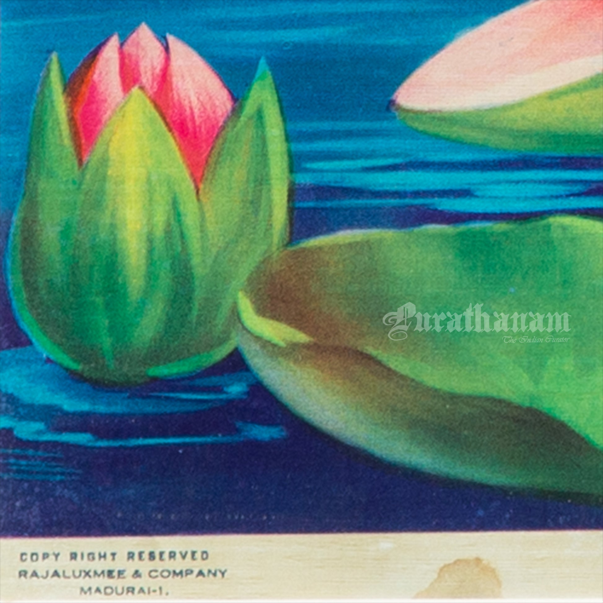 Here we have an off-set print from 1950s of Sree Kamal Lakshmi painting by the famous South indian artist Kovilpatti Kondiah Raju.. It may have some signs of fading due to its age which adds to it's beauty.