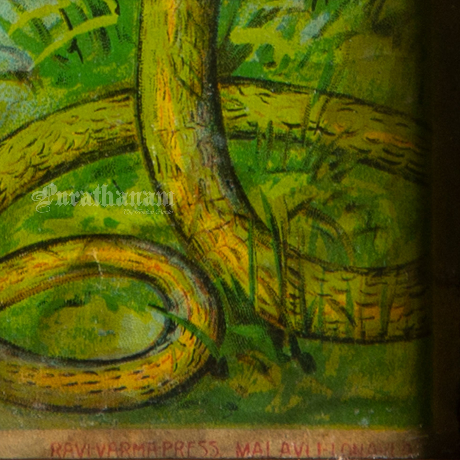 This is an oleograph print from 1920s of Sree Mangal Murti by Ravi Varma an Indian who achieved recognition for his depiction of scenes from the epics of the Mahabharata and Ramayana.