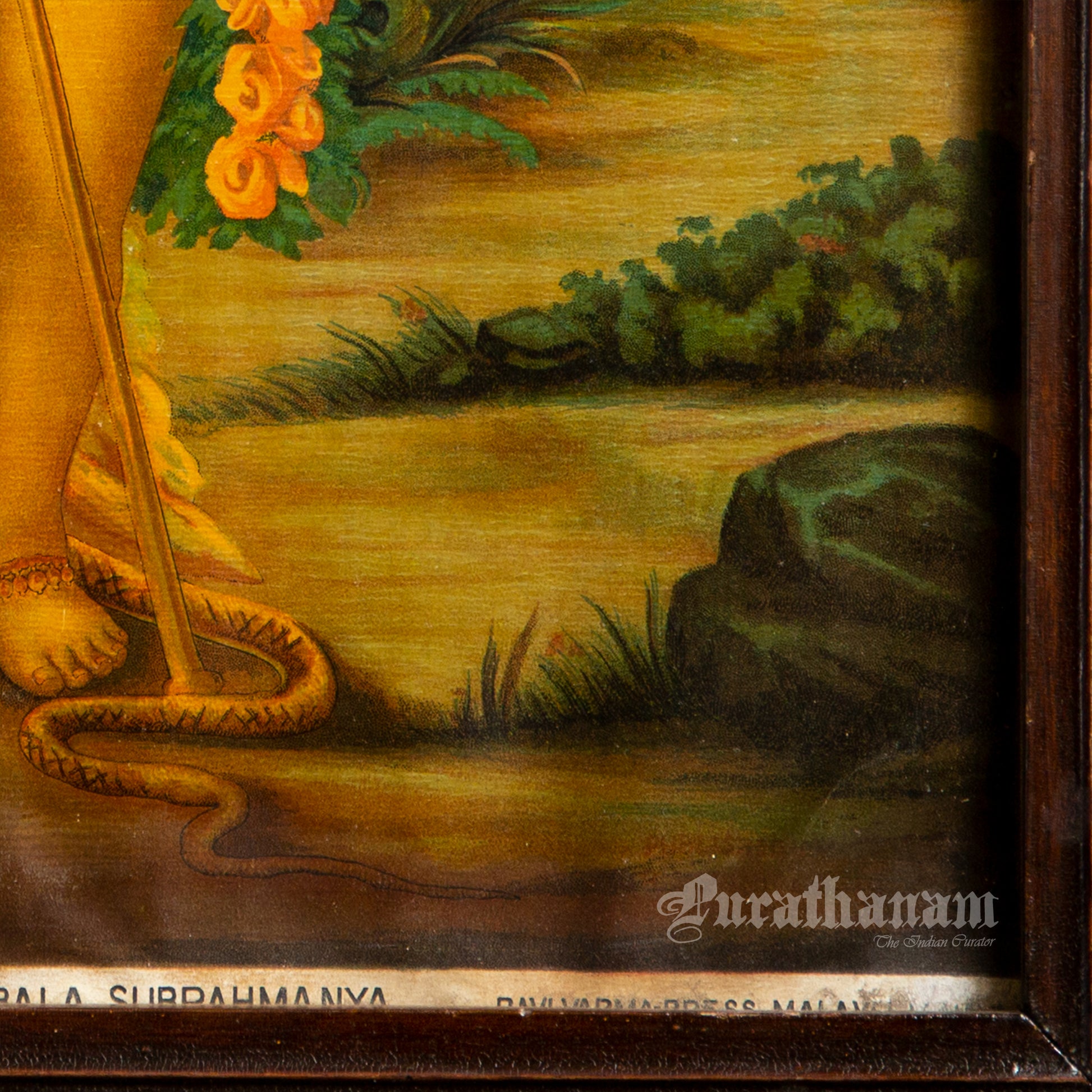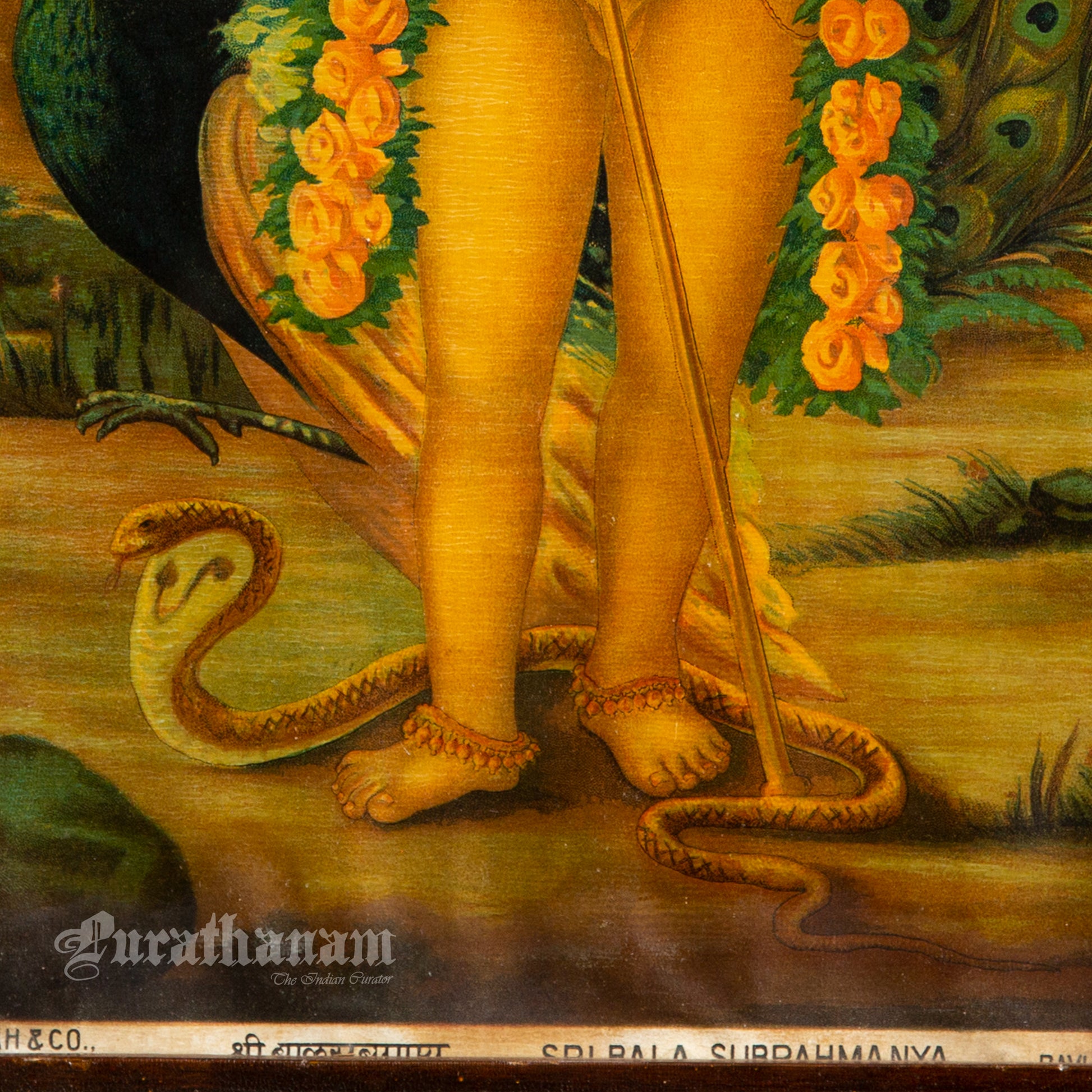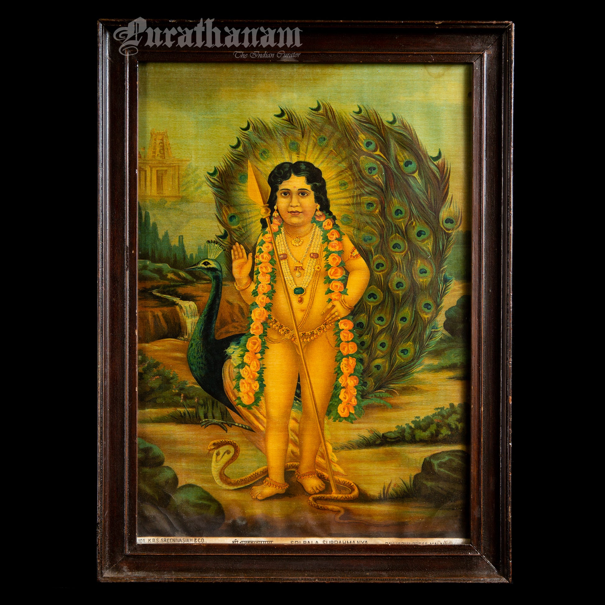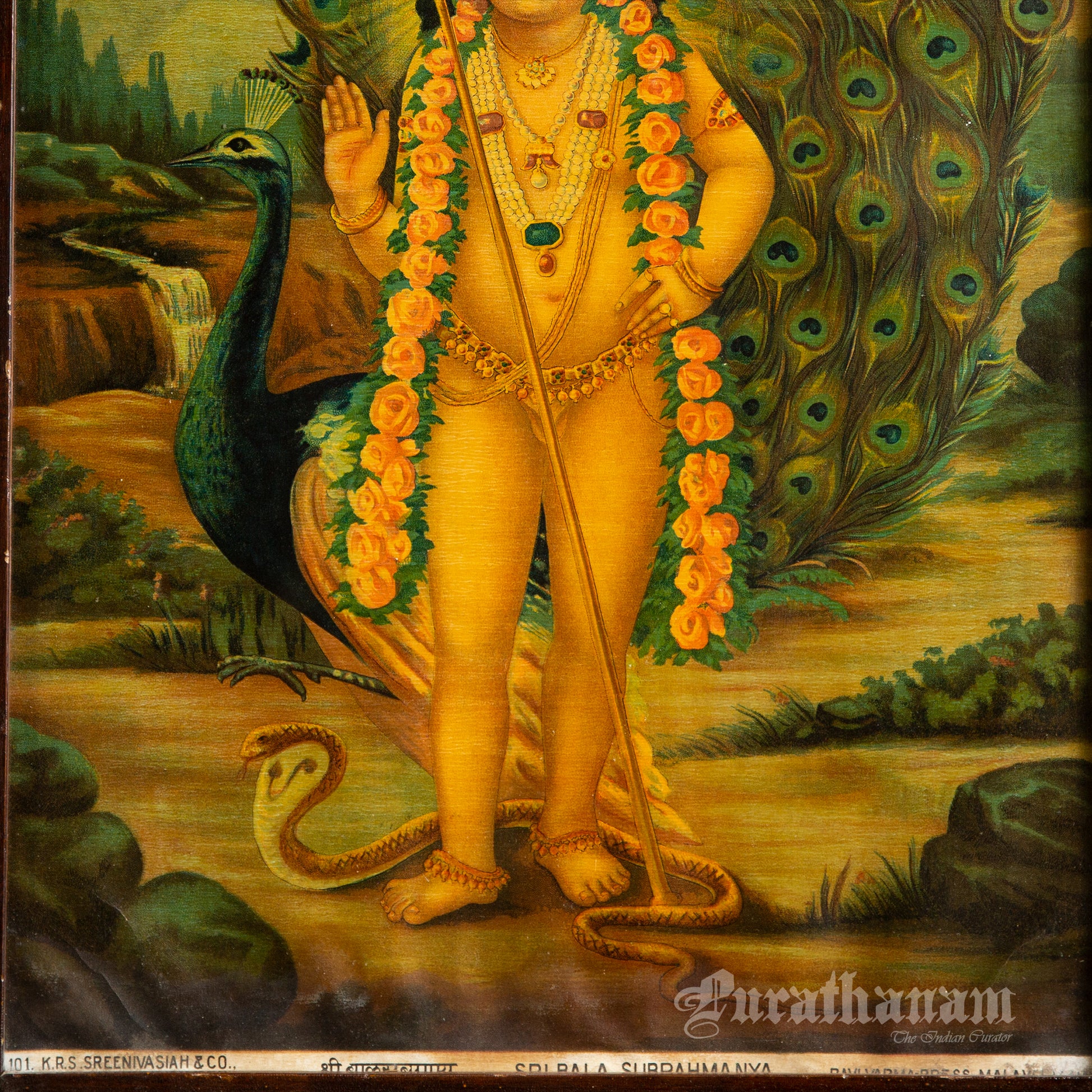 This is an oleograph print of Sri Bala Subrahmanya from Ravi Varma Press, Malavli, Maharashtra. By the late 19th and early 20th centuries, printing presses Ravi Varma Press and K.R.S. Sreenivasaiah & Co. began producing mass devotional prints.