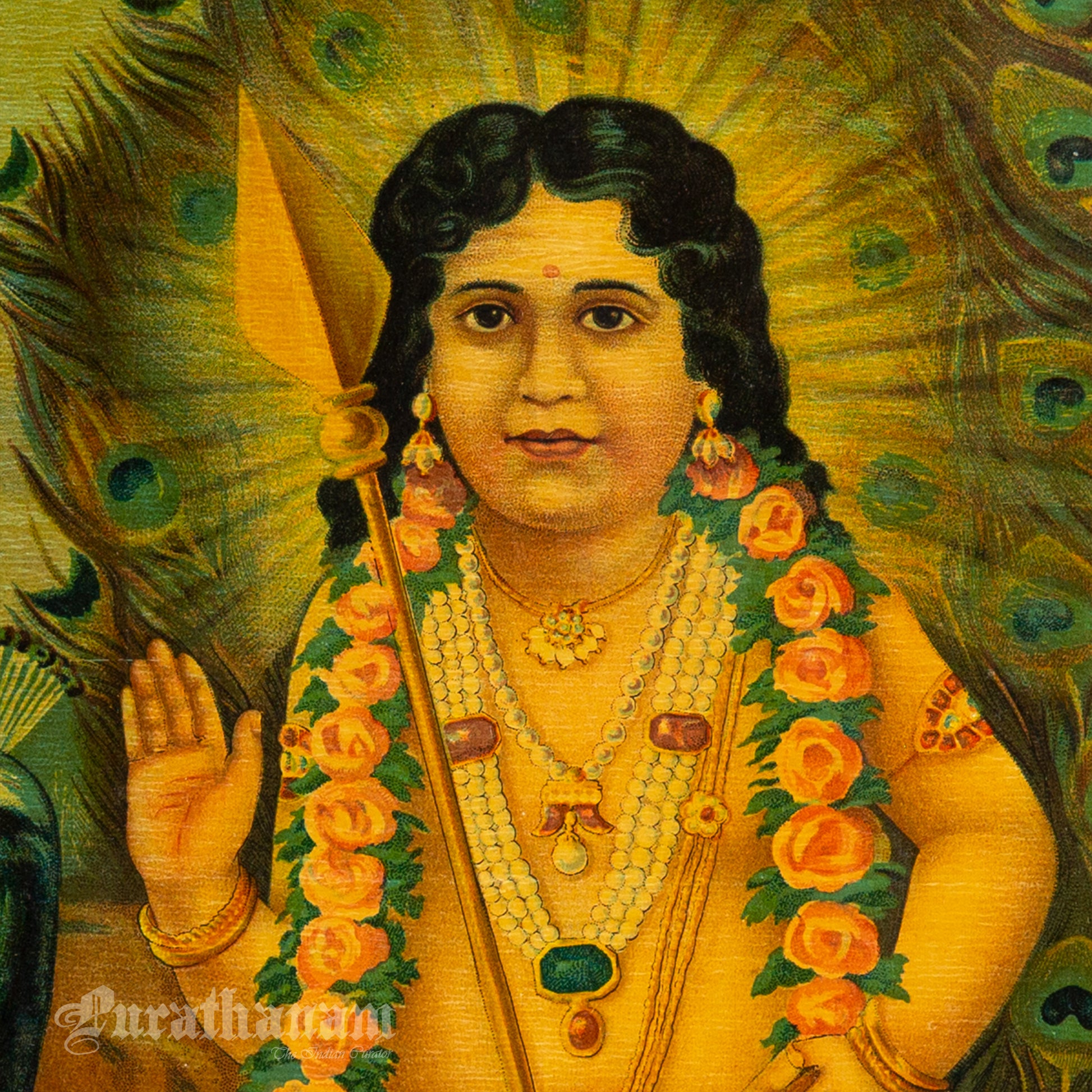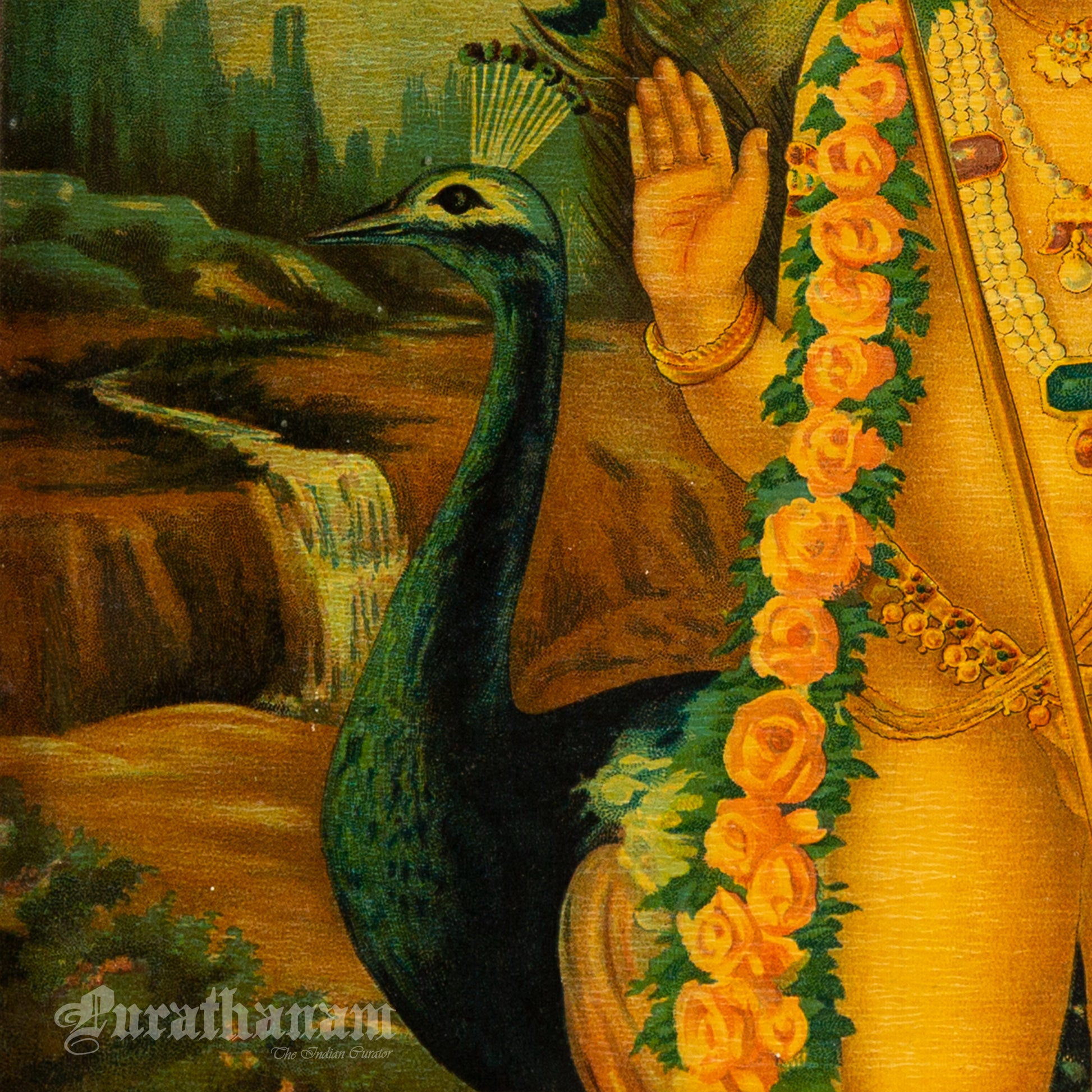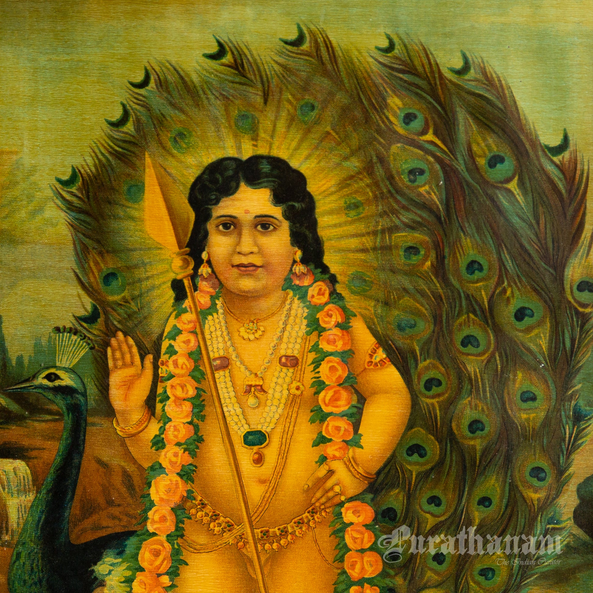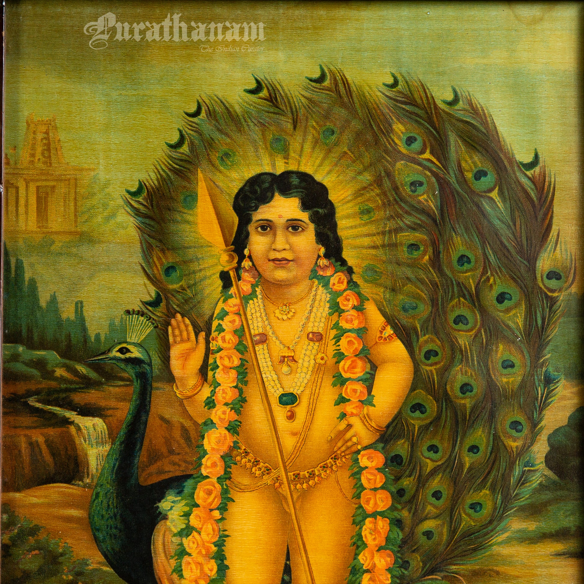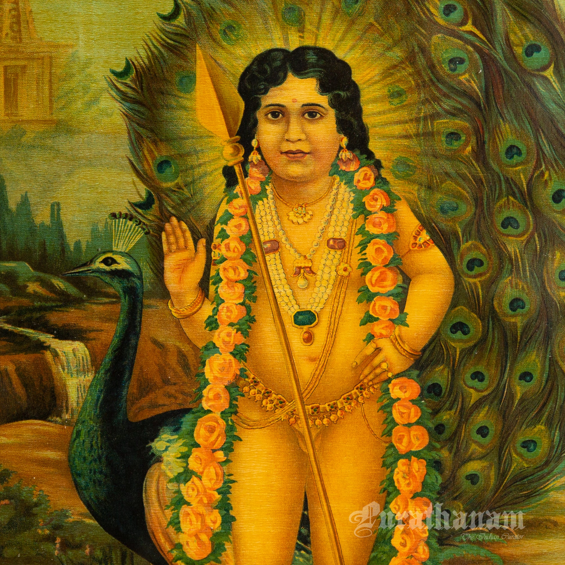 This is an oleograph print of Sri Bala Subrahmanya from Ravi Varma Press, Malavli, Maharashtra. By the late 19th and early 20th centuries, printing presses Ravi Varma Press and K.R.S. Sreenivasaiah & Co. began producing mass devotional prints.