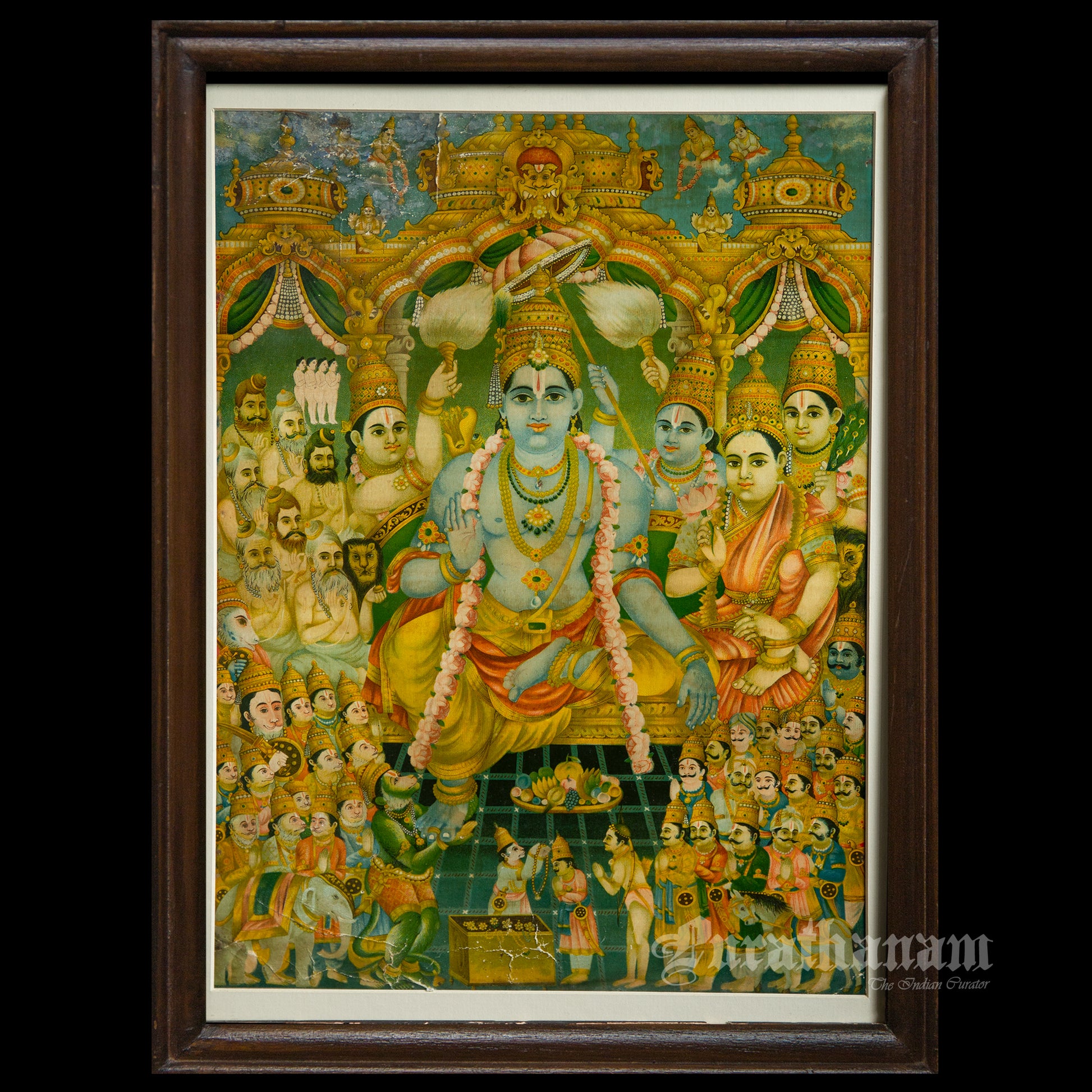 Printed in the early to mid-20th century in Ravi Varma Press, this unsigned oleograph reflects the devotional art style inspired by Raja Ravi Varma’s school. The composition’s delicate shading, expressive figures, and intricate ornamentation evoke the emotional depth and grandeur typical of that golden era of Indian printmaking.