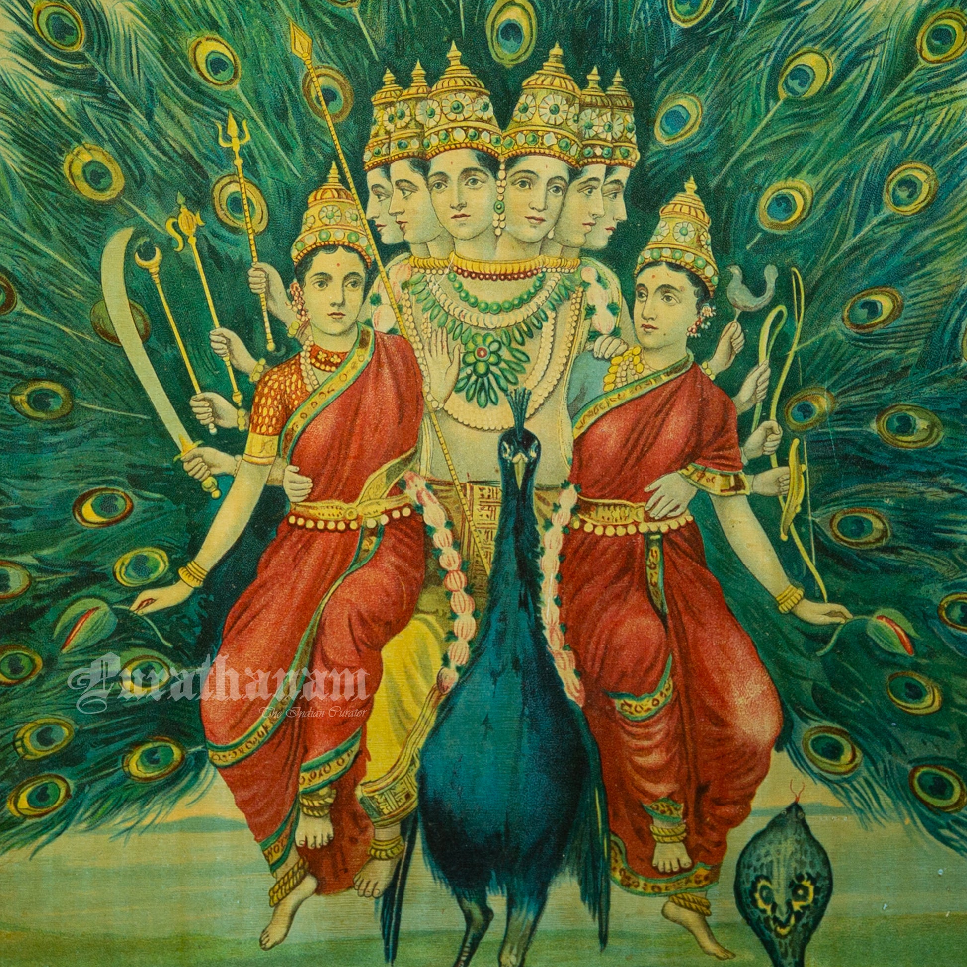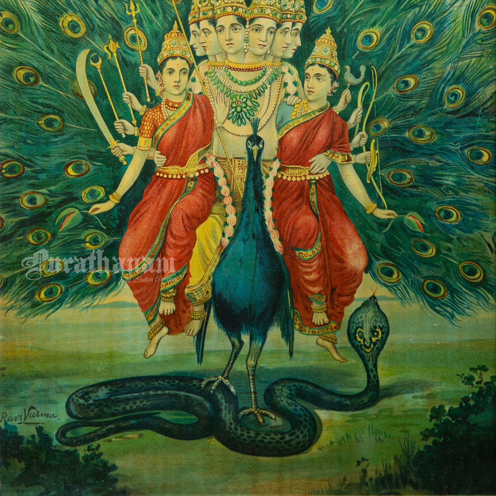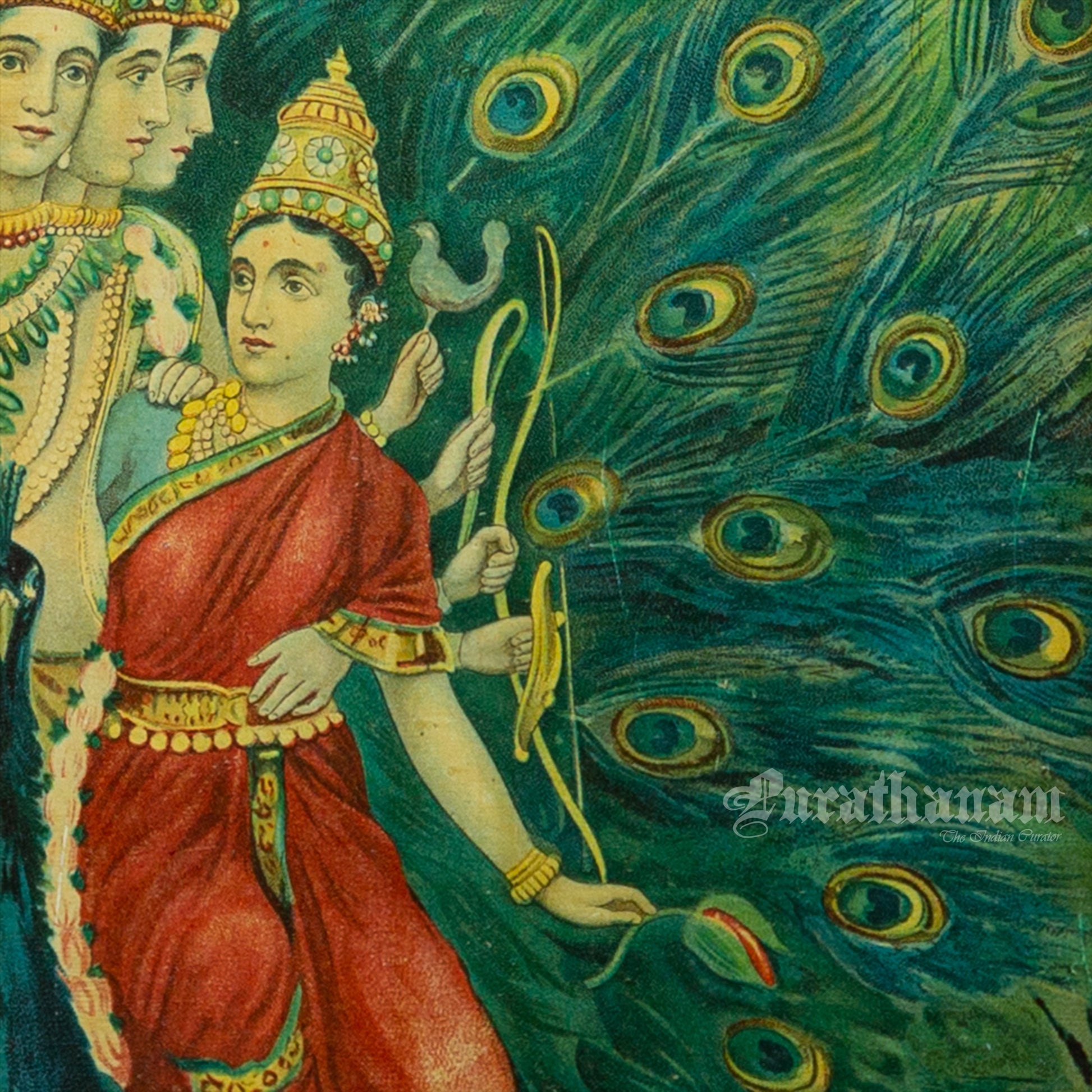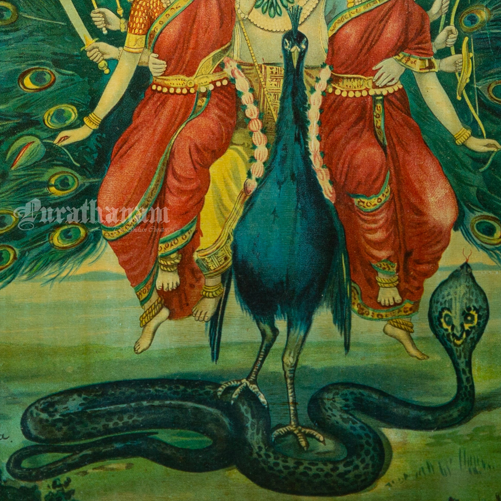 This is an oleograph print from 1920s of Sri Shanmukha Subramaniaswami by Ravi Varma an Indian who achieved recognition for his depiction of scenes from the epics of the Mahabharata and Ramayana.