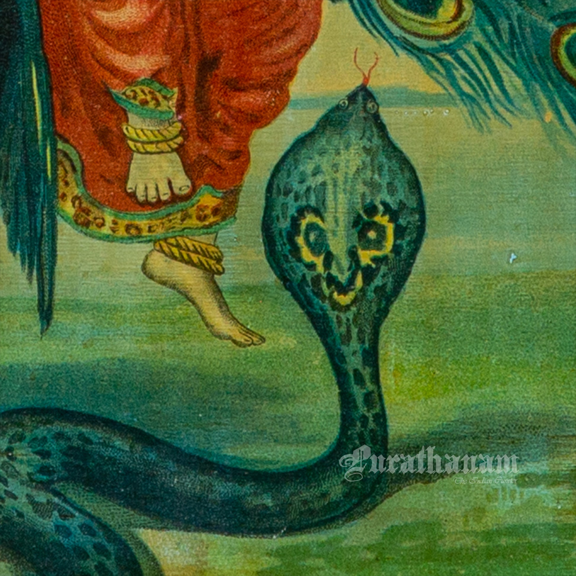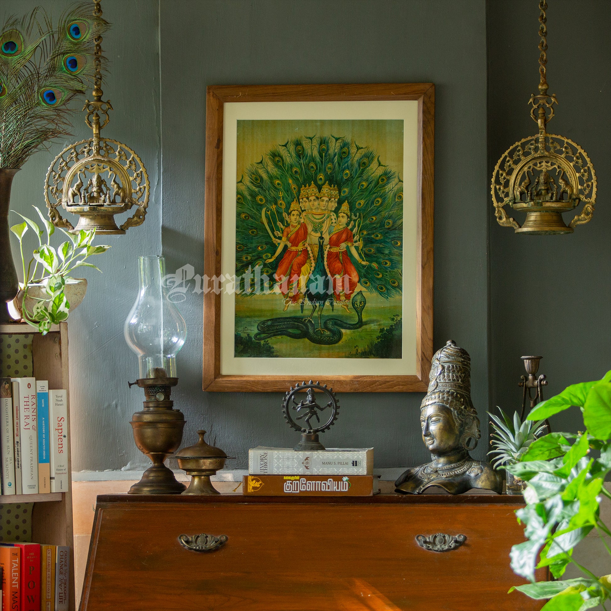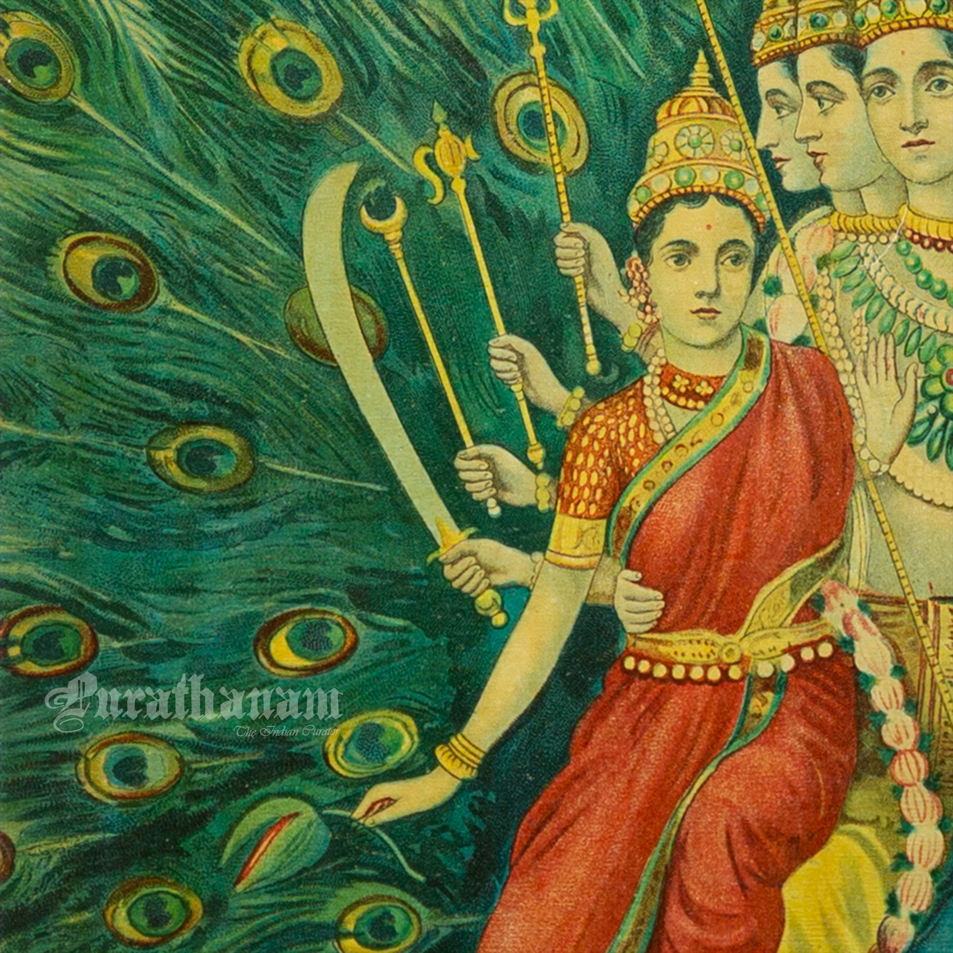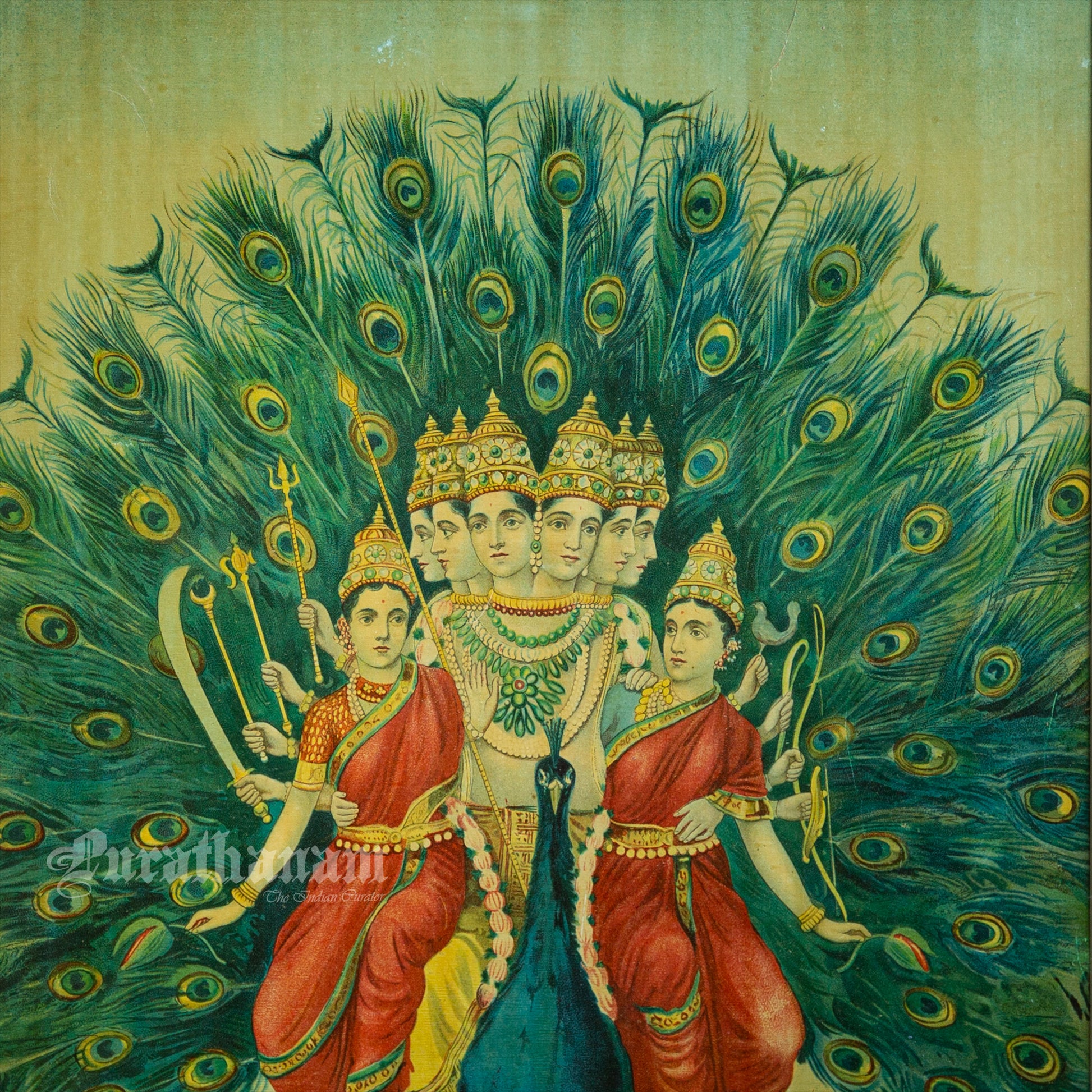 This is an oleograph print from 1920s of Sri Shanmukha Subramaniaswami by Ravi Varma an Indian who achieved recognition for his depiction of scenes from the epics of the Mahabharata and Ramayana.