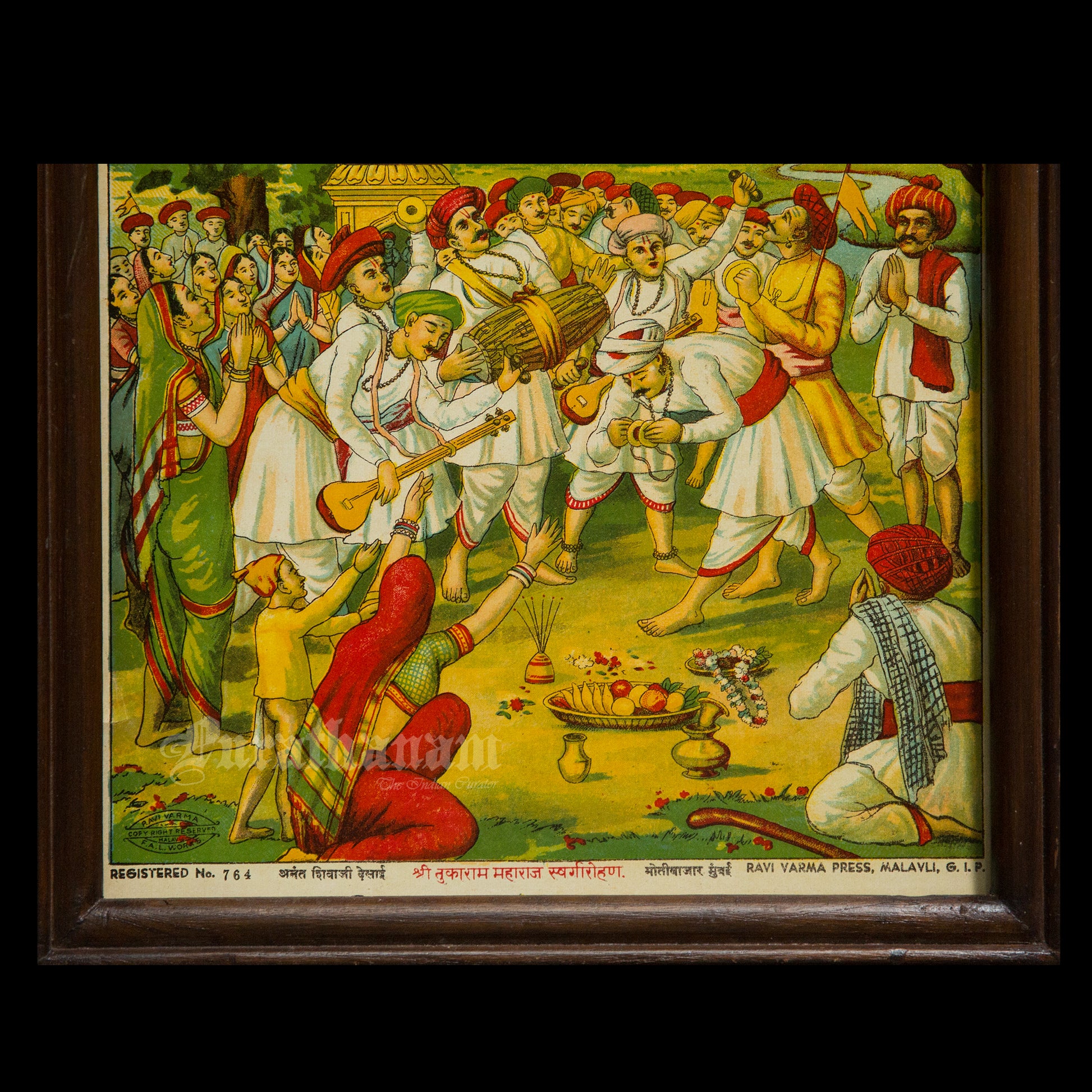 This is an oleograph print from 1920s- 1930s of Shri Tukaram Maharaj Swargarohan by Ravi Varma an Indian painter who achieved recognition for his depiction of scenes from the epics of the Mahabharata and Ramayana.