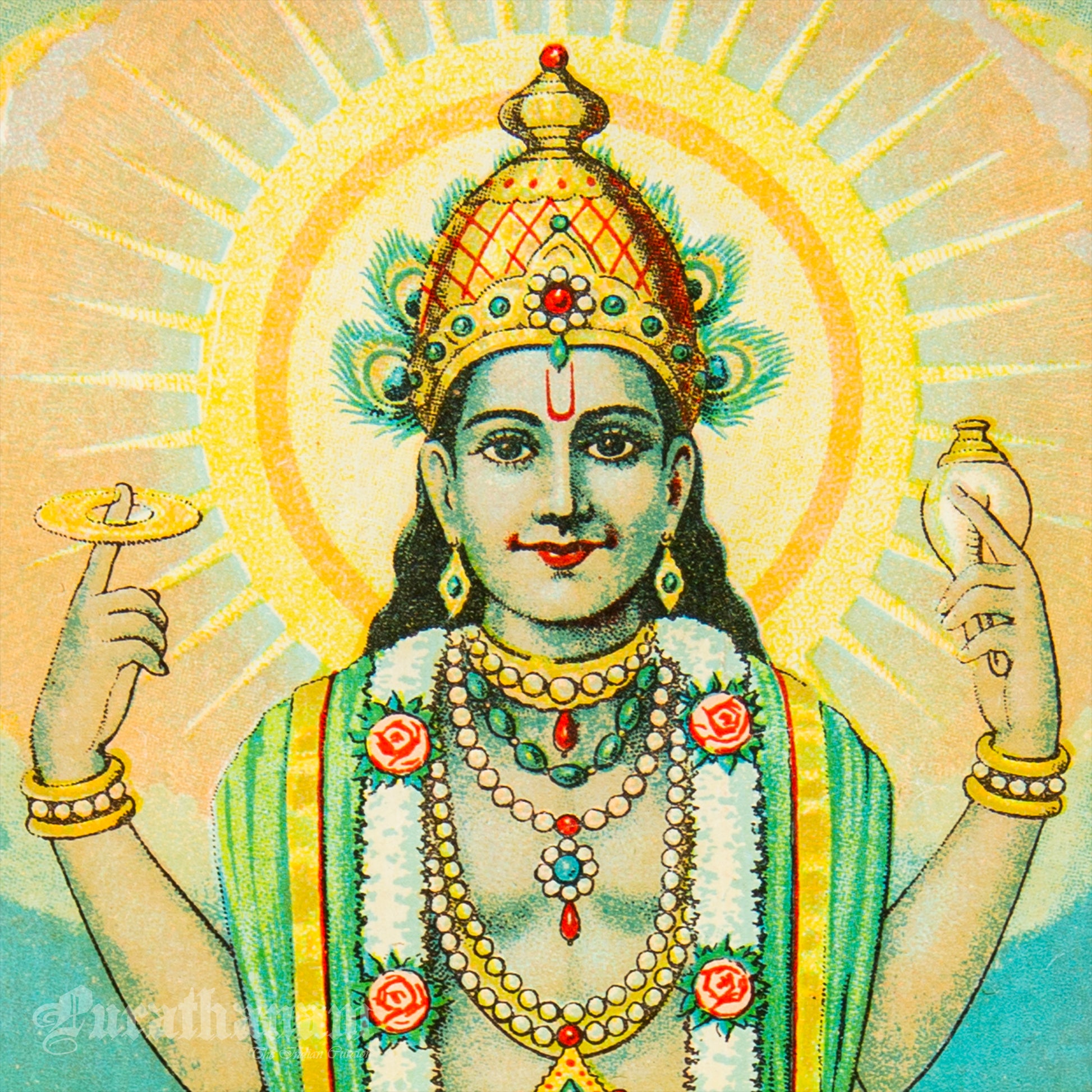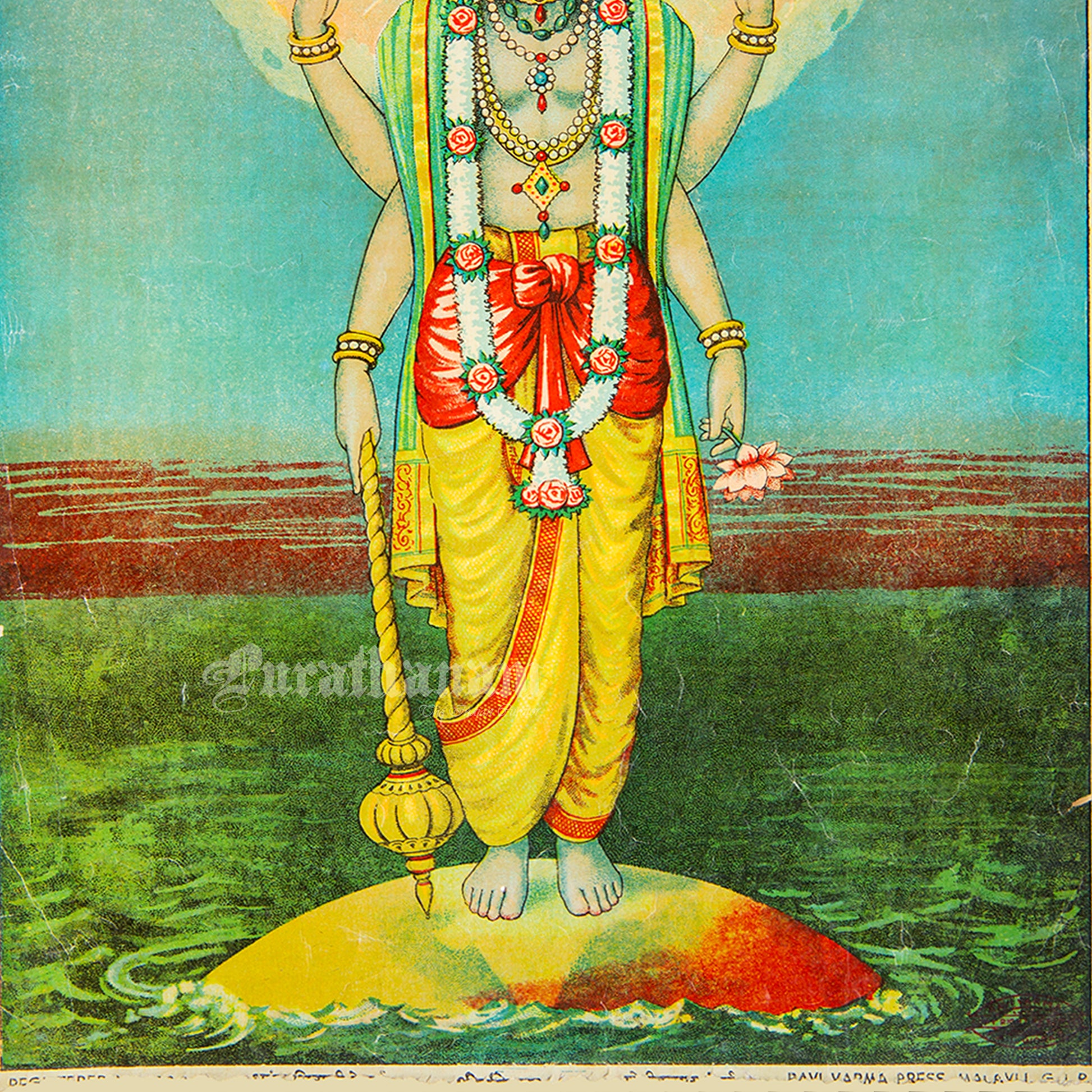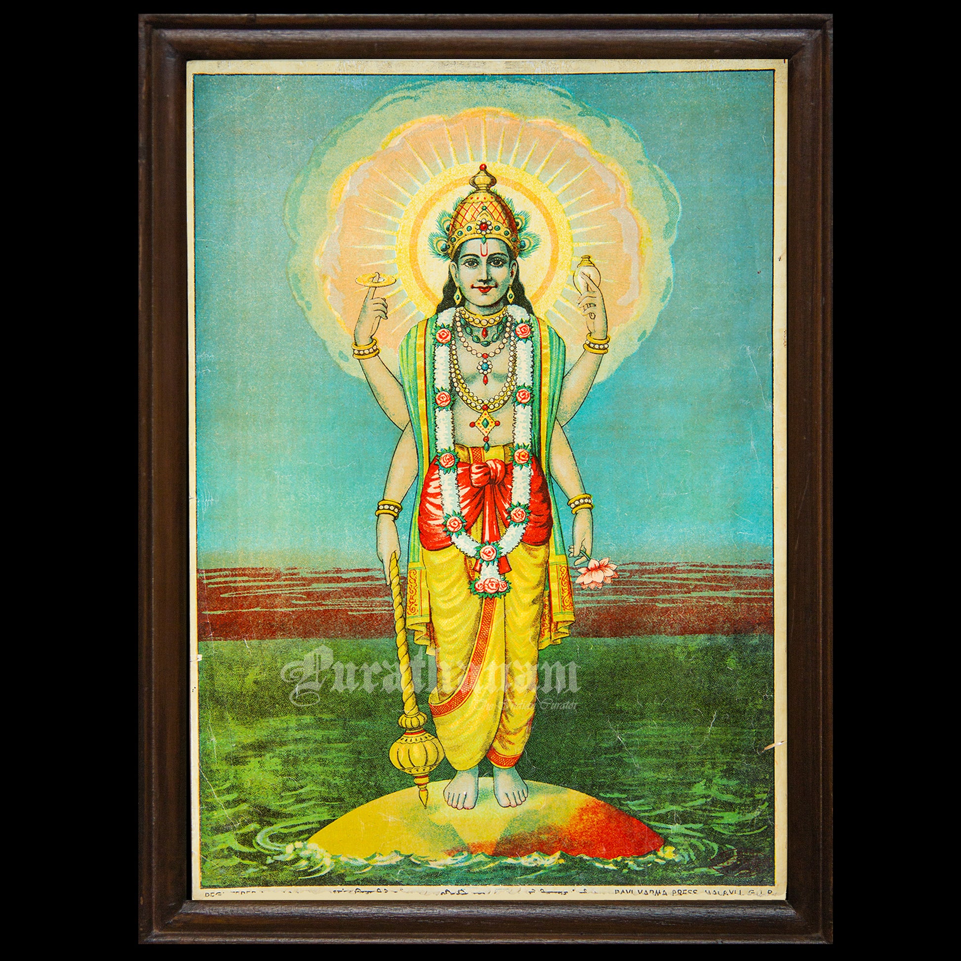 This is an oleograph print from 1920s- 1930s of Sri Vishnu by Ravi Varma an Indian painter who achieved recognition for his depiction of scenes from the epics of the Mahabharata and Ramayana.