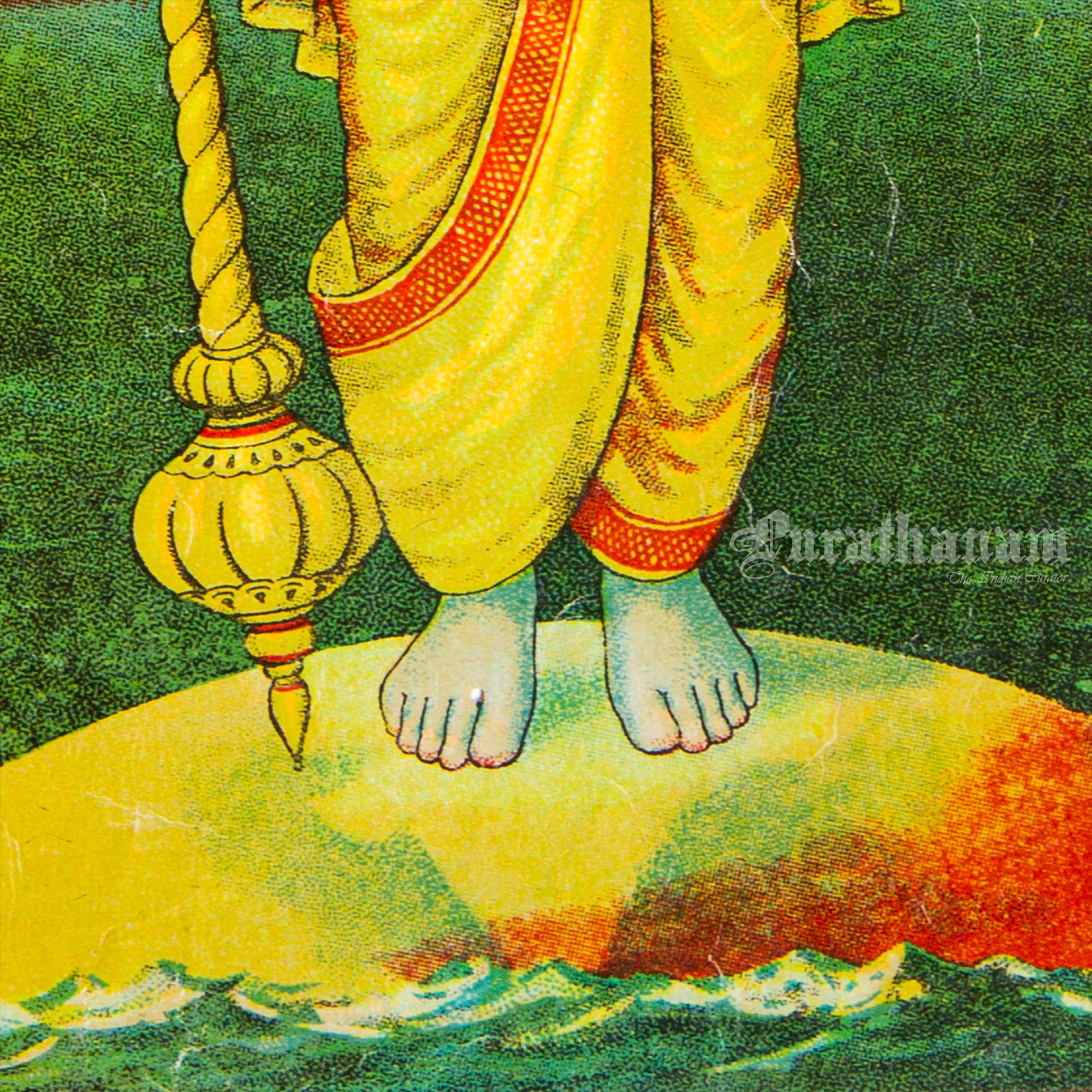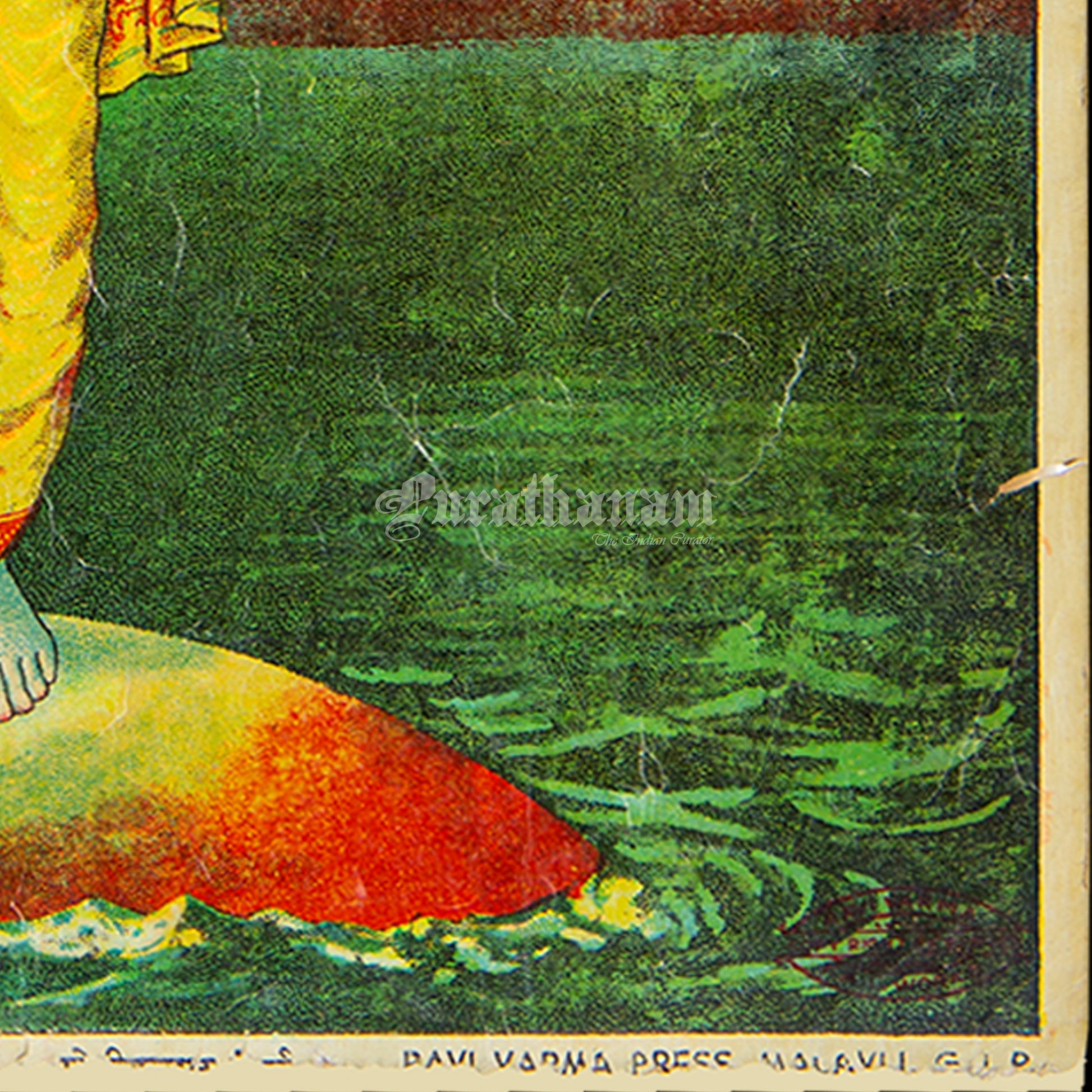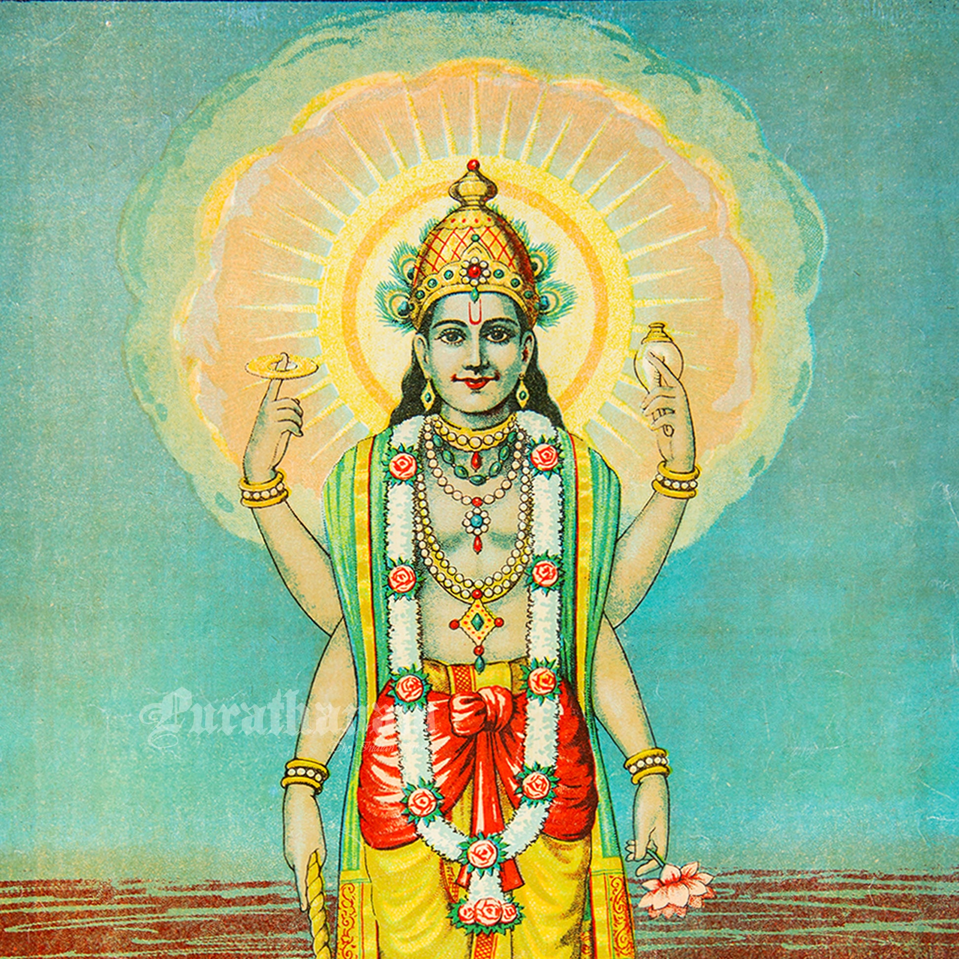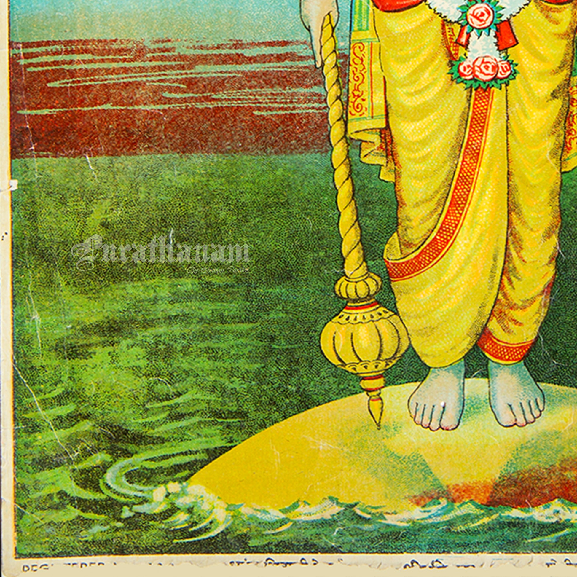 This is an oleograph print from 1920s- 1930s of Sri Vishnu by Ravi Varma an Indian painter who achieved recognition for his depiction of scenes from the epics of the Mahabharata and Ramayana.