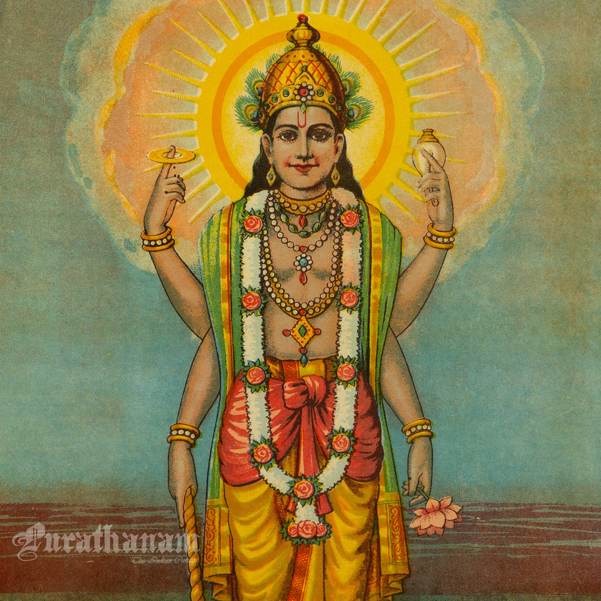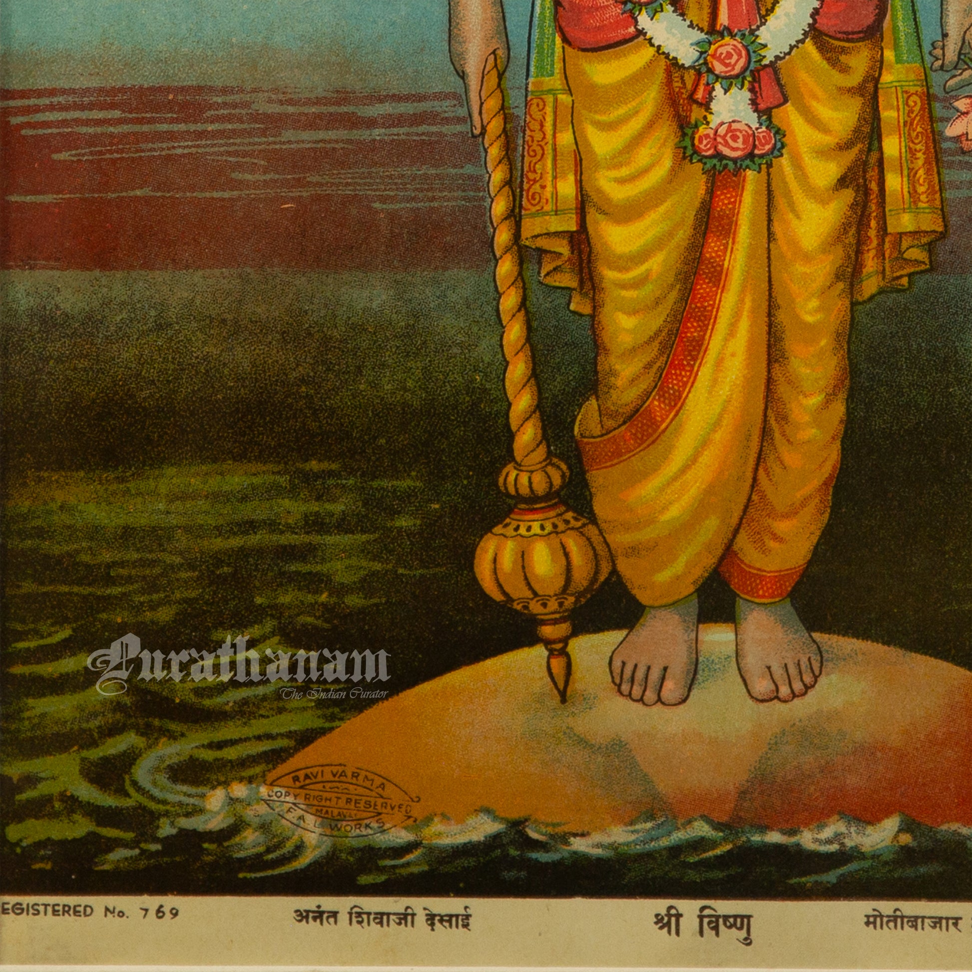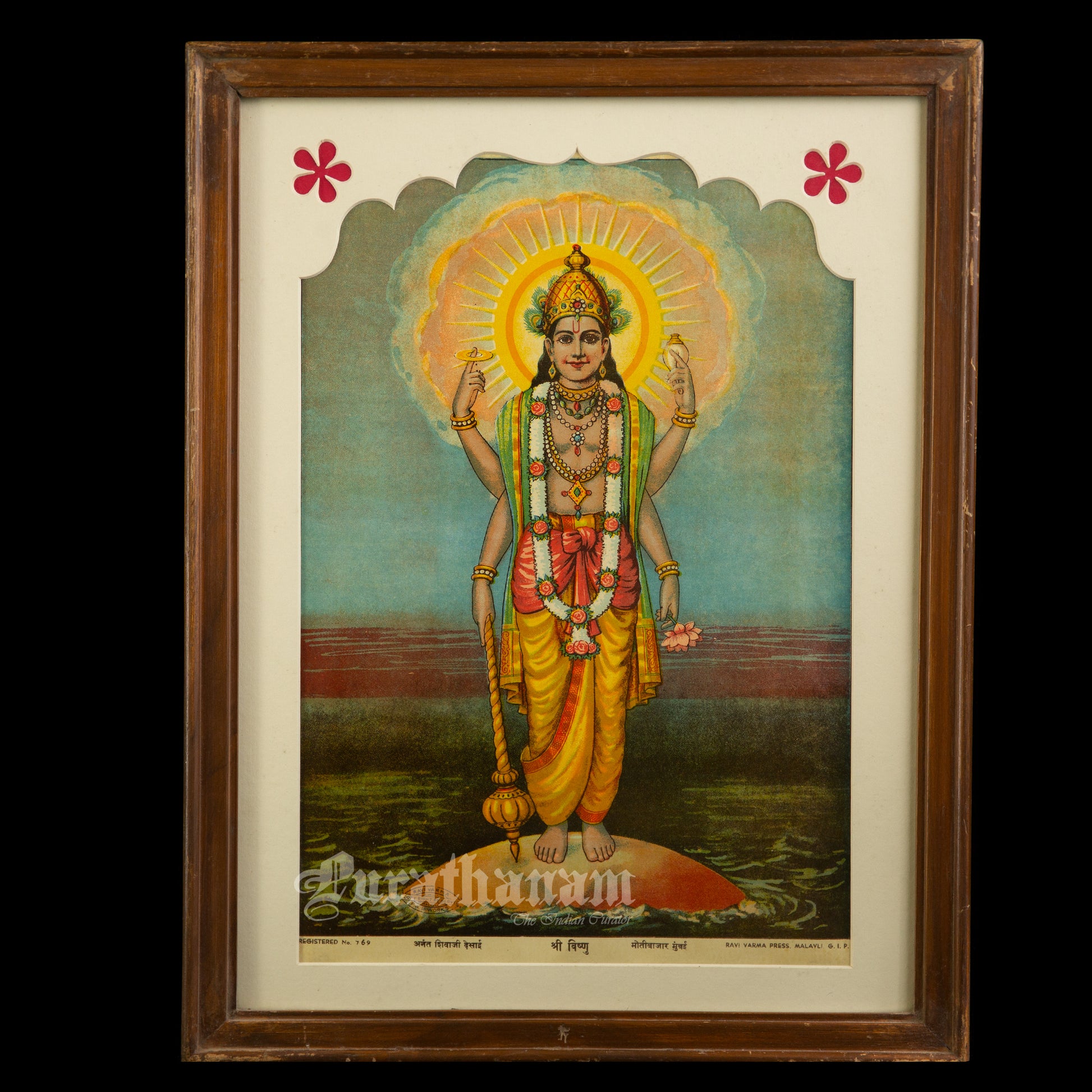 This is an oleograph print from early 1900s of Sri Vishnu by Ravi Varma an Indian painter who achieved recognition for his depiction of scenes from the epics of the Mahabharata and Ramayana.