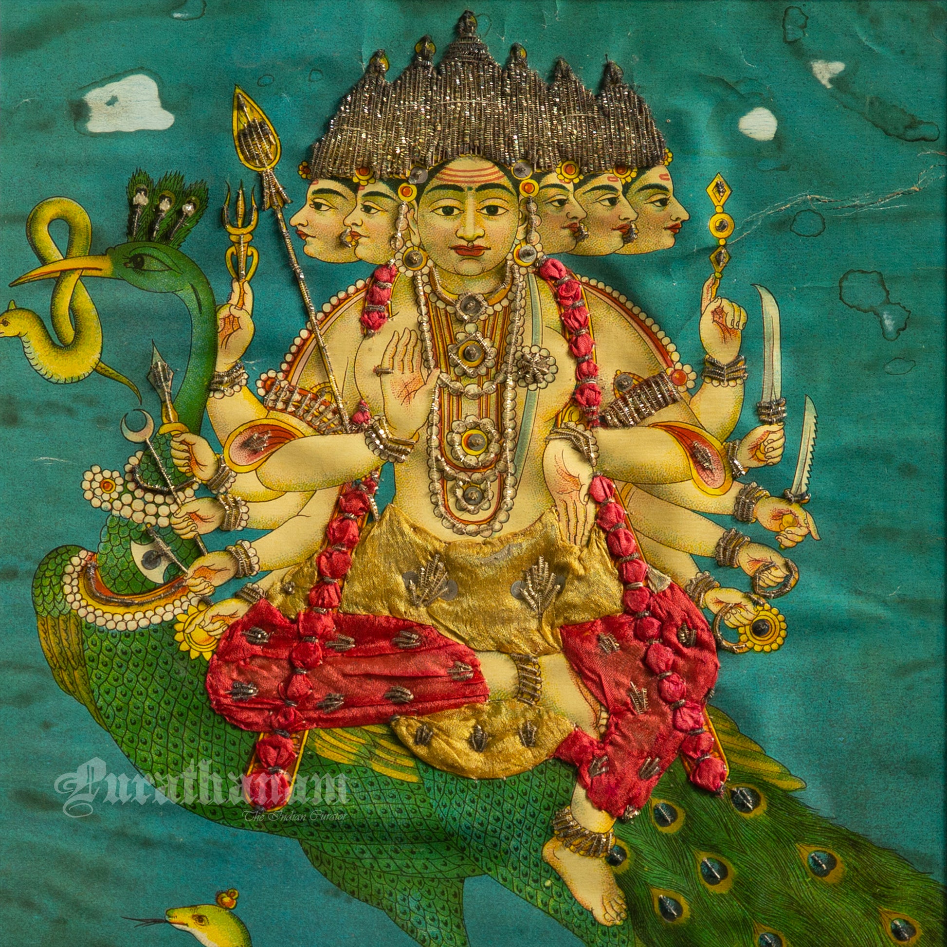 This is an oleograph print from 1920s of Subrahmanya by Ravi Varma an Indian who achieved recognition for his depiction of scenes from the epics of the Mahabharata and Ramayana.