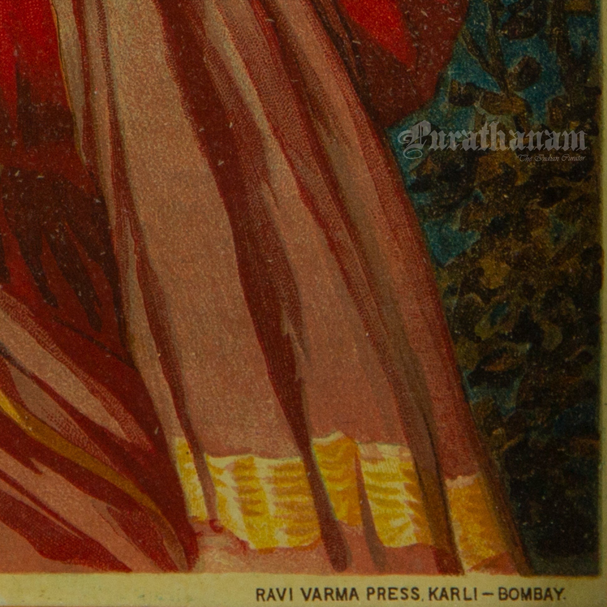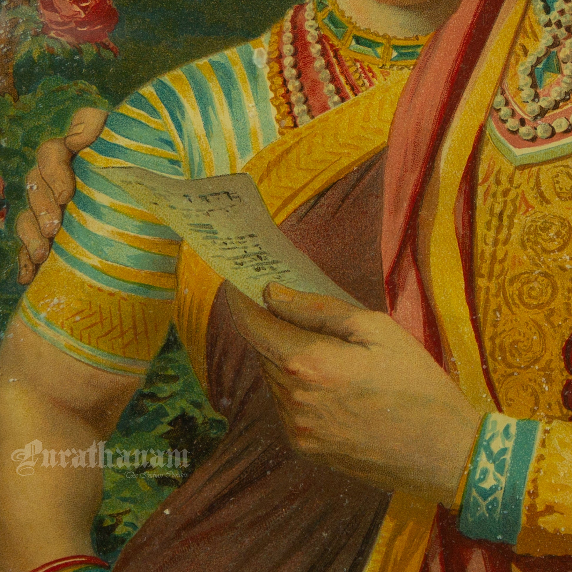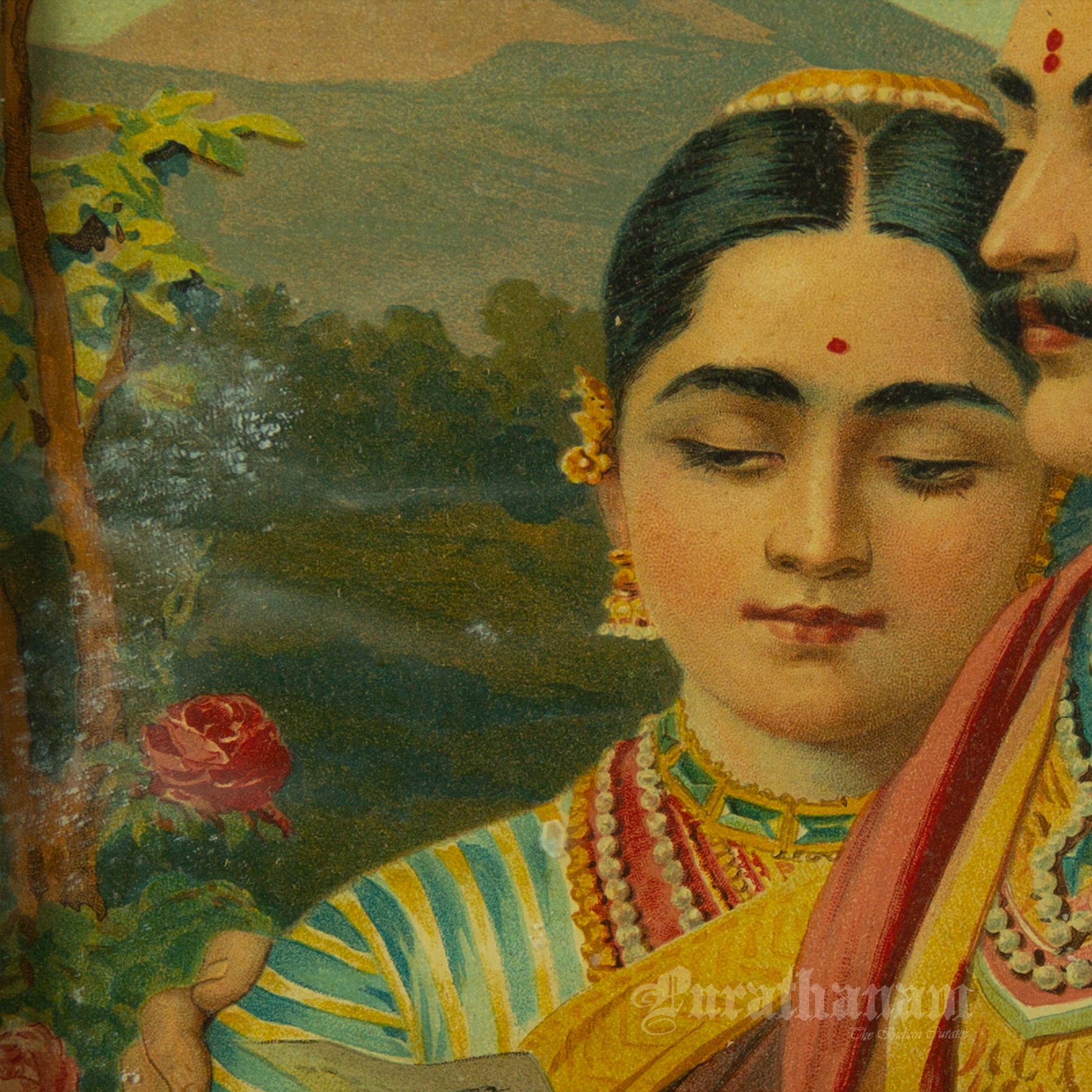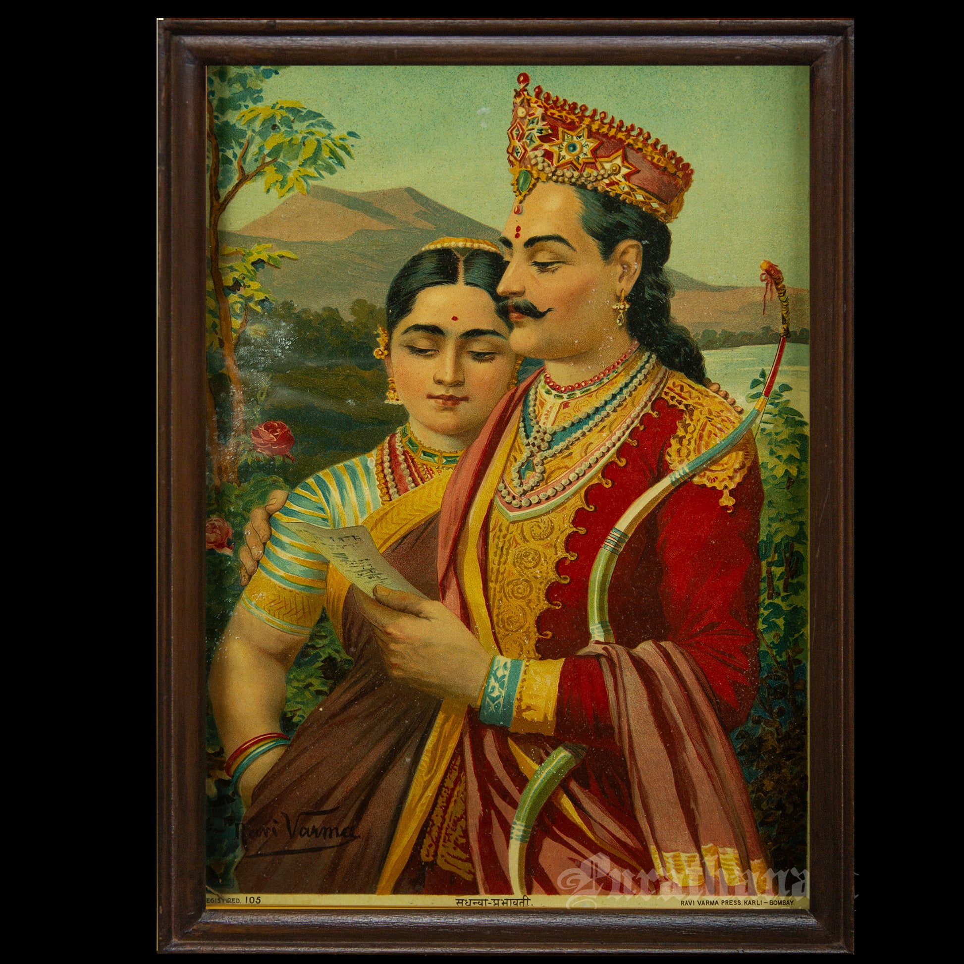 This is an oleograph print from 1920s of Sudhanwa Prabhawati by Ravi Varma an Indian who achieved recognition for his depiction of scenes from the epics of the Mahabharata and Ramayana.