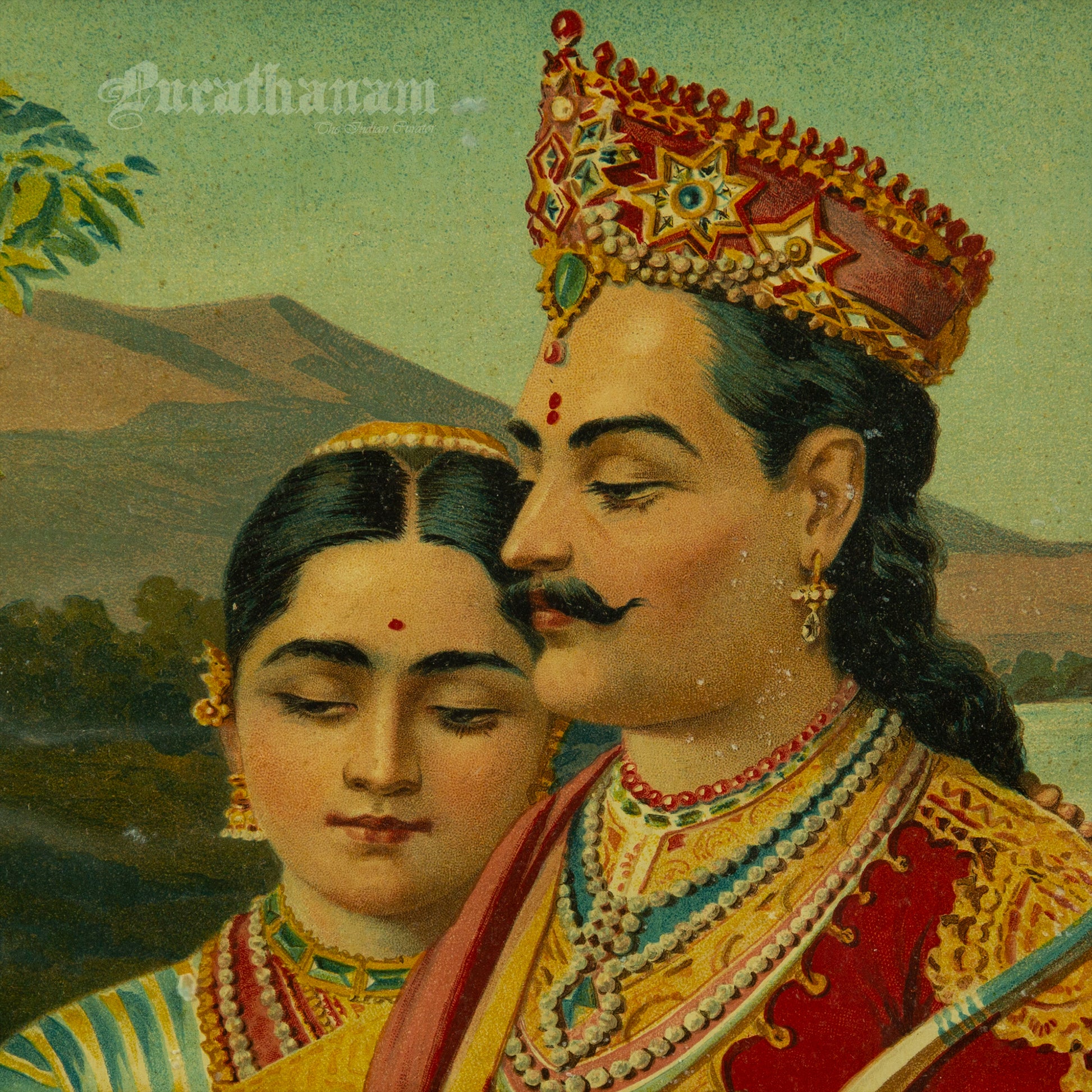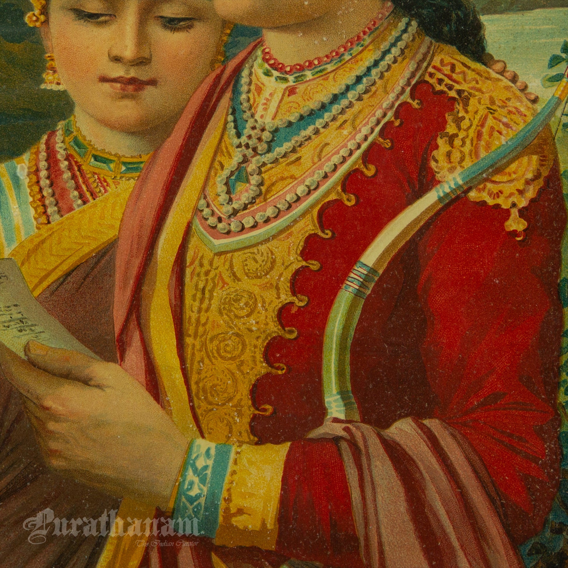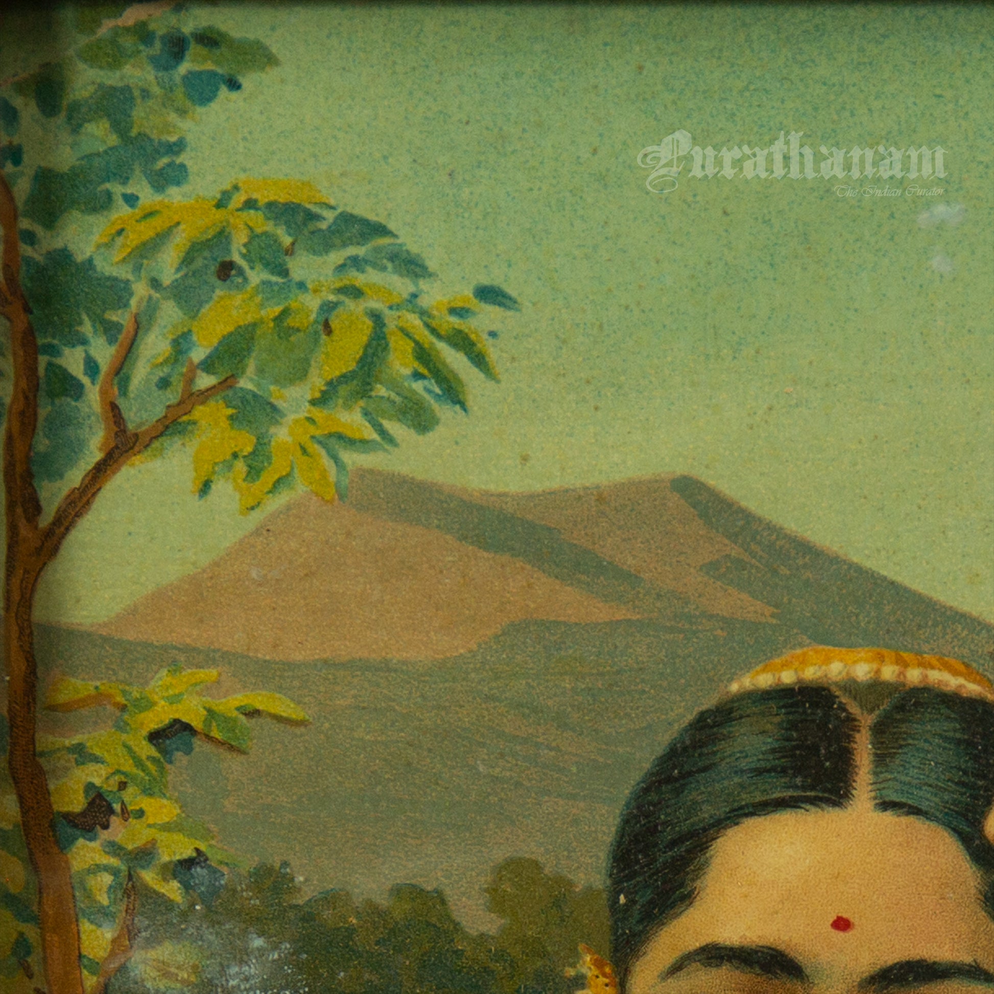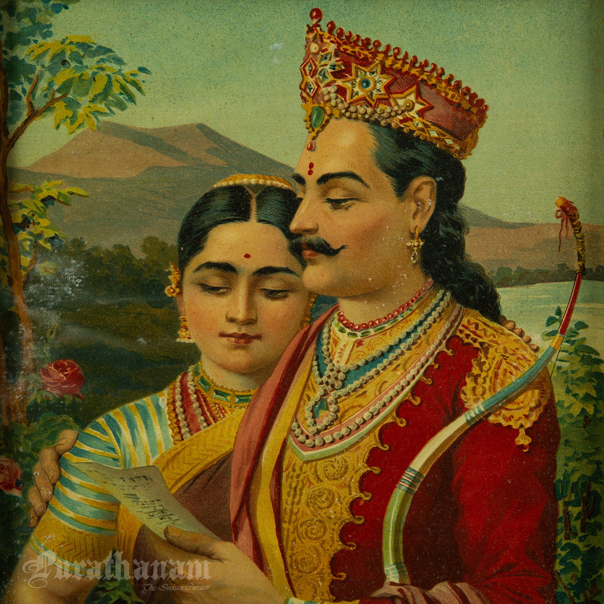 This is an oleograph print from 1920s of Sudhanwa Prabhawati by Ravi Varma an Indian who achieved recognition for his depiction of scenes from the epics of the Mahabharata and Ramayana.