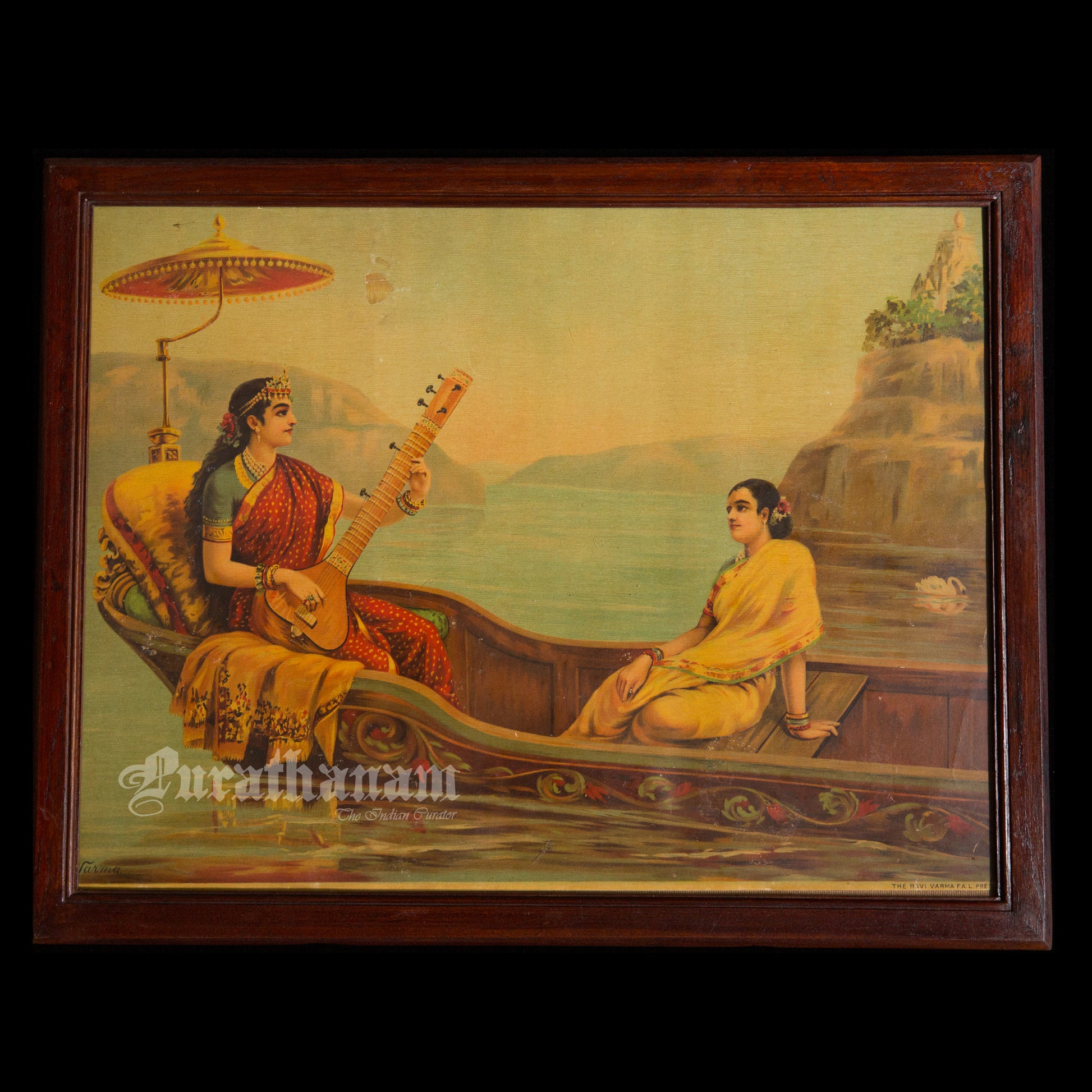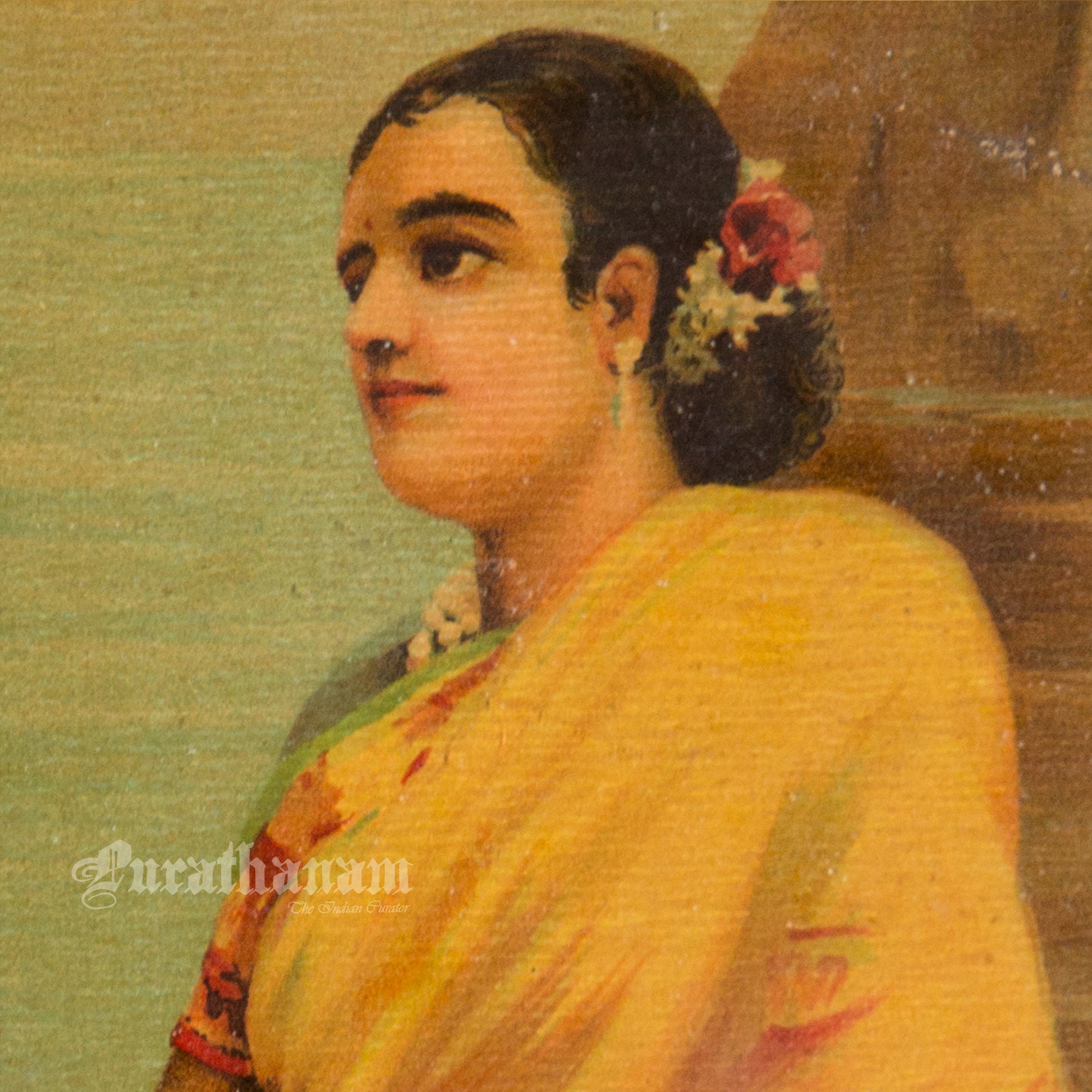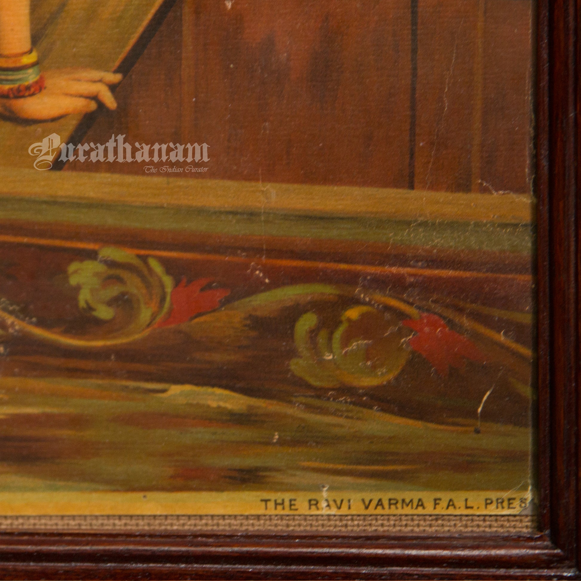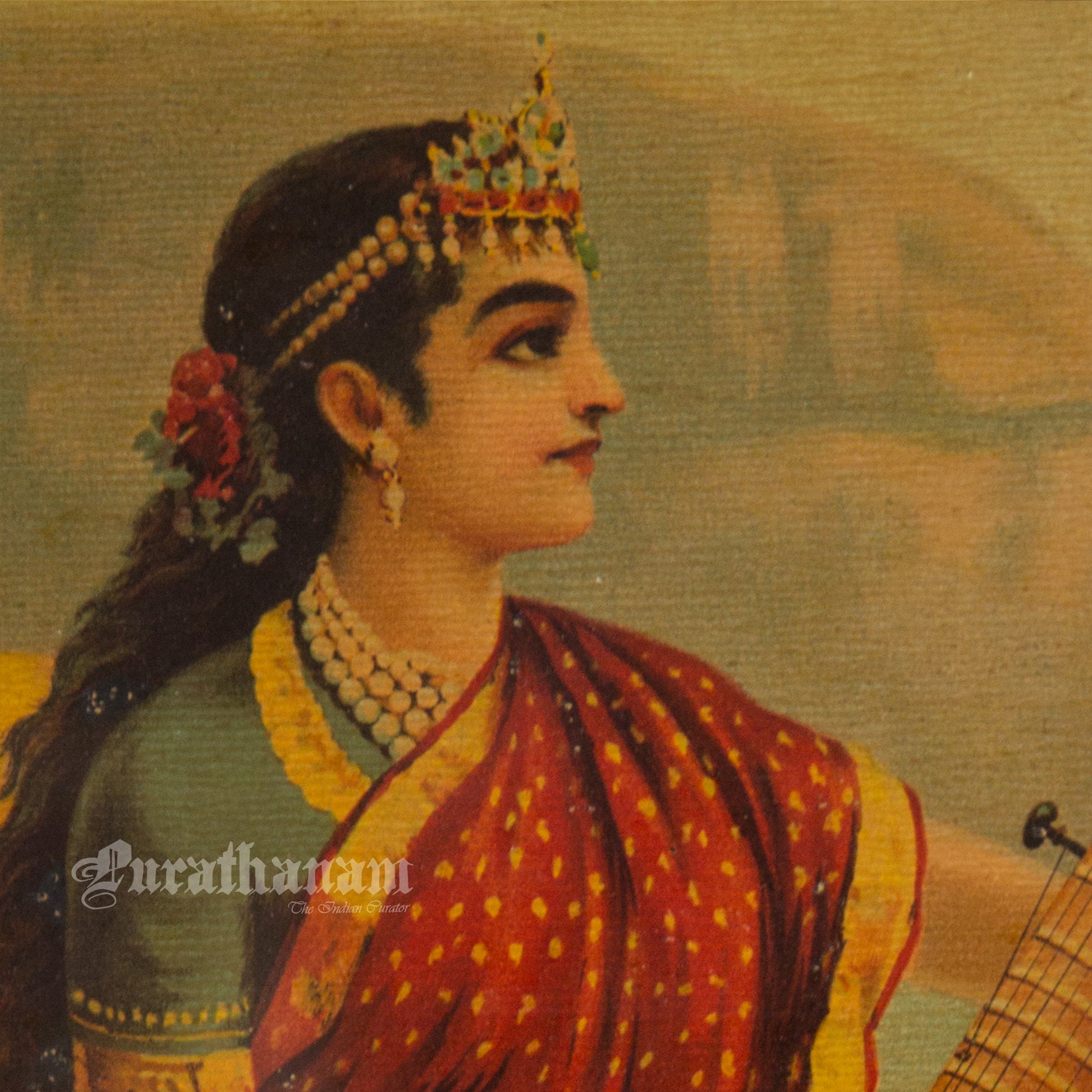 This is an oleograph print from 1890s of Tara Devi by Ravi Varma by Ravi Varma an Indian painter who achieved recognition for his depiction of scenes from the epics of the Mahabharata and Ramayana.