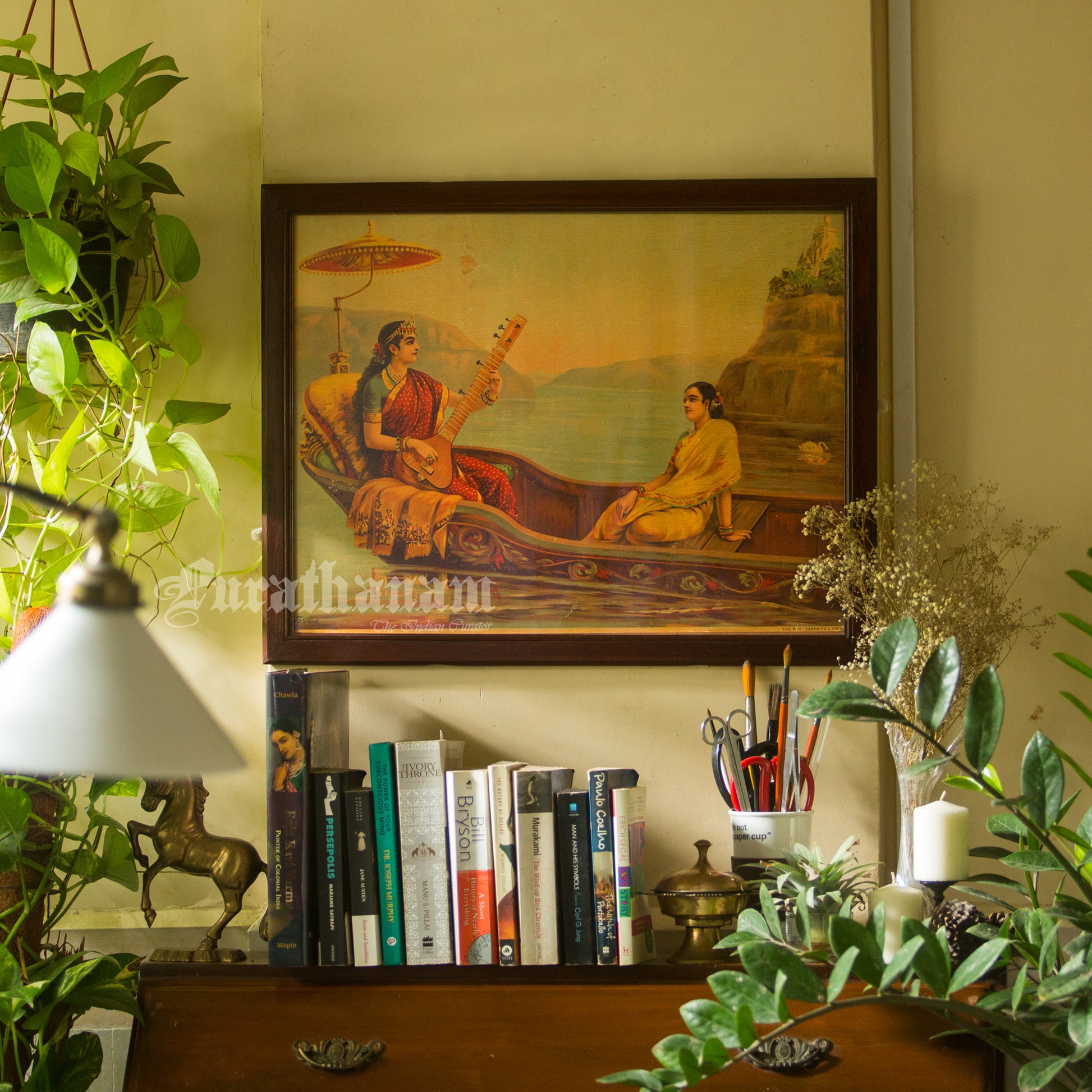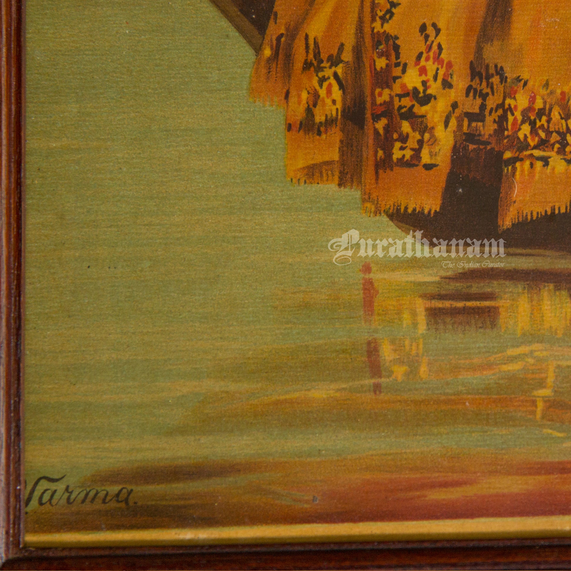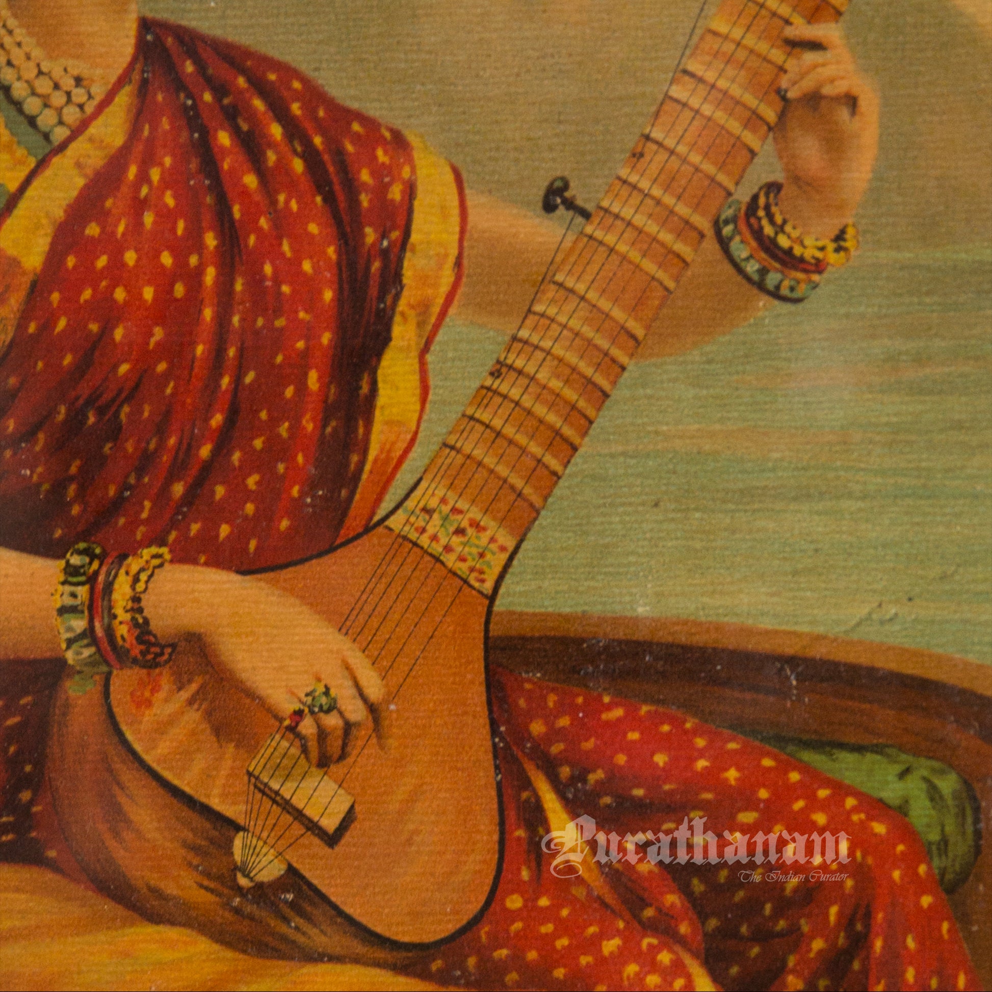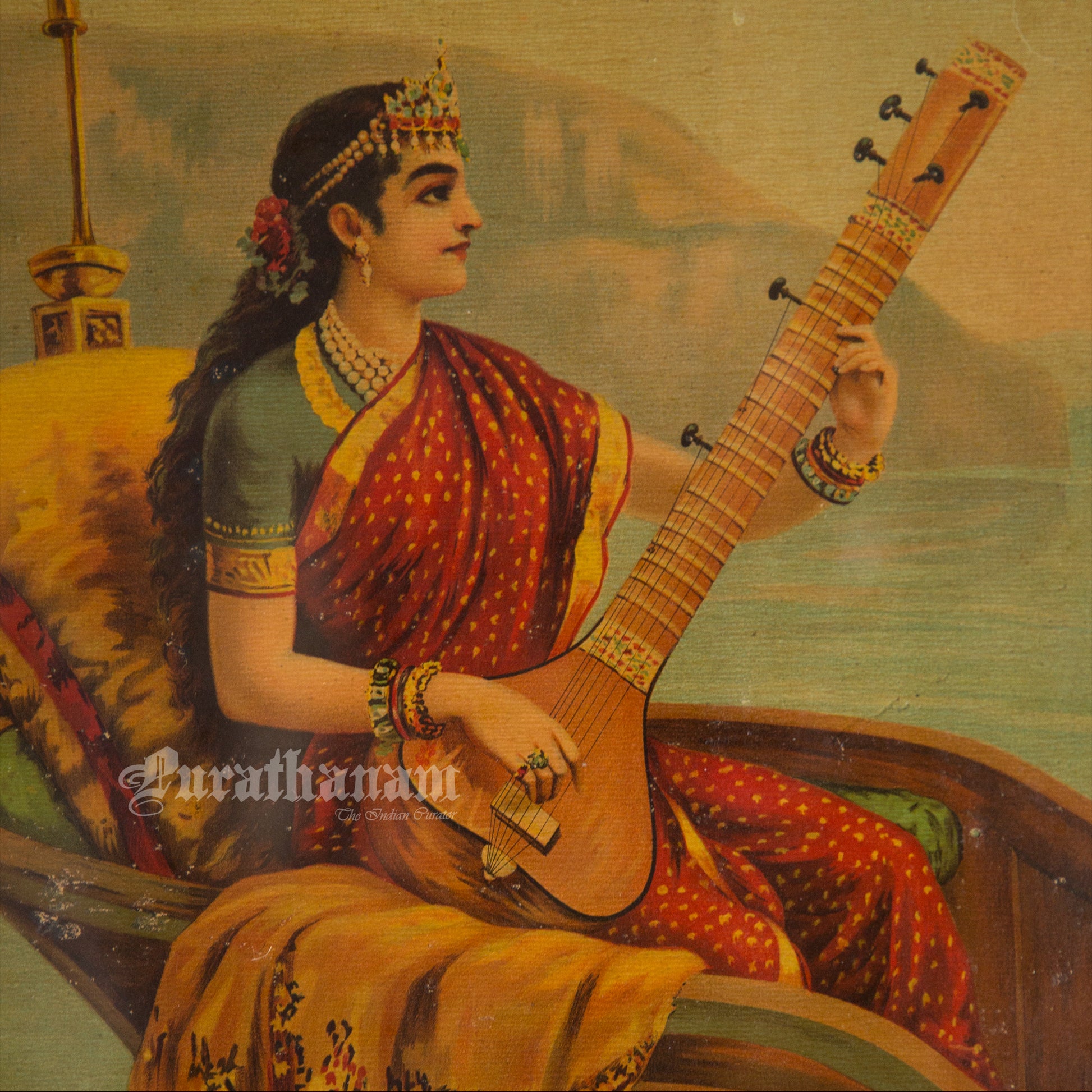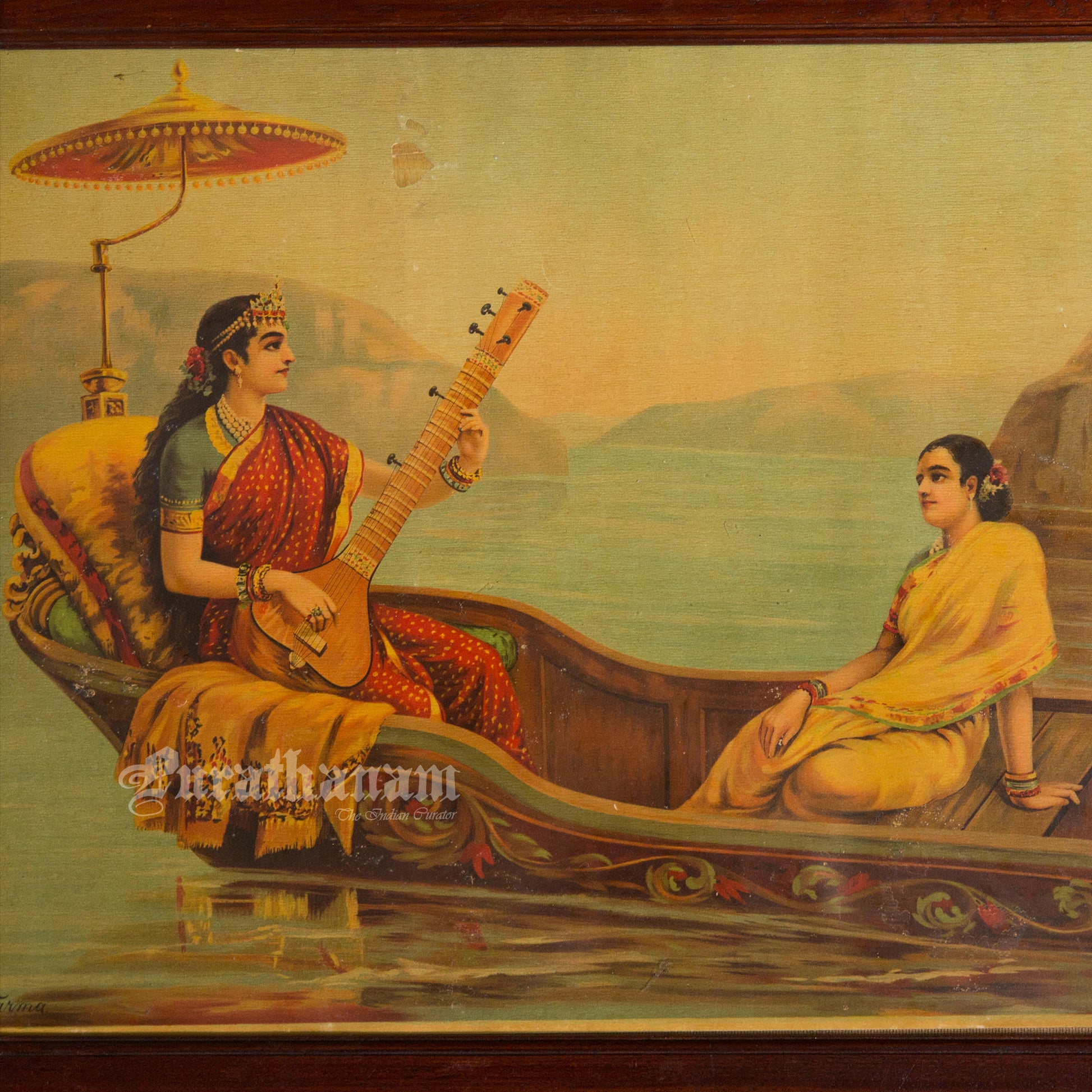 This is an oleograph print from 1890s of Tara Devi by Ravi Varma by Ravi Varma an Indian painter who achieved recognition for his depiction of scenes from the epics of the Mahabharata and Ramayana.