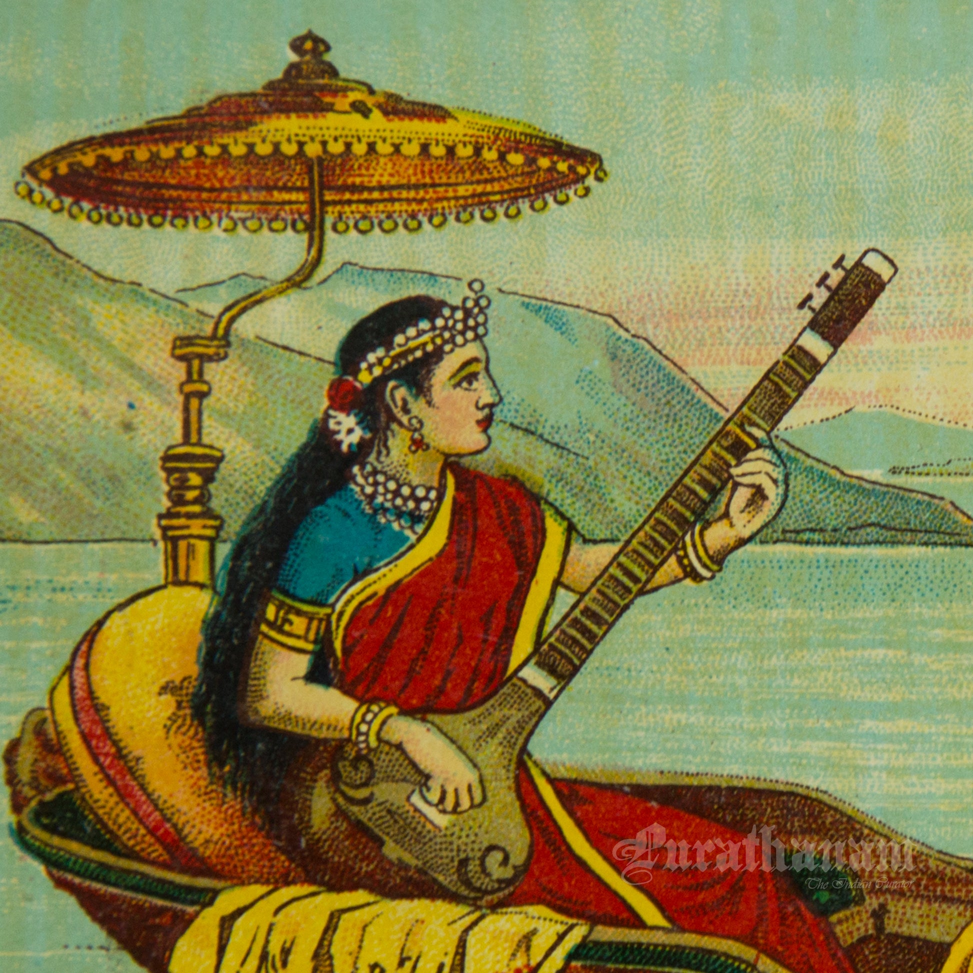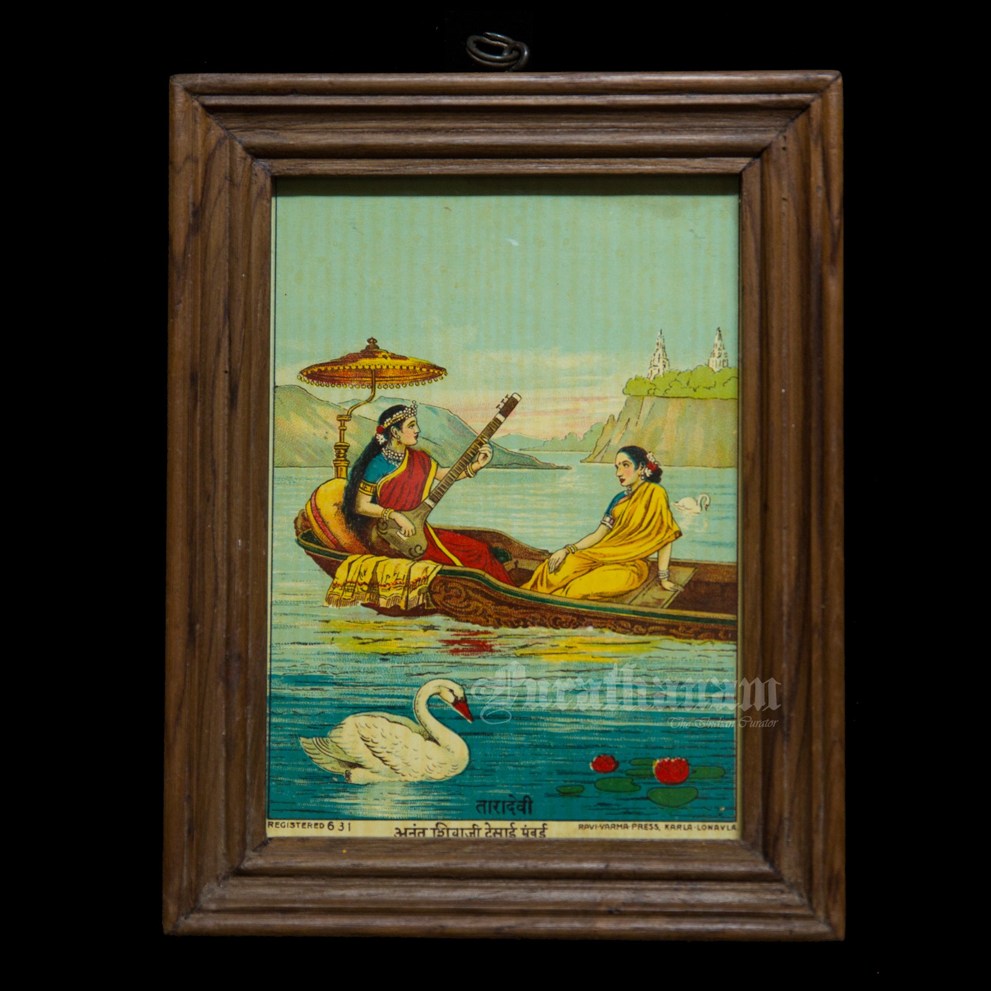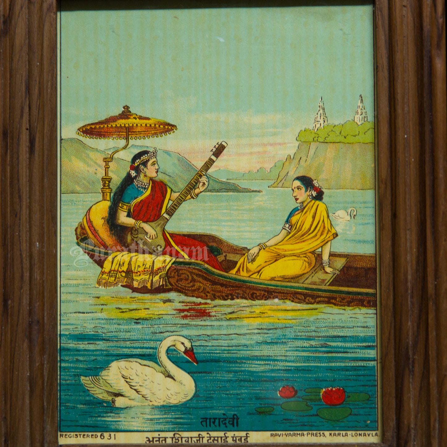 This is an oleograph print from 1890s of Tara Devi by Ravi Varma by Ravi Varma an Indian painter who achieved recognition for his depiction of scenes from the epics of the Mahabharata and Ramayana.