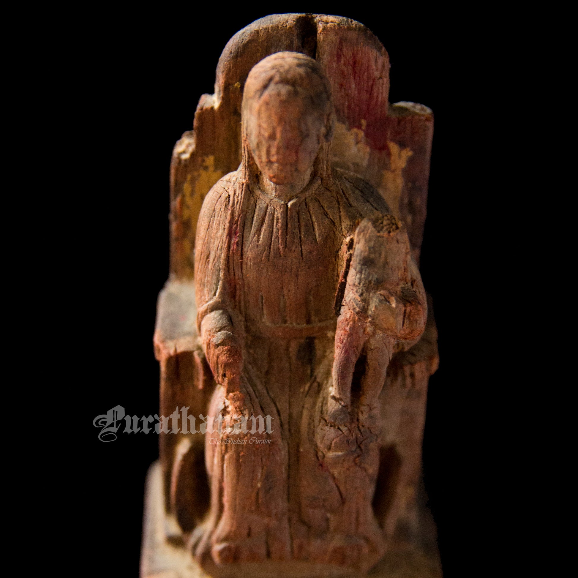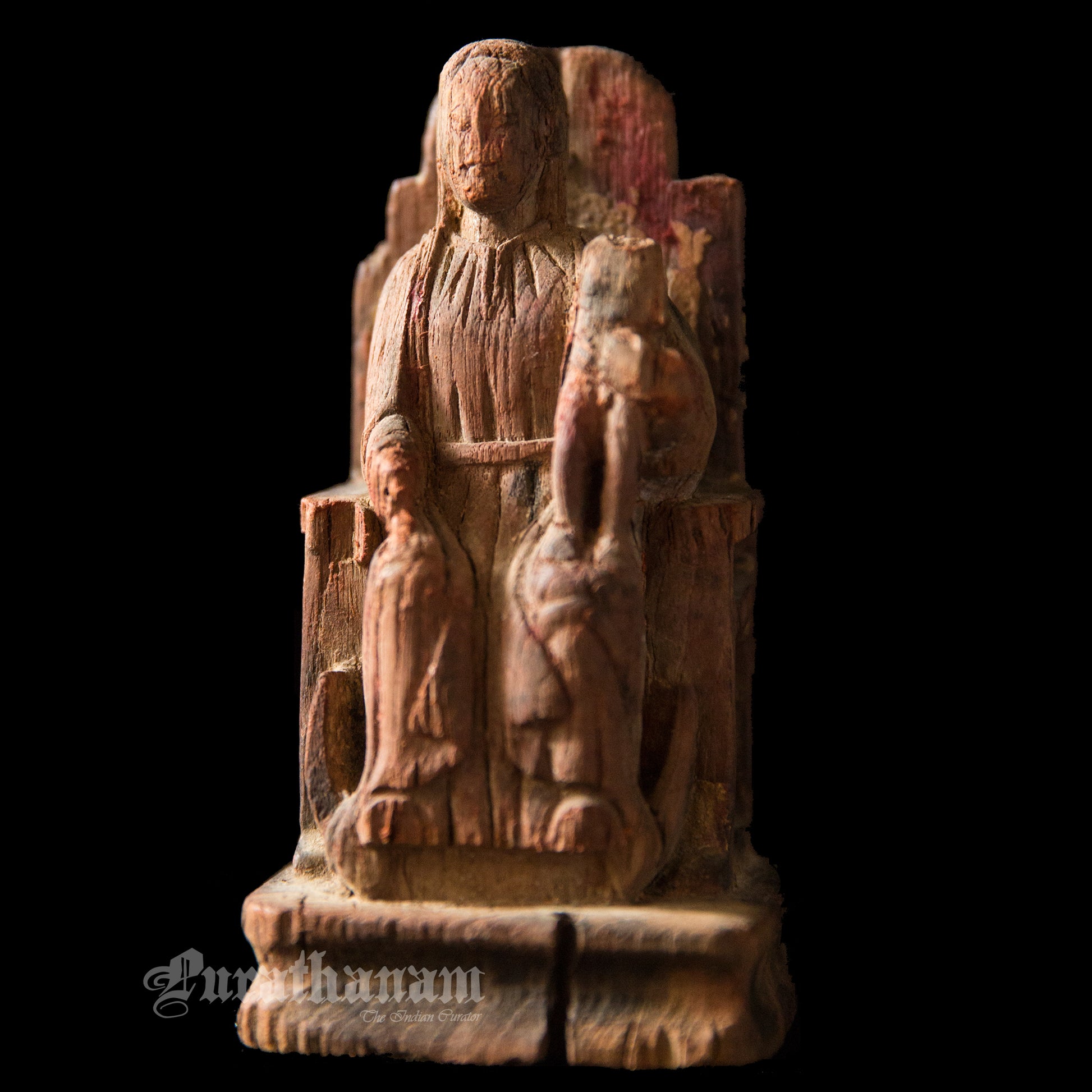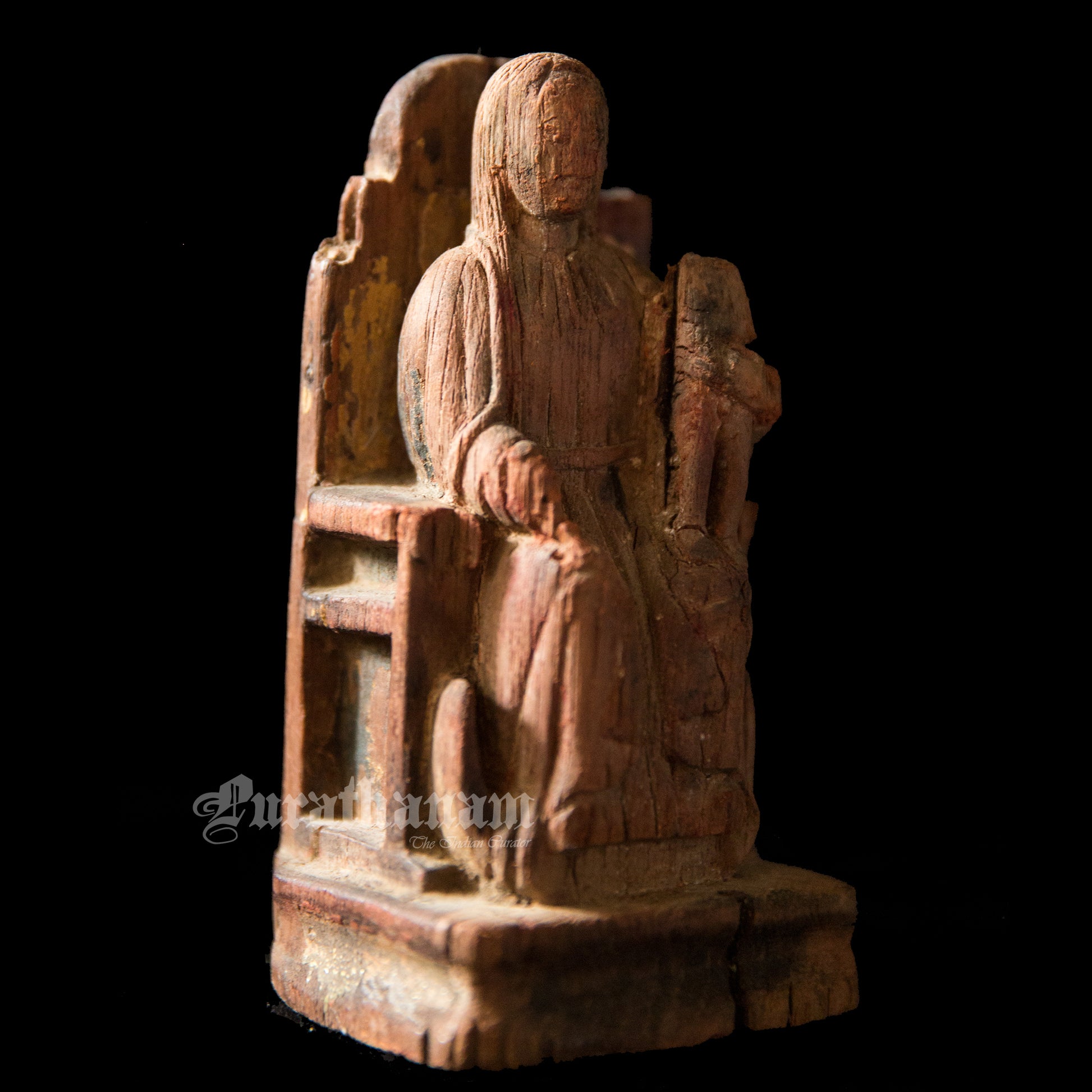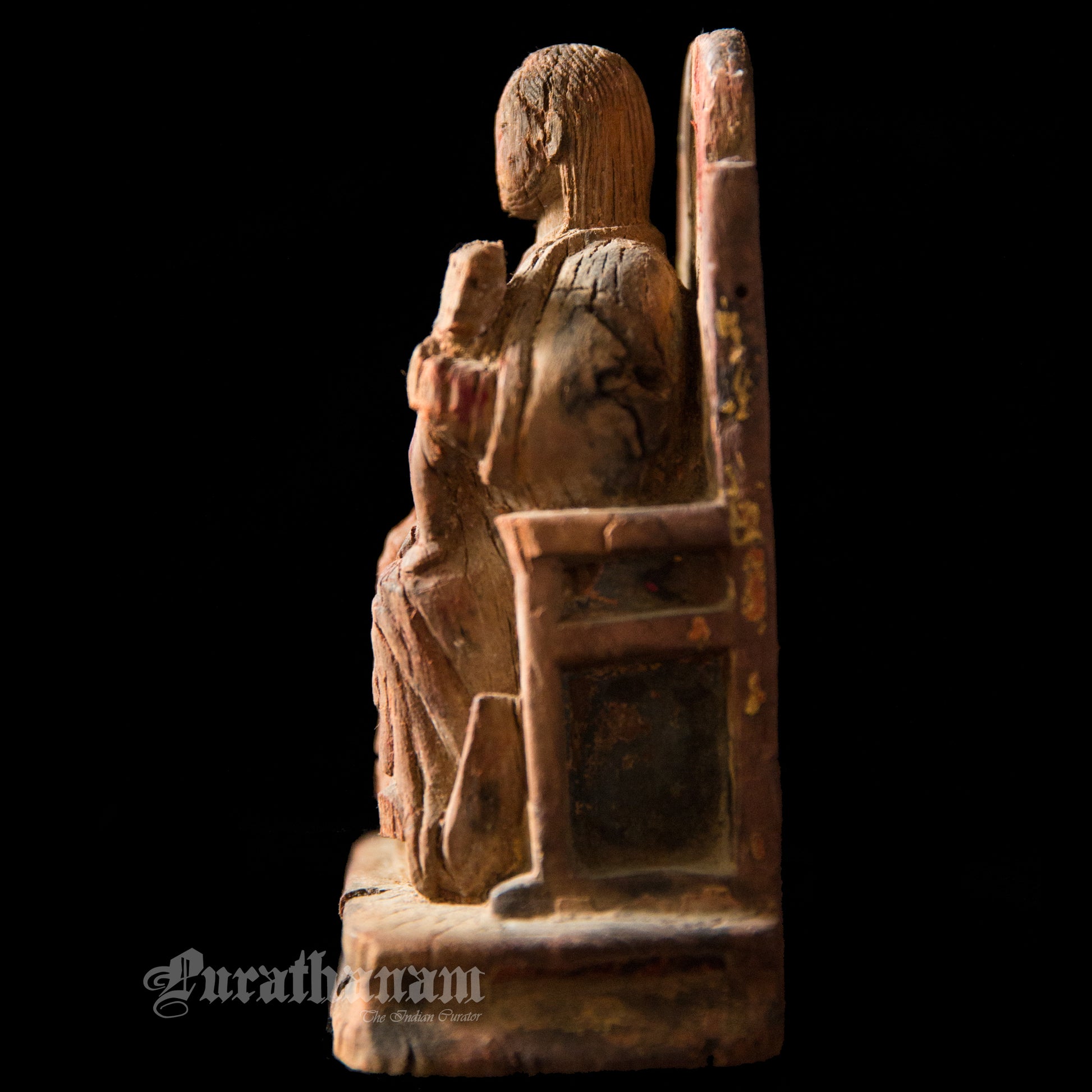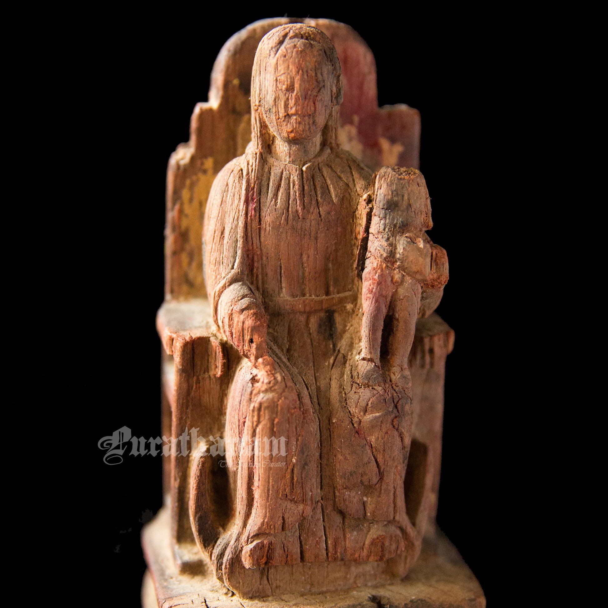 It’s old, rustic and earthy with a distressed look. She looks pretty old guessing from the cracks, her missing baby from her left hand side lap, from the distressed look of her throne and the faded color of her dress. The owner says, that it’s 100+ years old but we believe tht she was on that throne for quite a lot more longer than that. She is from Goa.