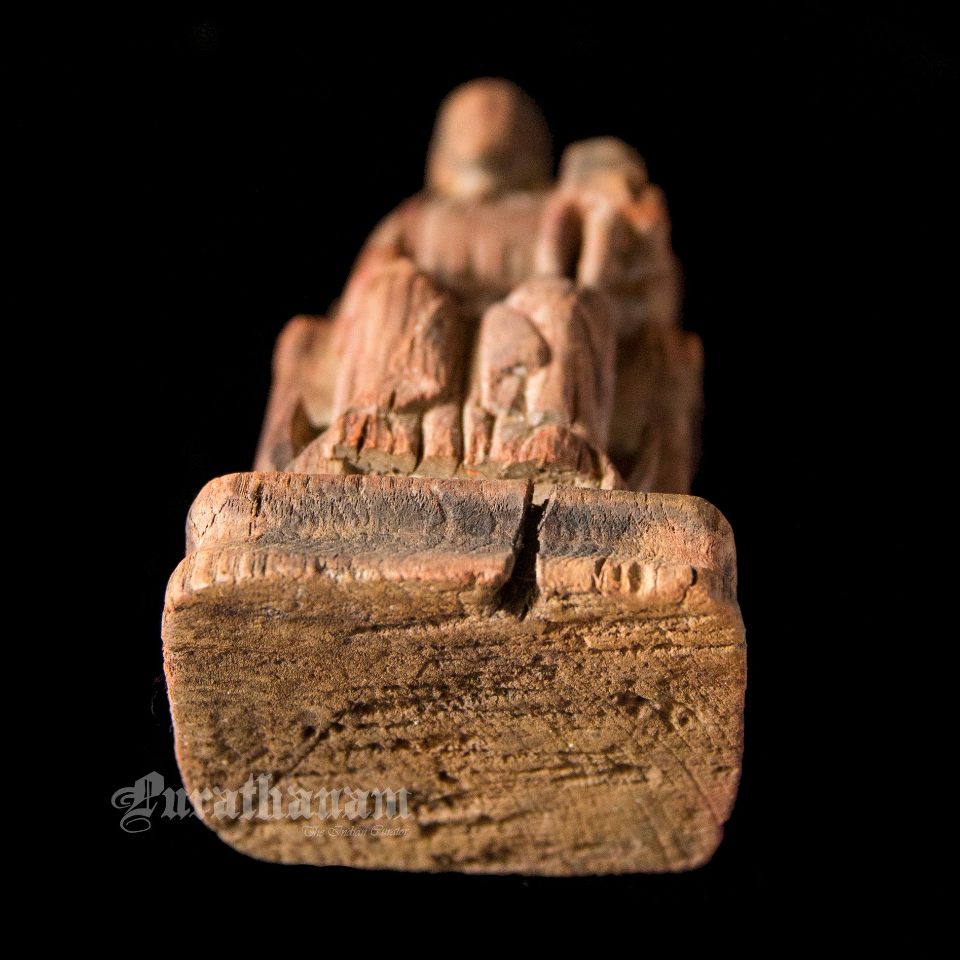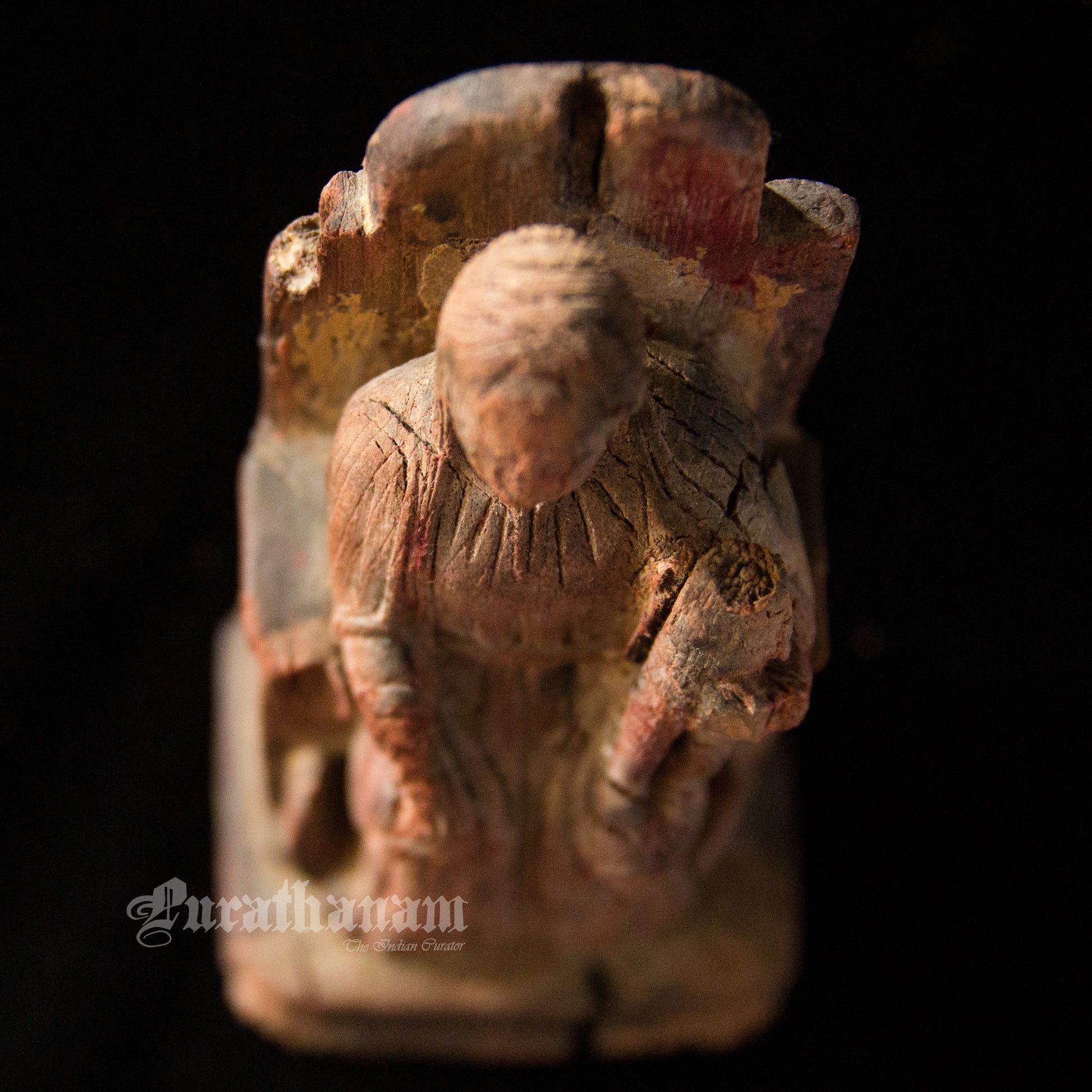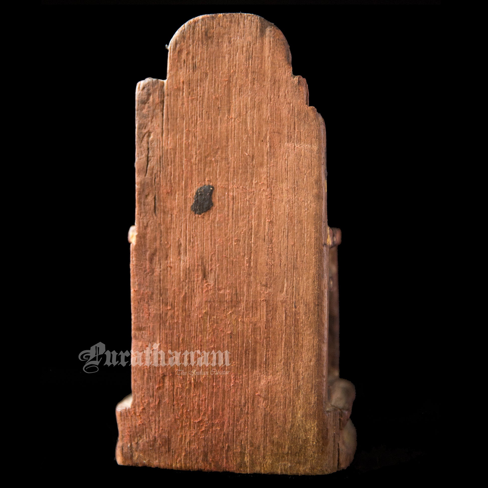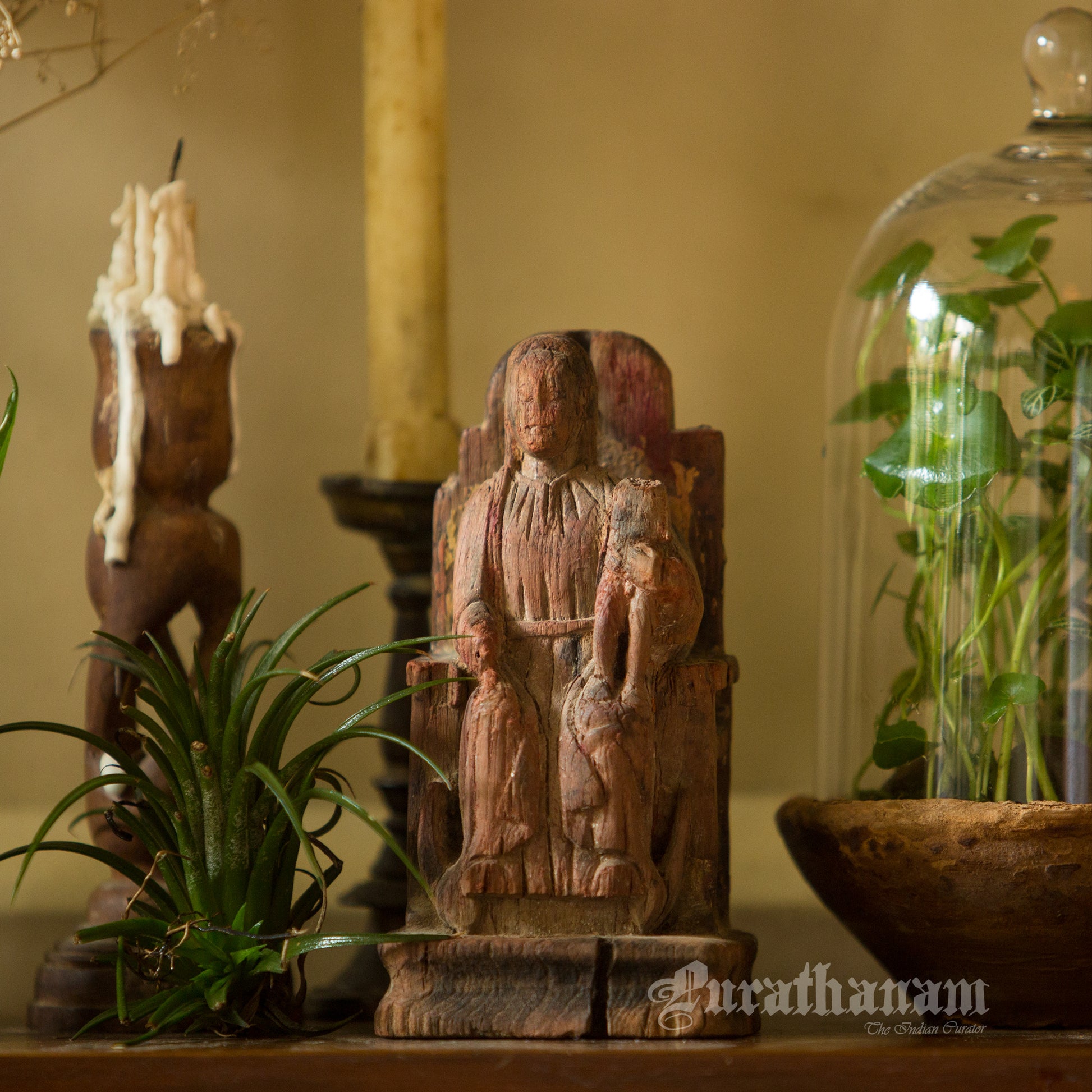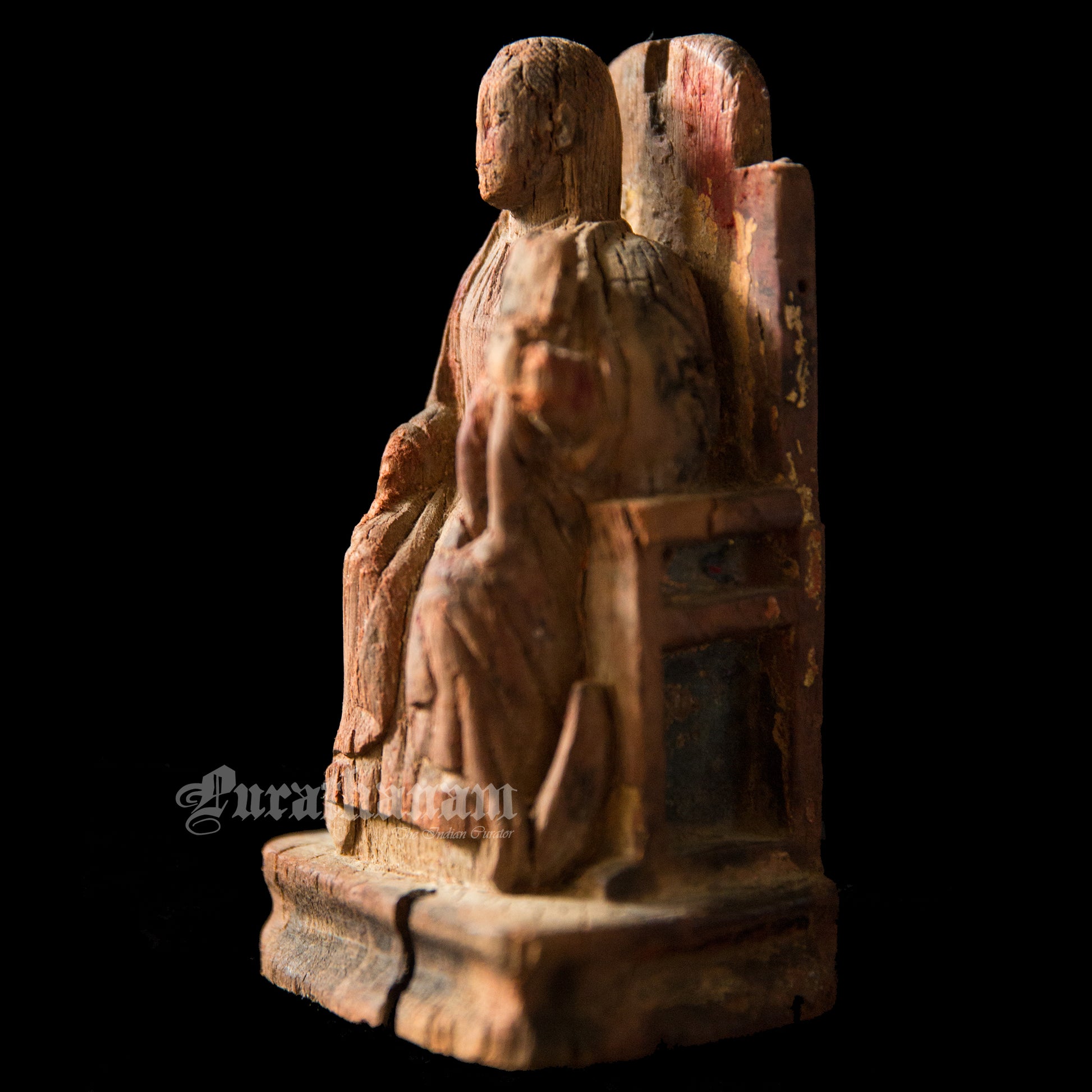 It’s old, rustic and earthy with a distressed look. She looks pretty old guessing from the cracks, her missing baby from her left hand side lap, from the distressed look of her throne and the faded color of her dress. The owner says, that it’s 100+ years old but we believe tht she was on that throne for quite a lot more longer than that. She is from Goa.