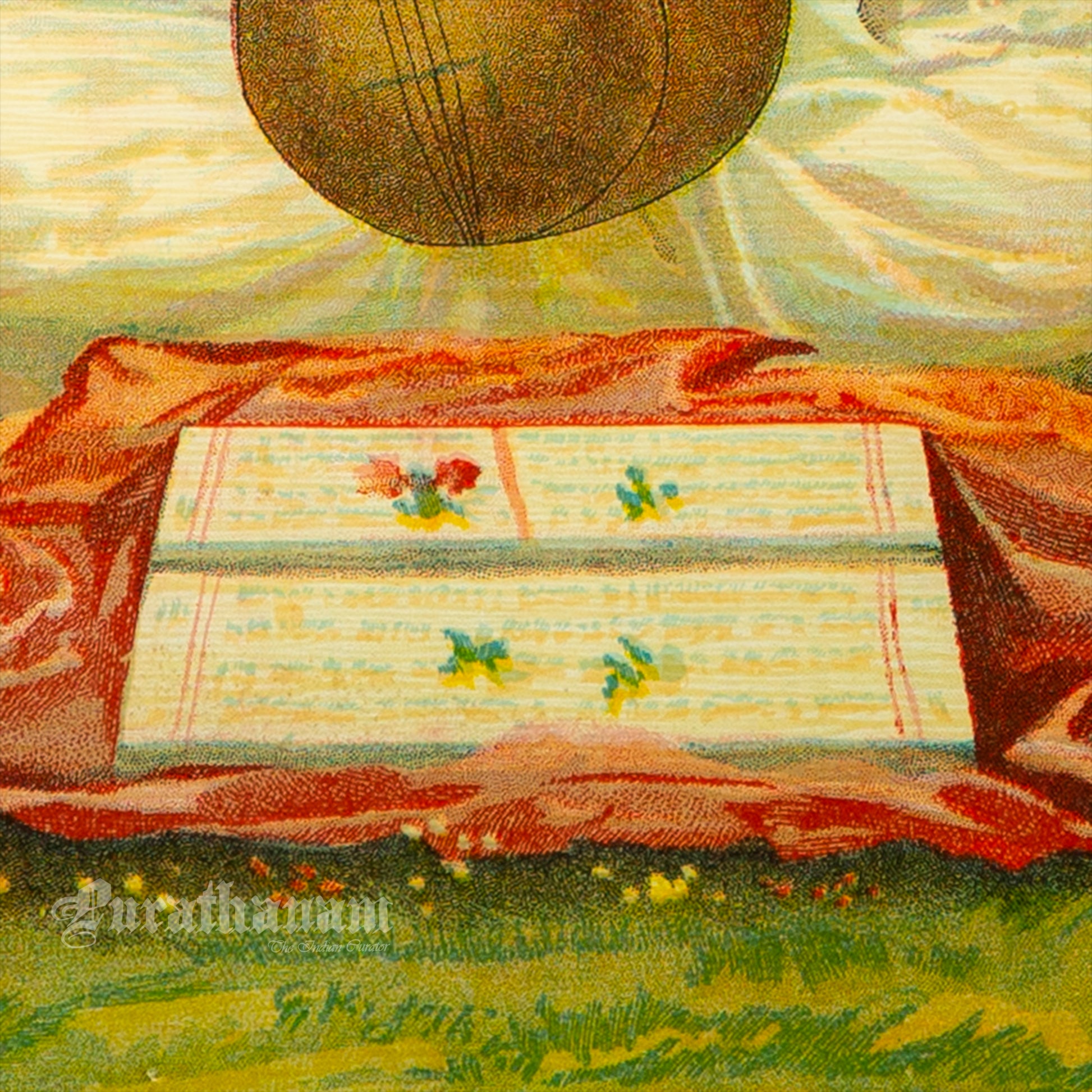 The Greek word litho means 'stone' and graphein means 'to write' so Lithography can be defined as 'stone printing'. The printing plate originally used were porous stones. The priting portion of the stone plate was treated to absorb ink and the nonprinting area was treated to repel ink. Depending on the number of colours present, an oleograph could take months to produce by very skilled workers.