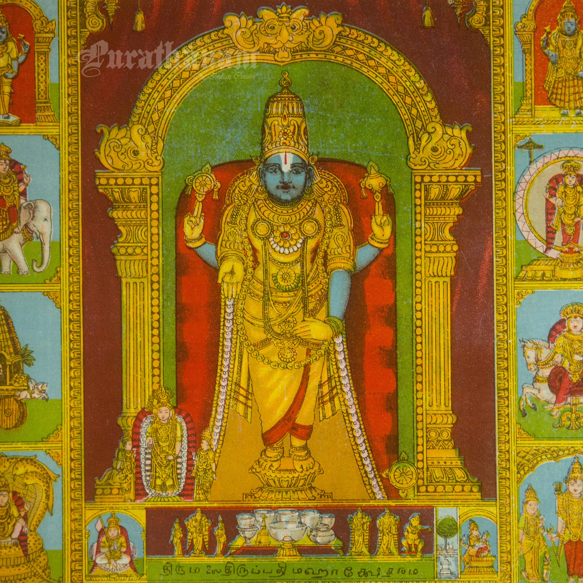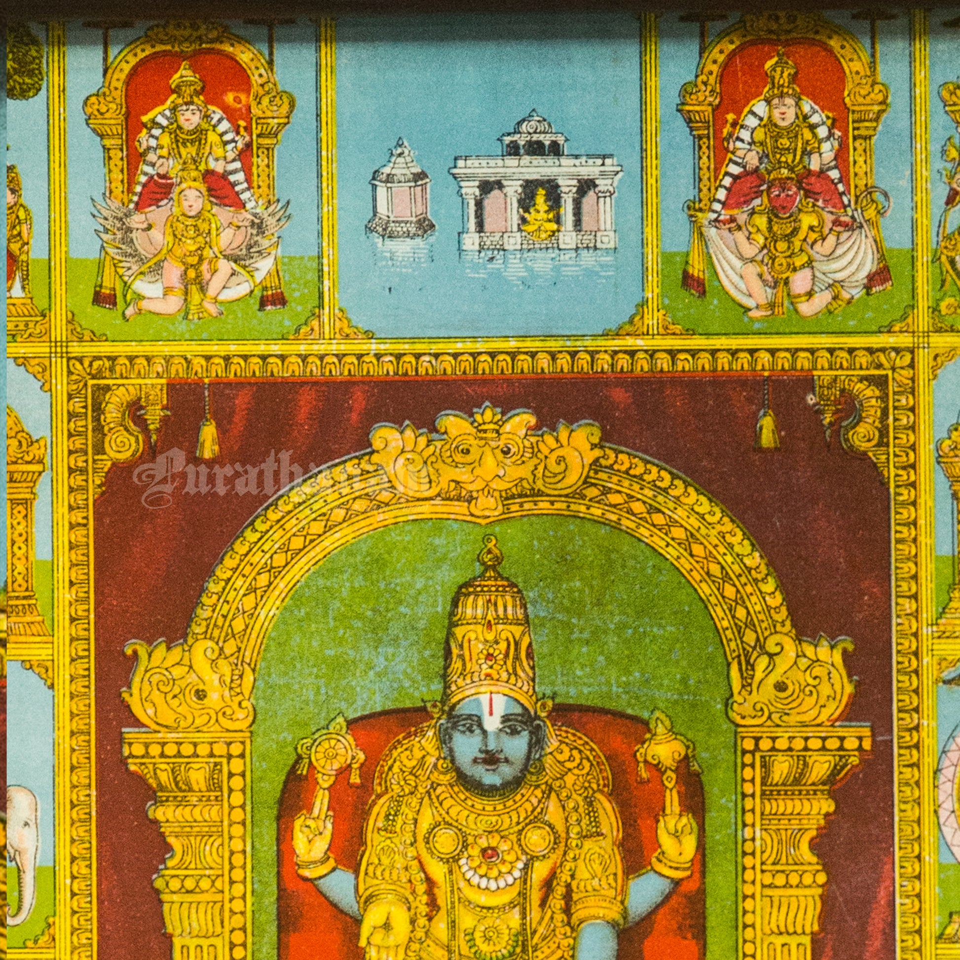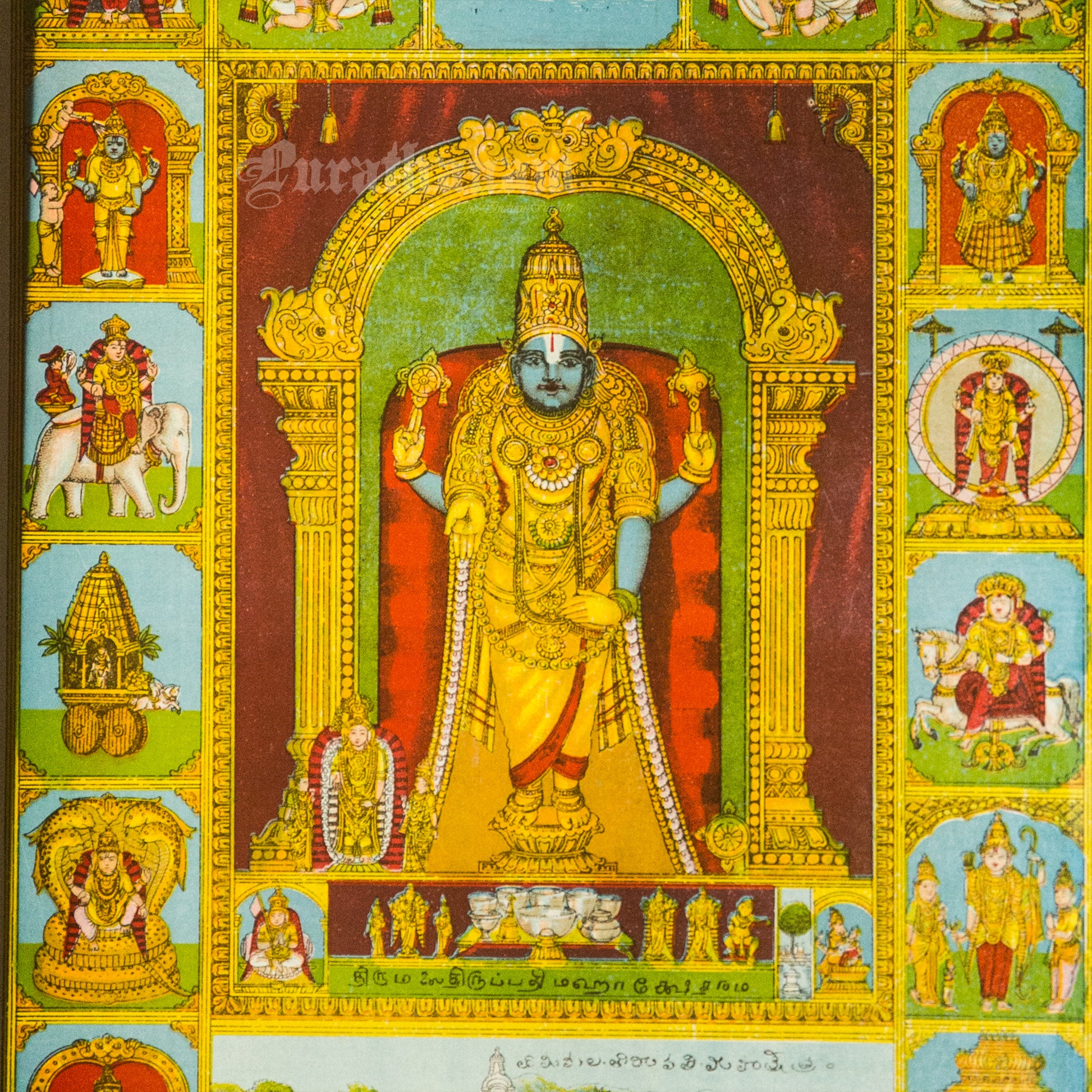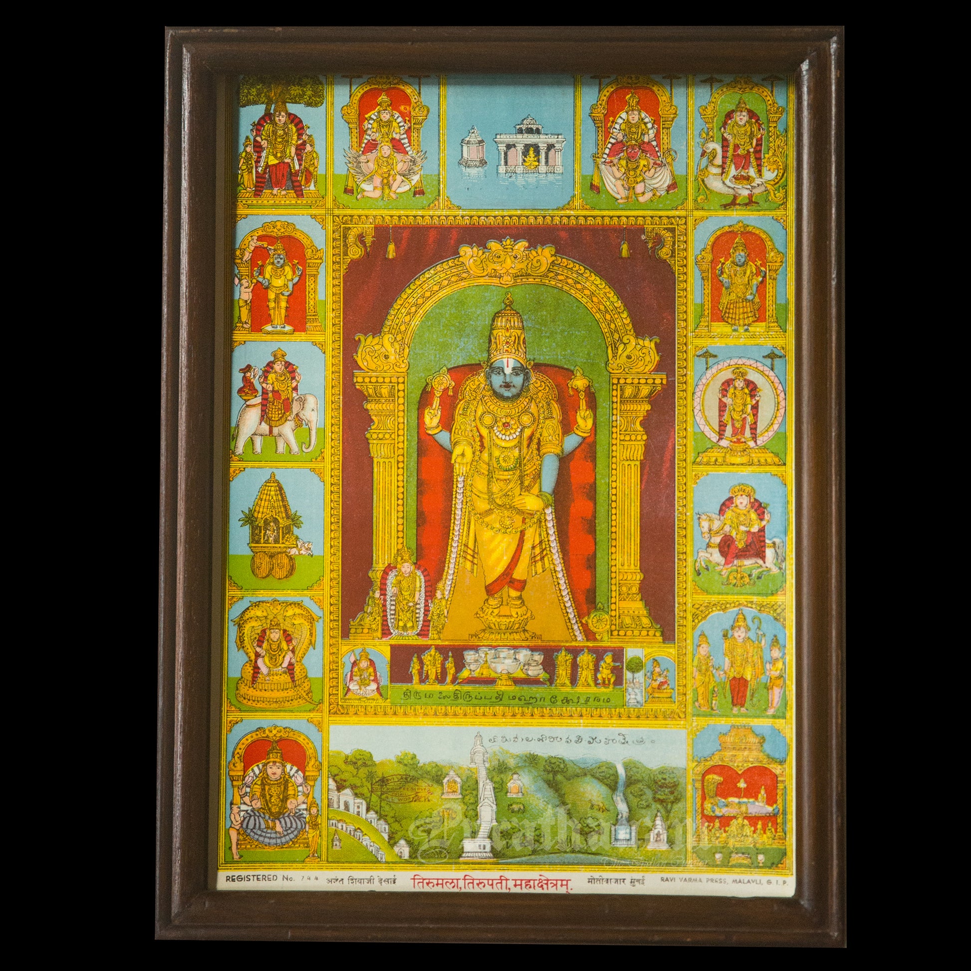 This is an oleograph print from 1920s- 1930s of Tirumala Tirupati Mahakshetram by Ravi Varma an Indian painter who achieved recognition for his depiction of scenes from the epics of the Mahabharata and Ramayana.