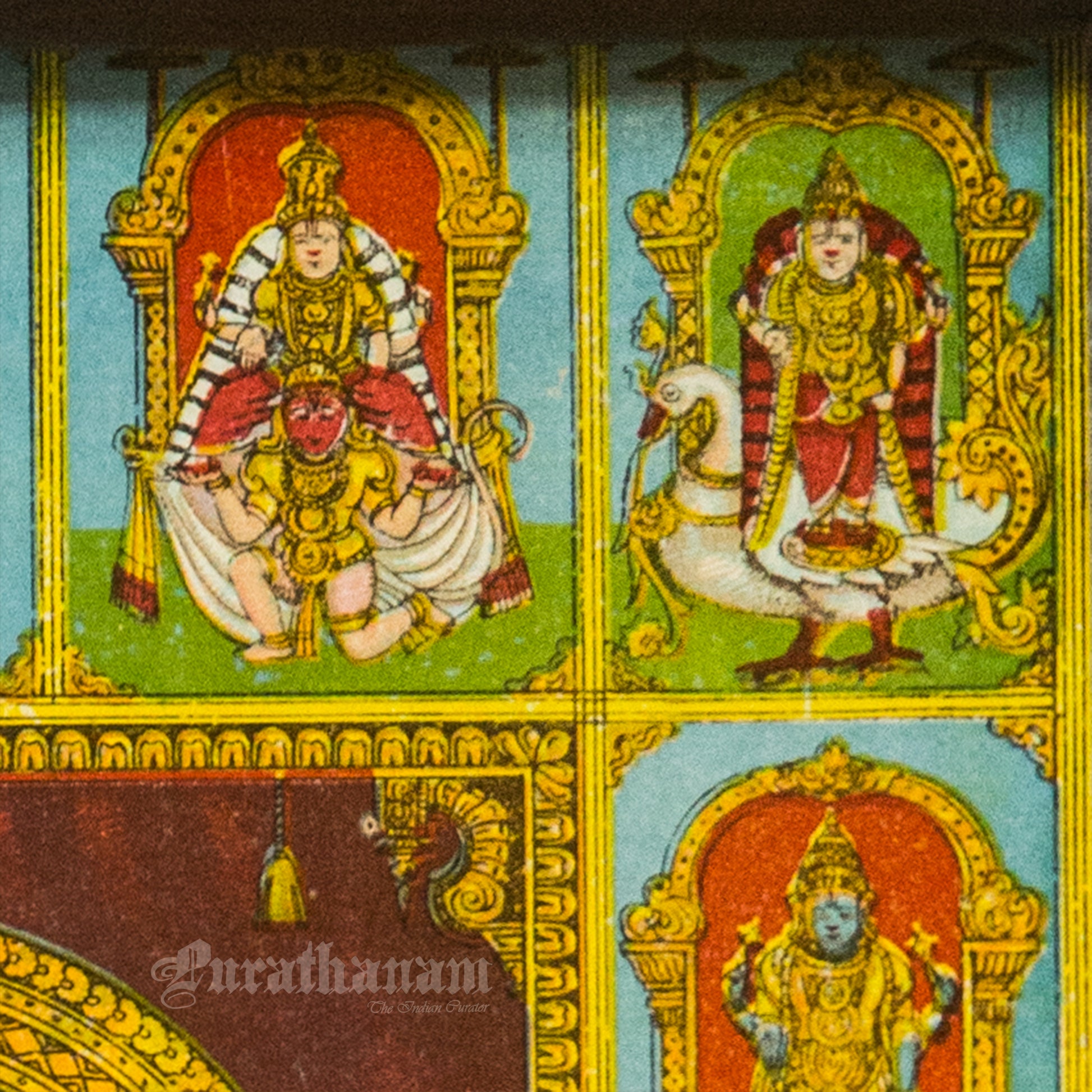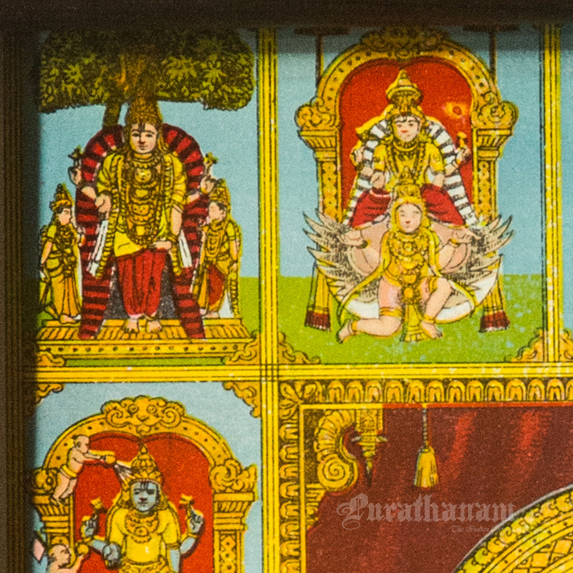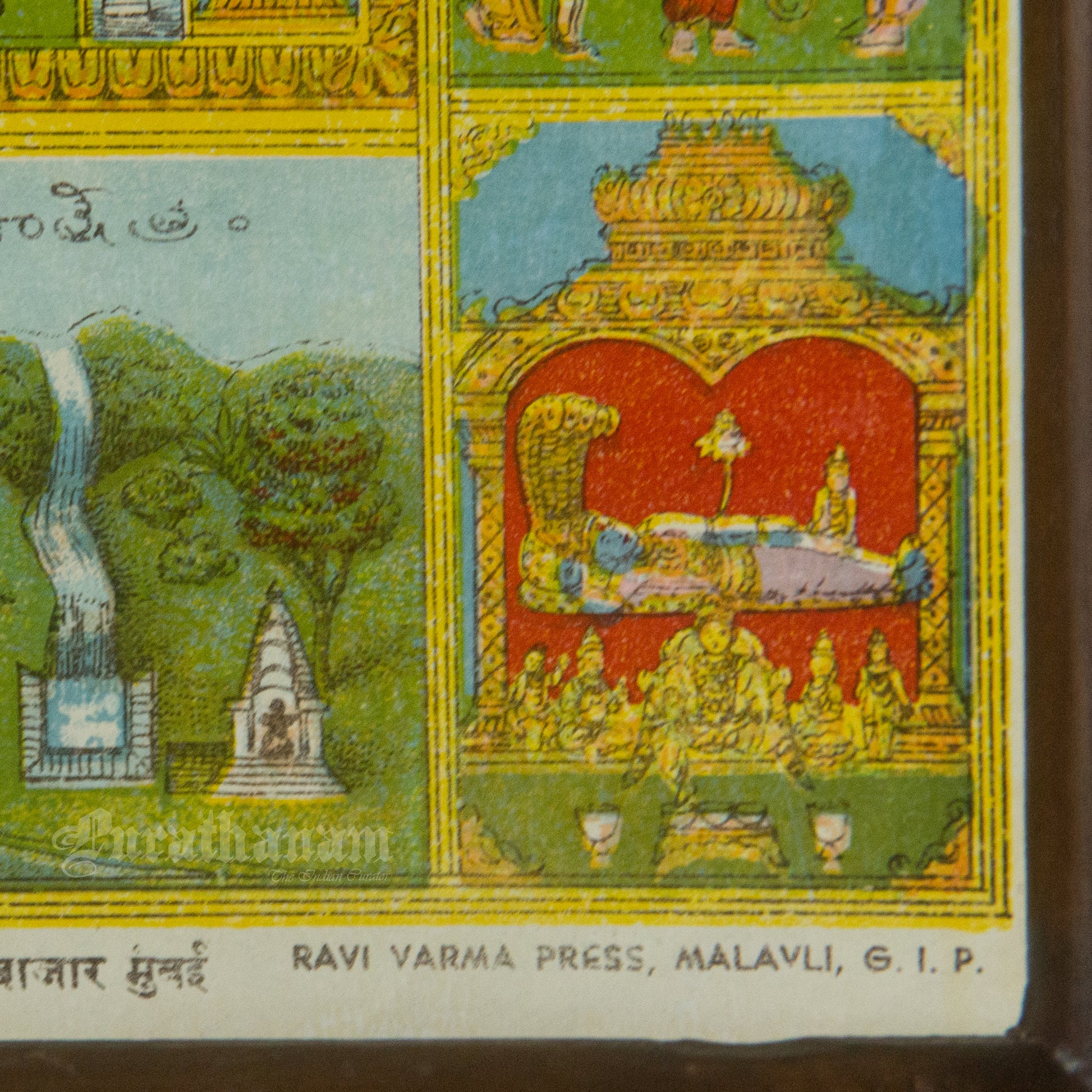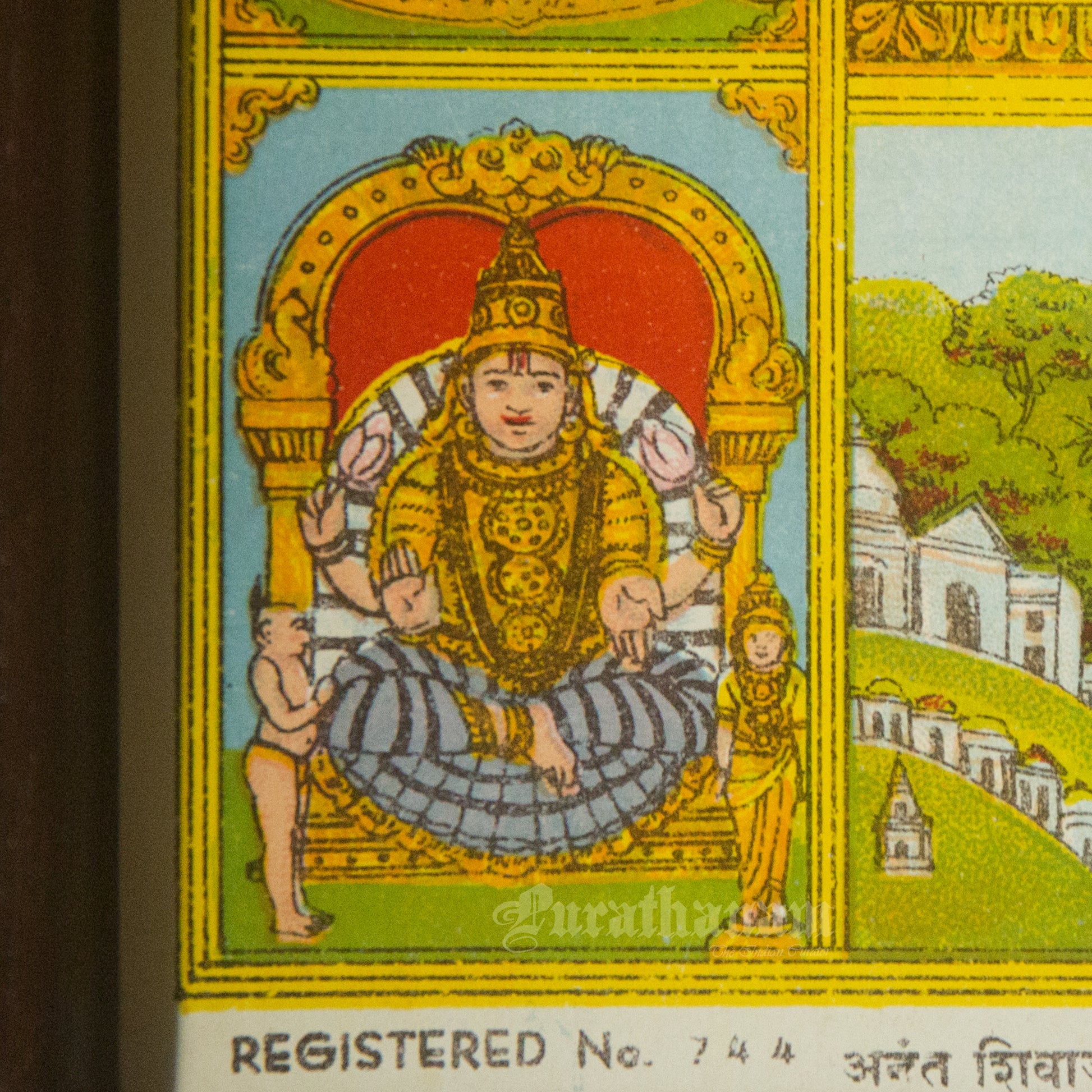 This is an oleograph print from 1920s- 1930s of Tirumala Tirupati Mahakshetram by Ravi Varma an Indian painter who achieved recognition for his depiction of scenes from the epics of the Mahabharata and Ramayana.