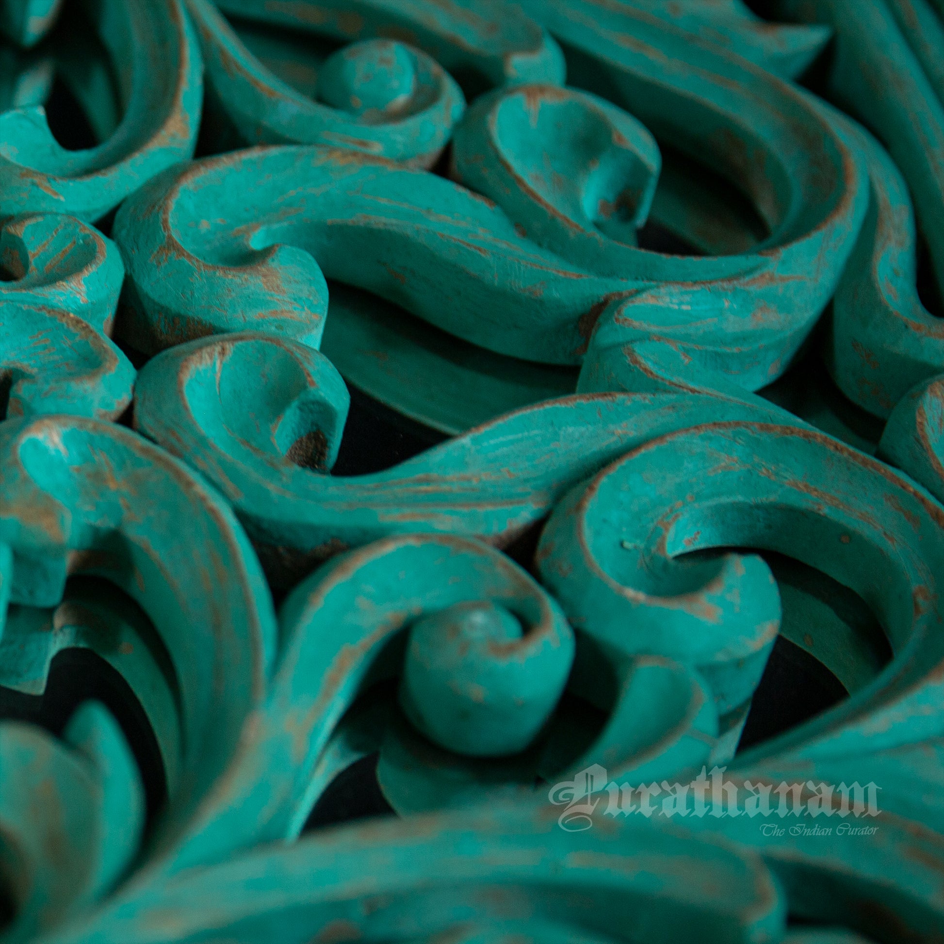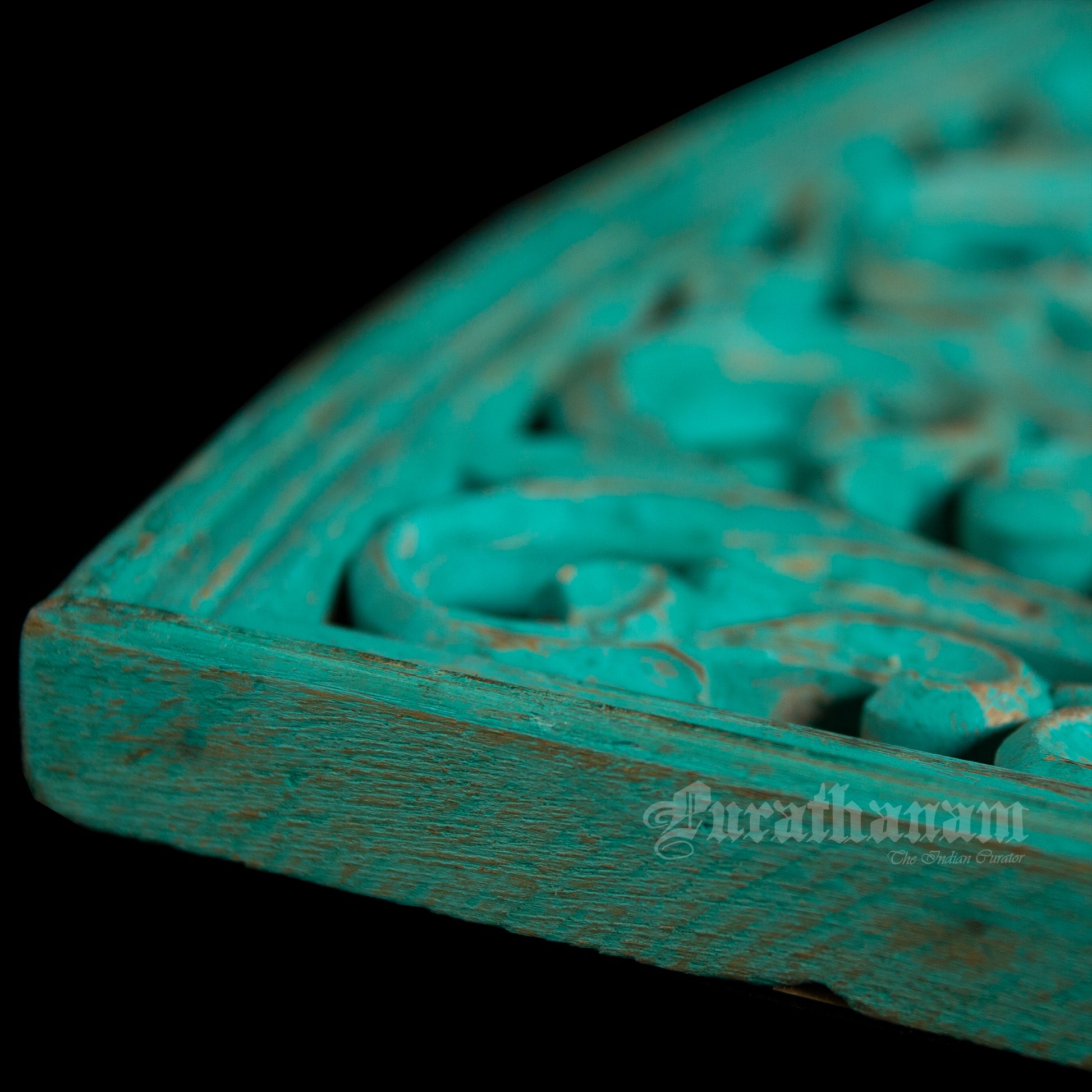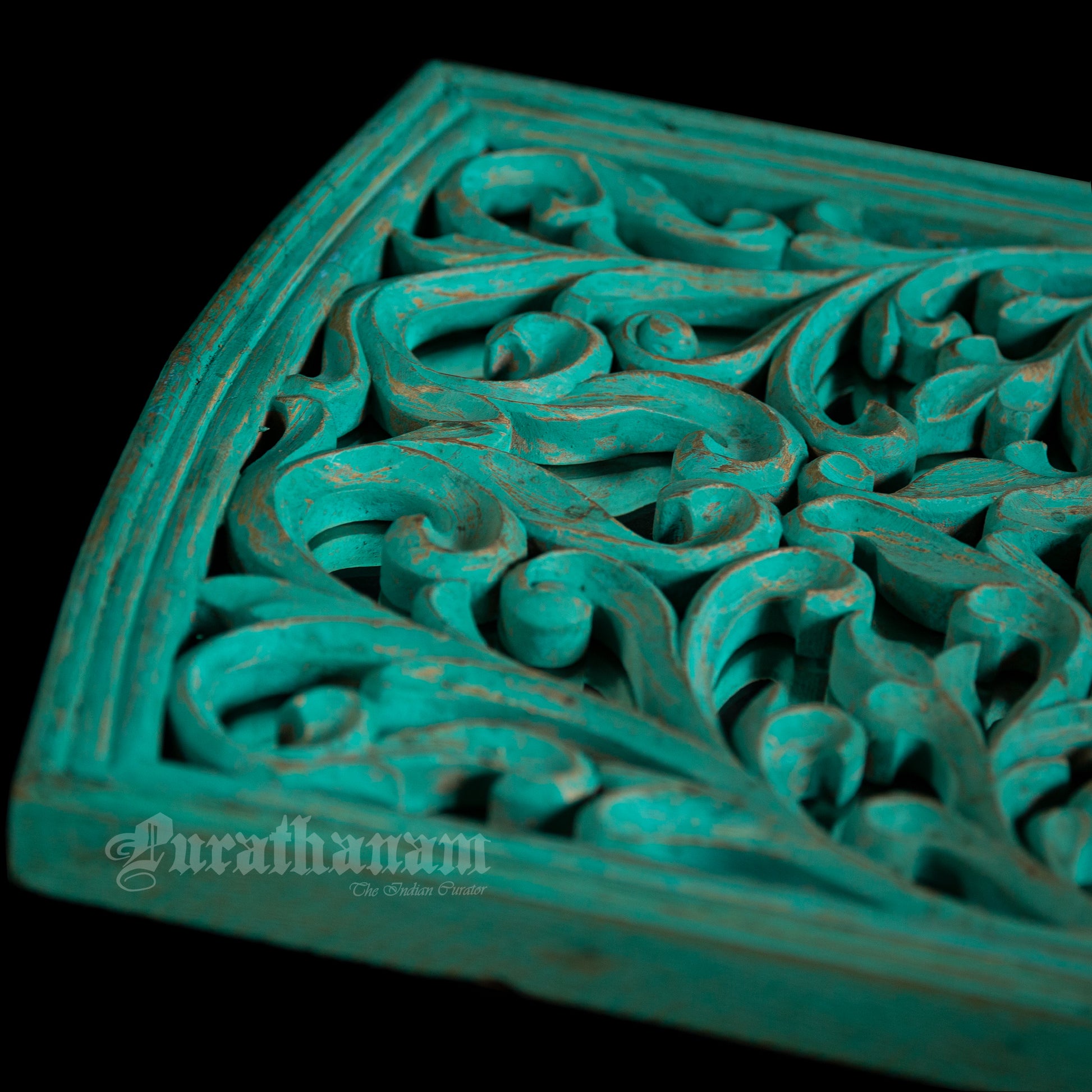 Here is a beautiful turquoise floral designed hand carved wooden panel which has mirror as it’s background. It is made of Teakwood and is about 30 years old.
