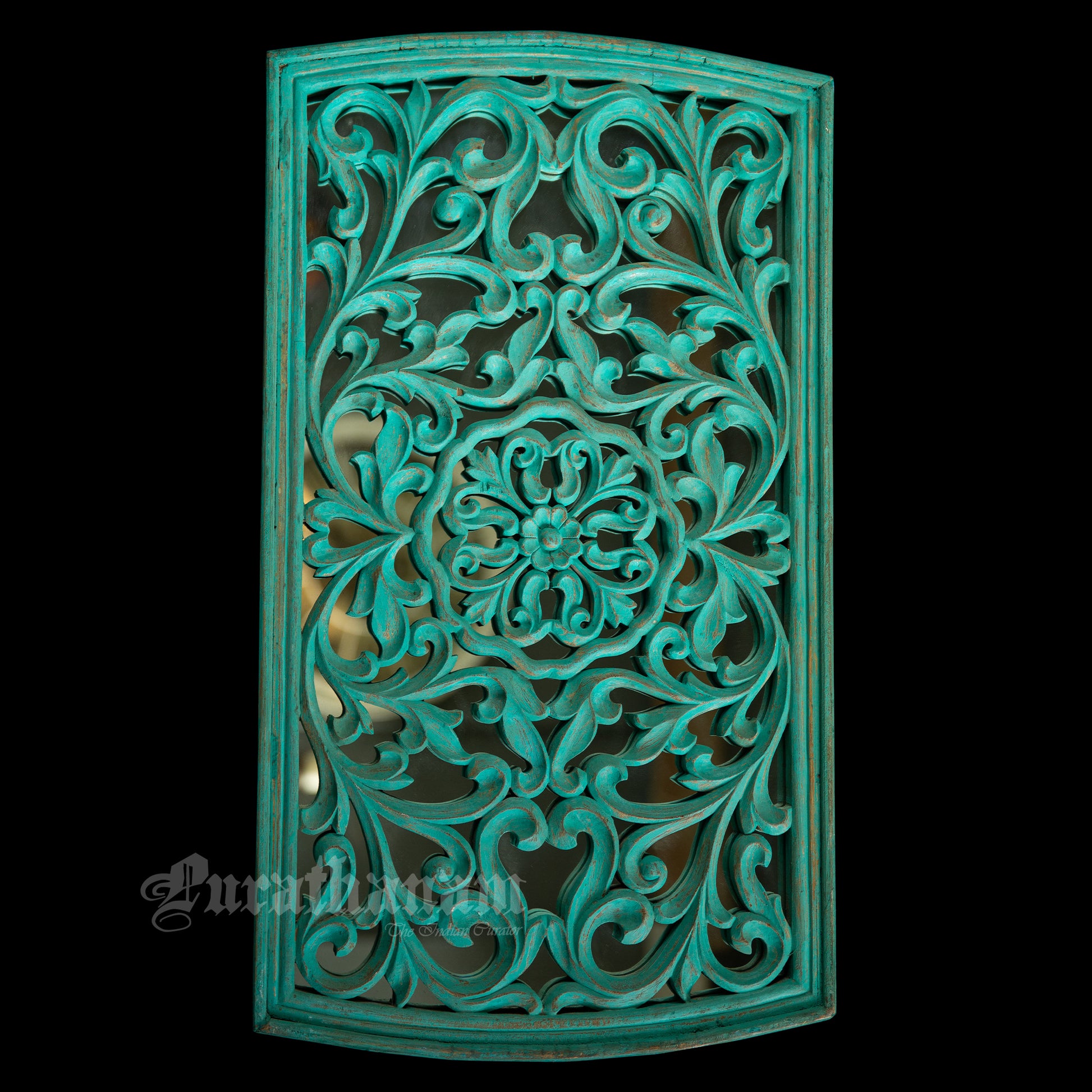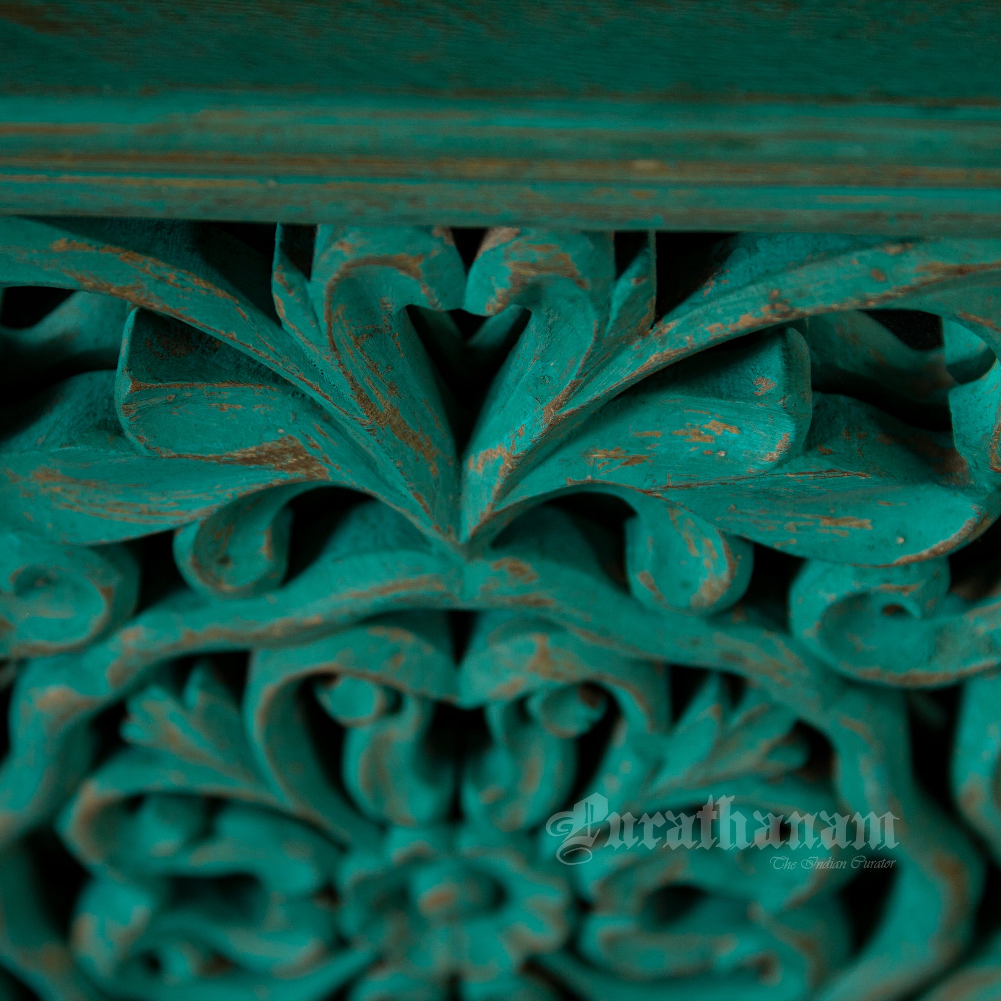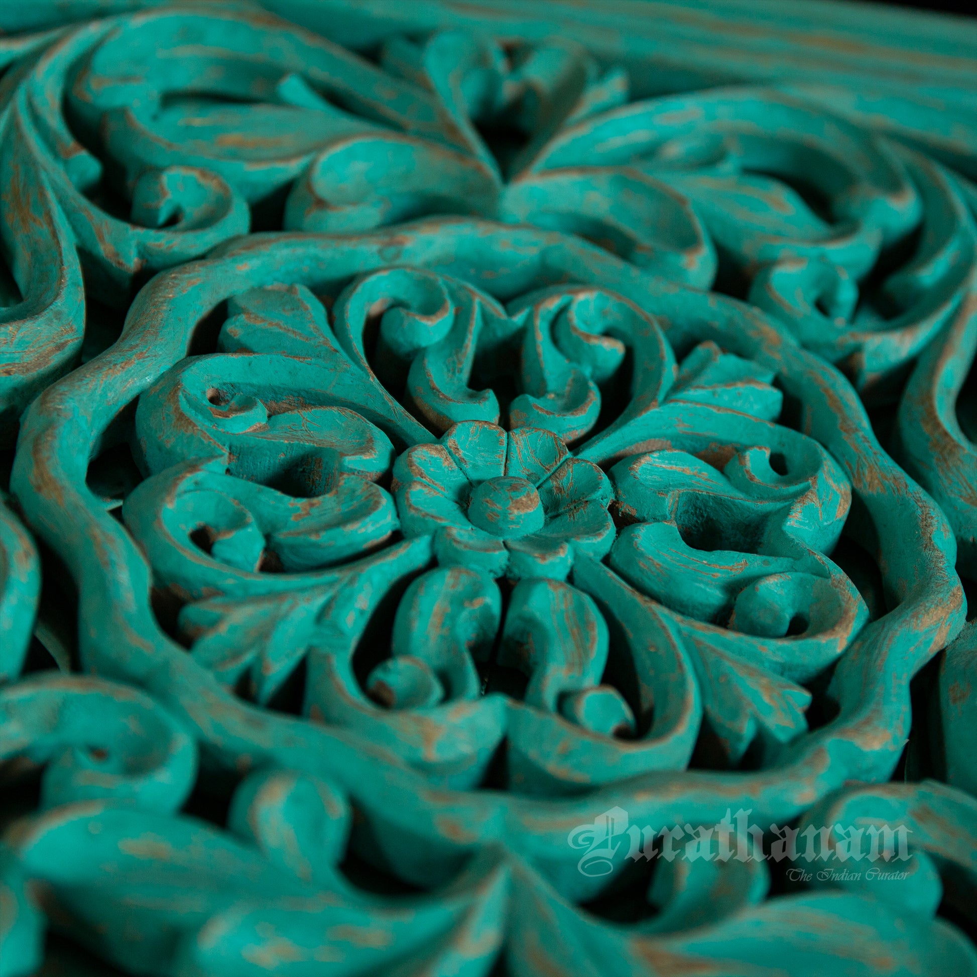 Here is a beautiful turquoise floral designed hand carved wooden panel which has mirror as it’s background. It is made of Teakwood and is about 30 years old.