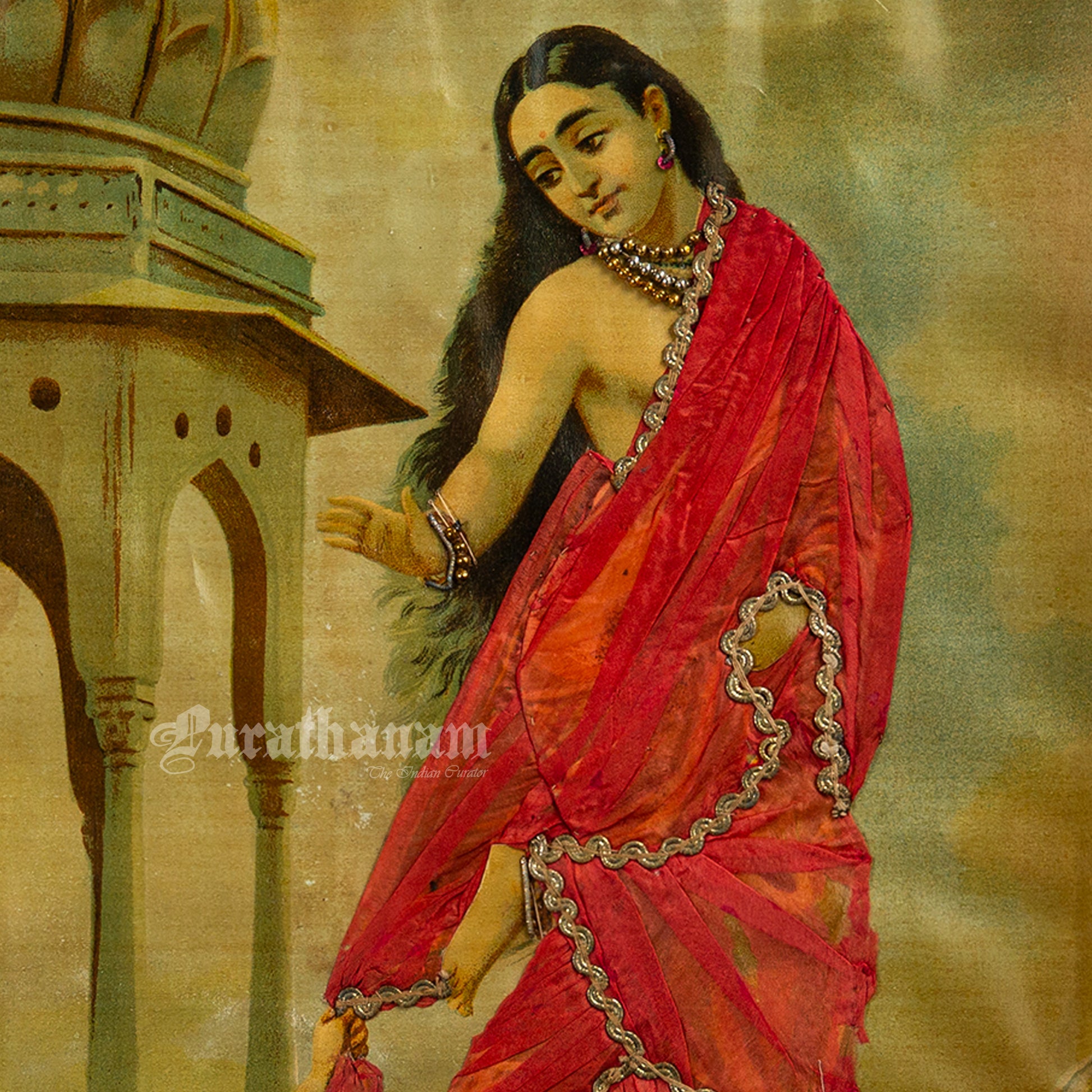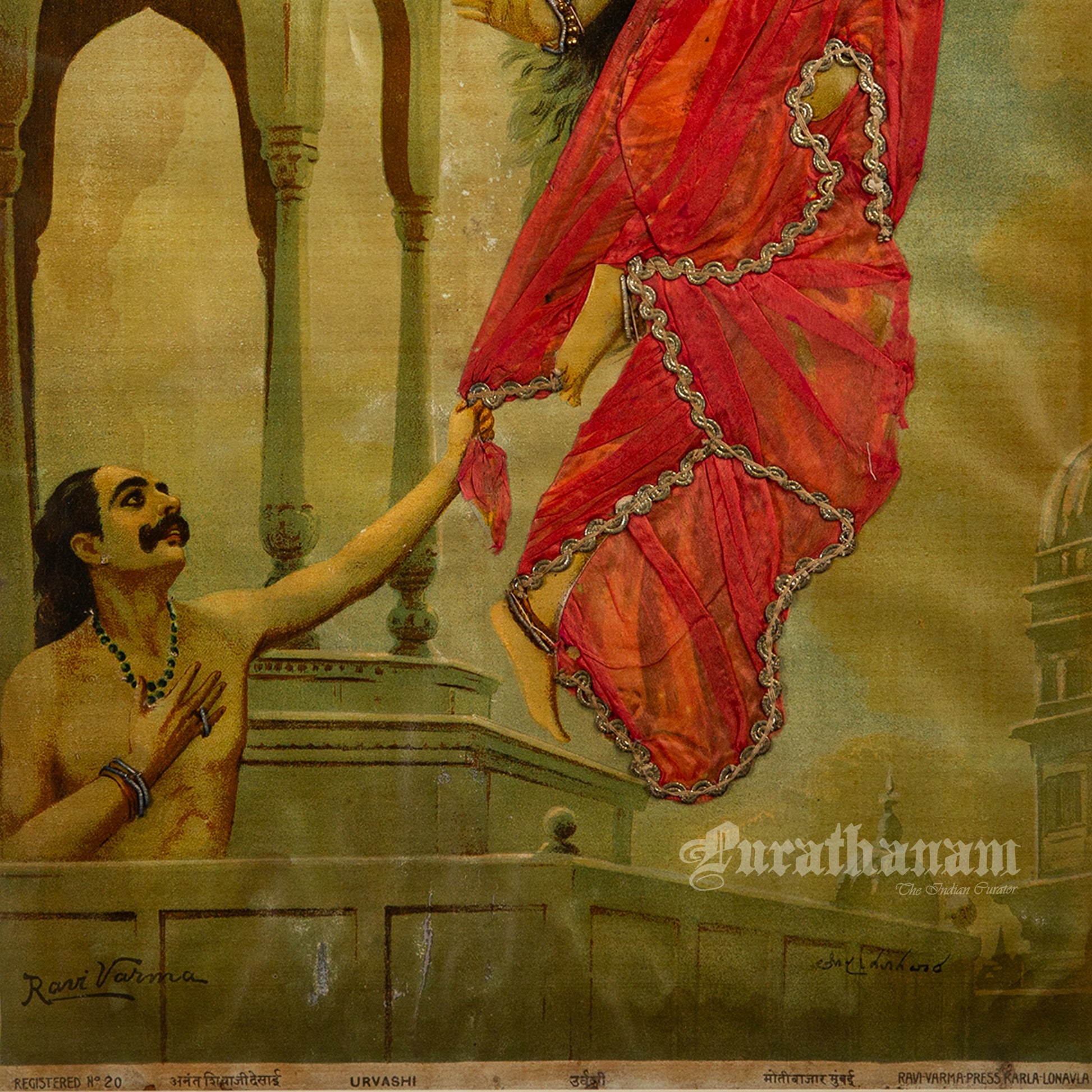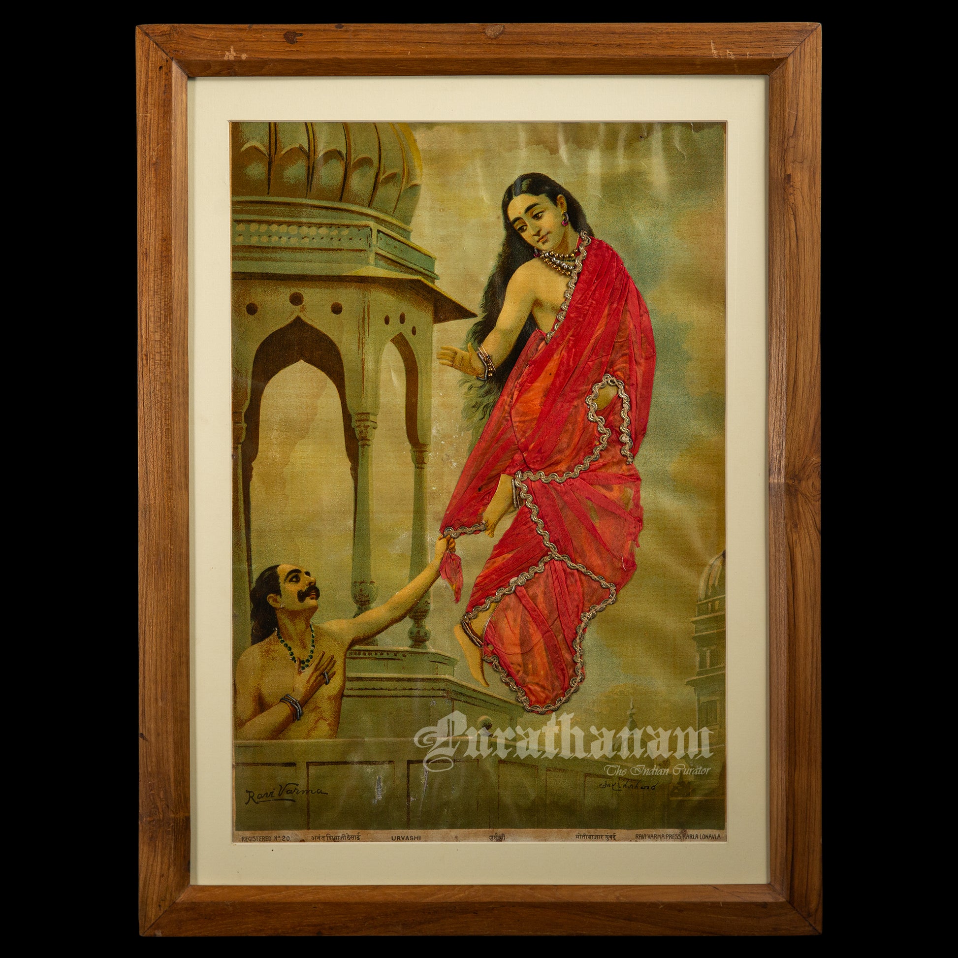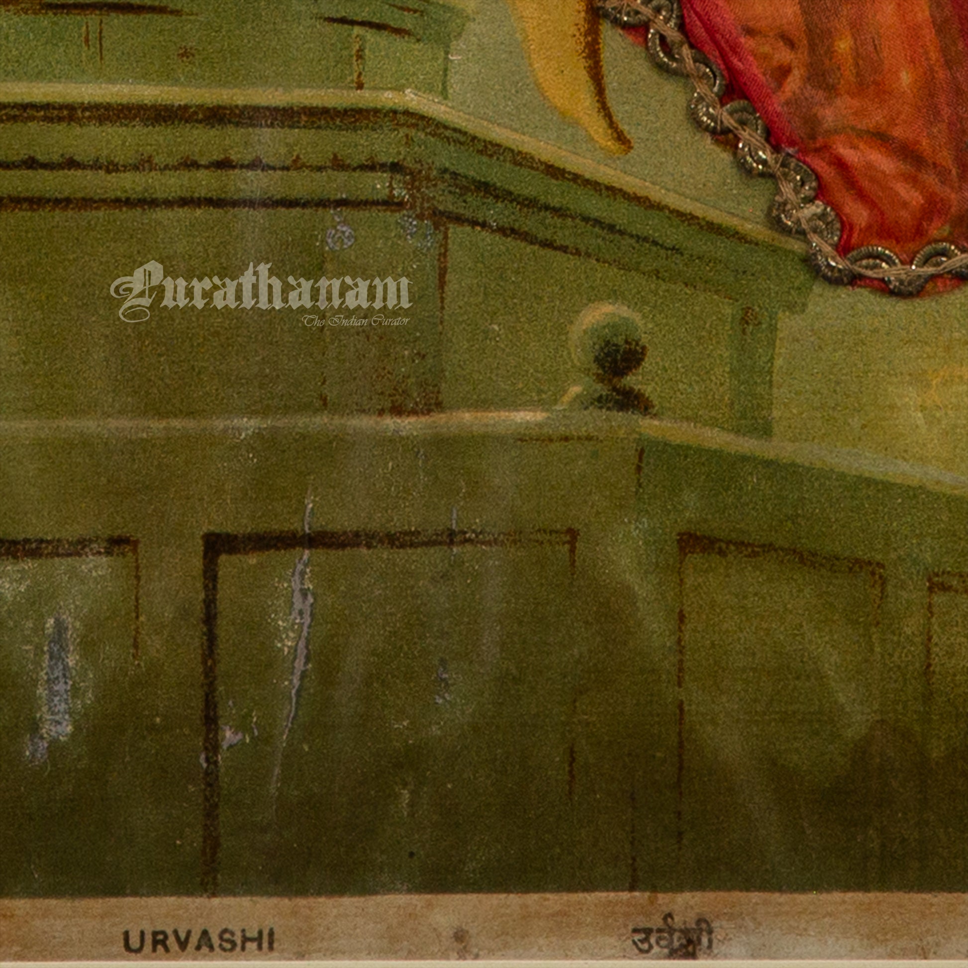 This is an oleograph print from 1920s of Urvashi by Ravi Varma an Indian who achieved recognition for his depiction of scenes from the epics of the Mahabharata and Ramayana.