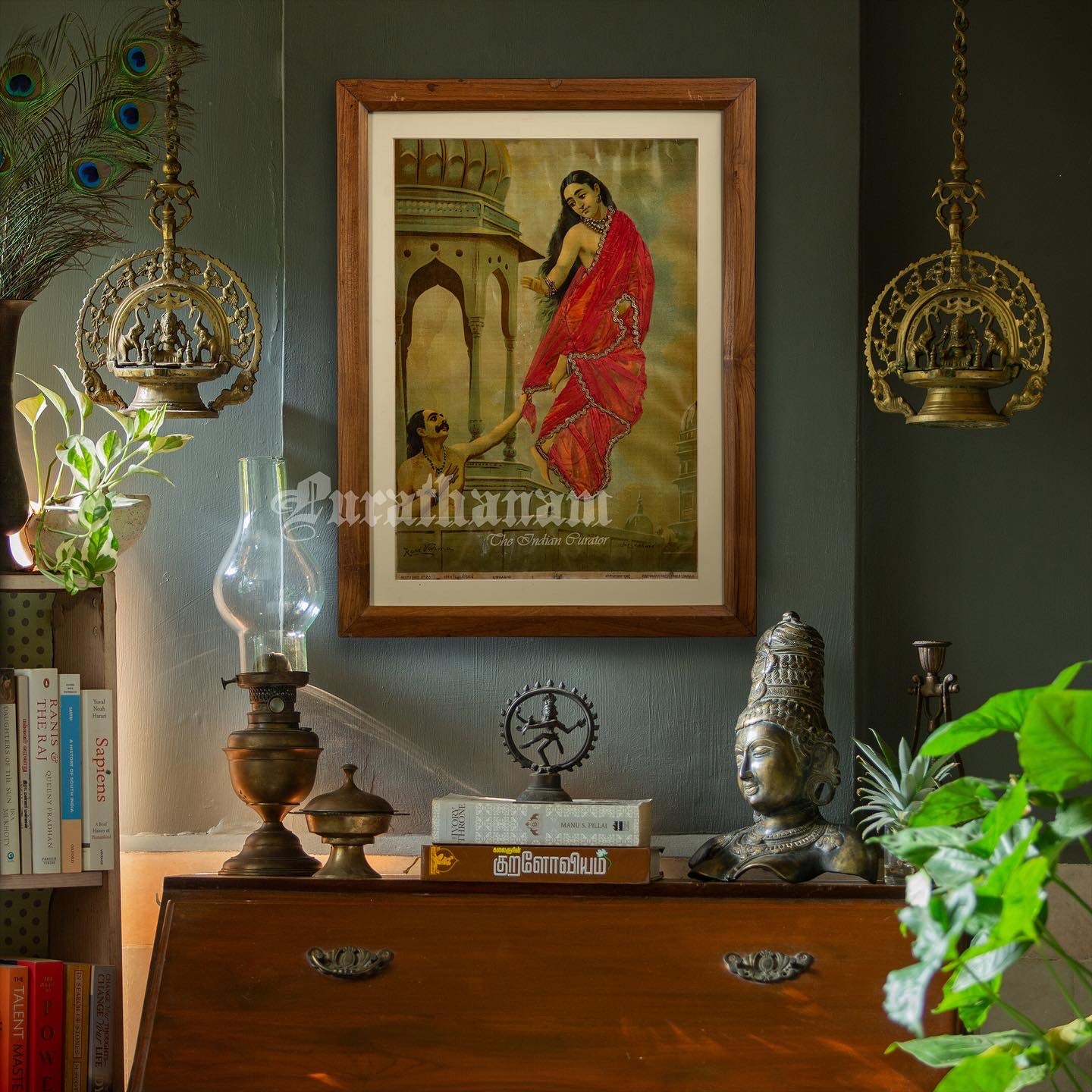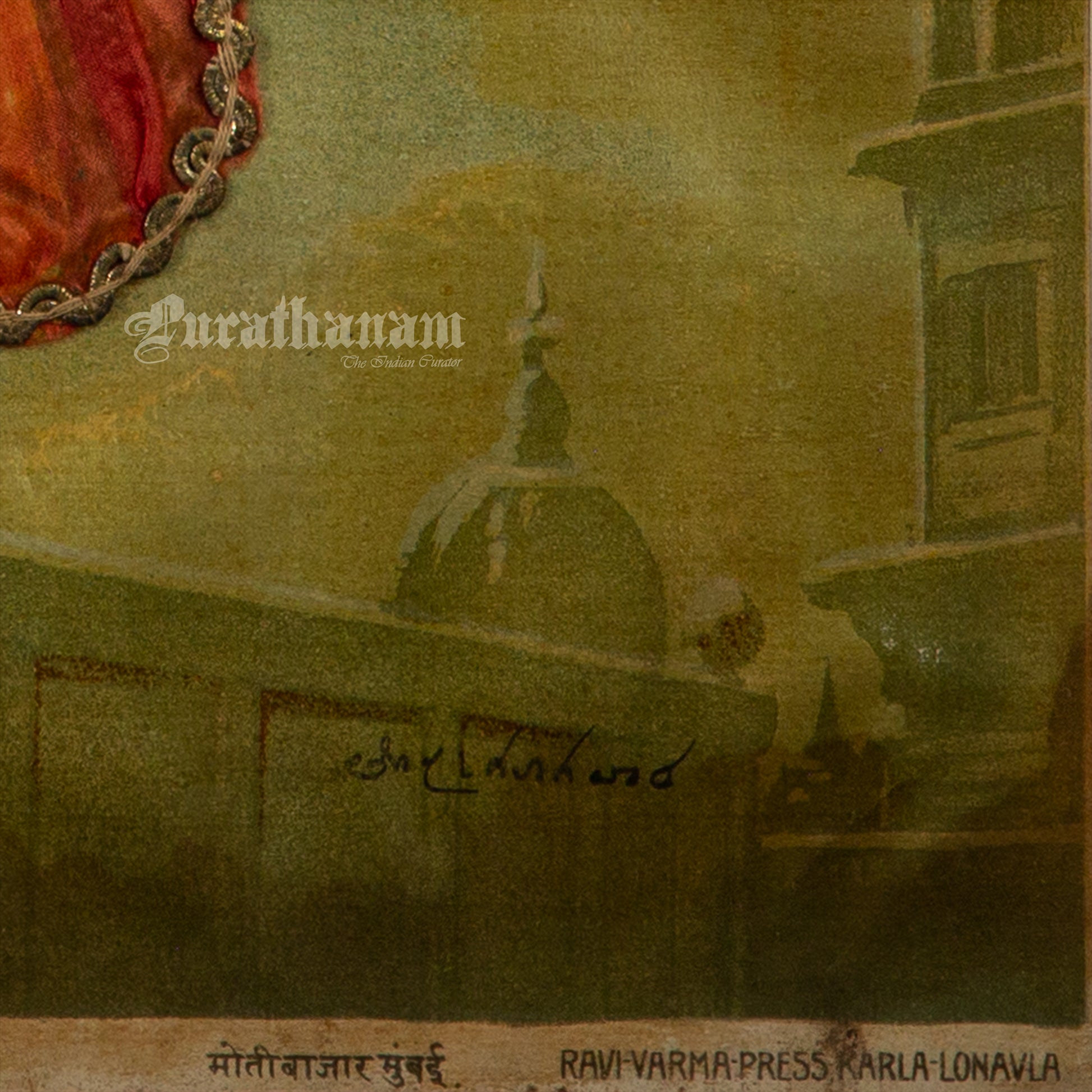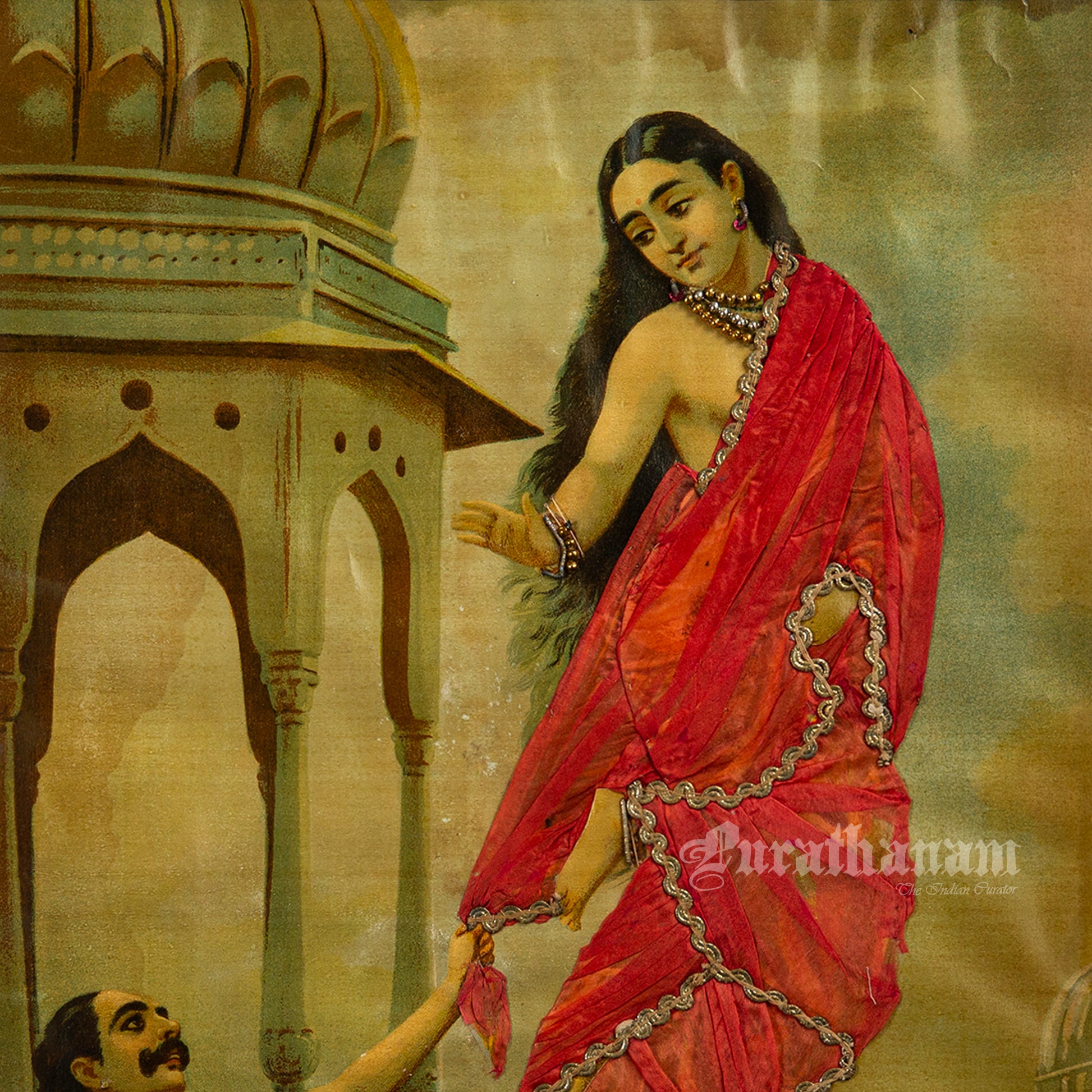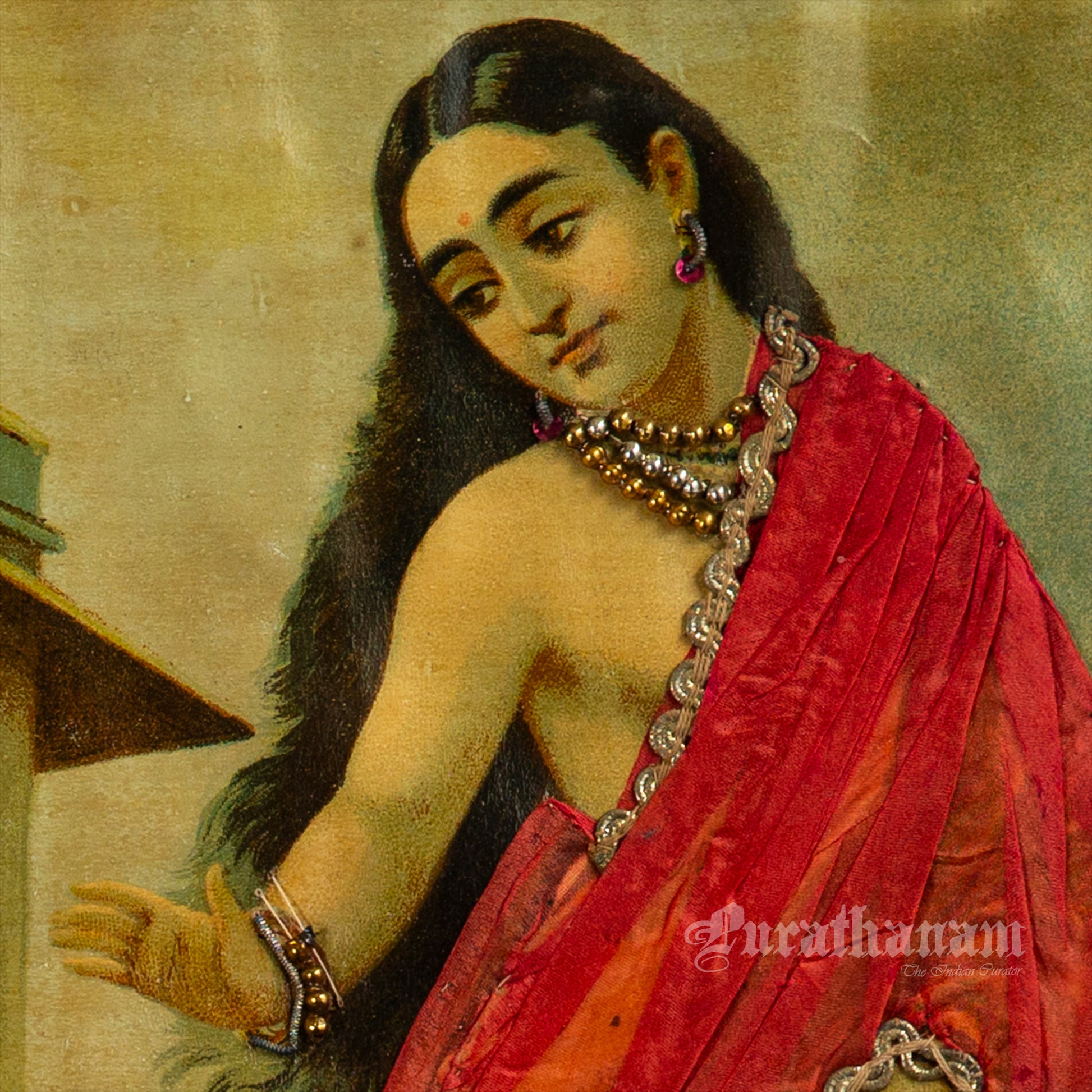 This is an oleograph print from 1920s of Urvashi by Ravi Varma an Indian who achieved recognition for his depiction of scenes from the epics of the Mahabharata and Ramayana.
