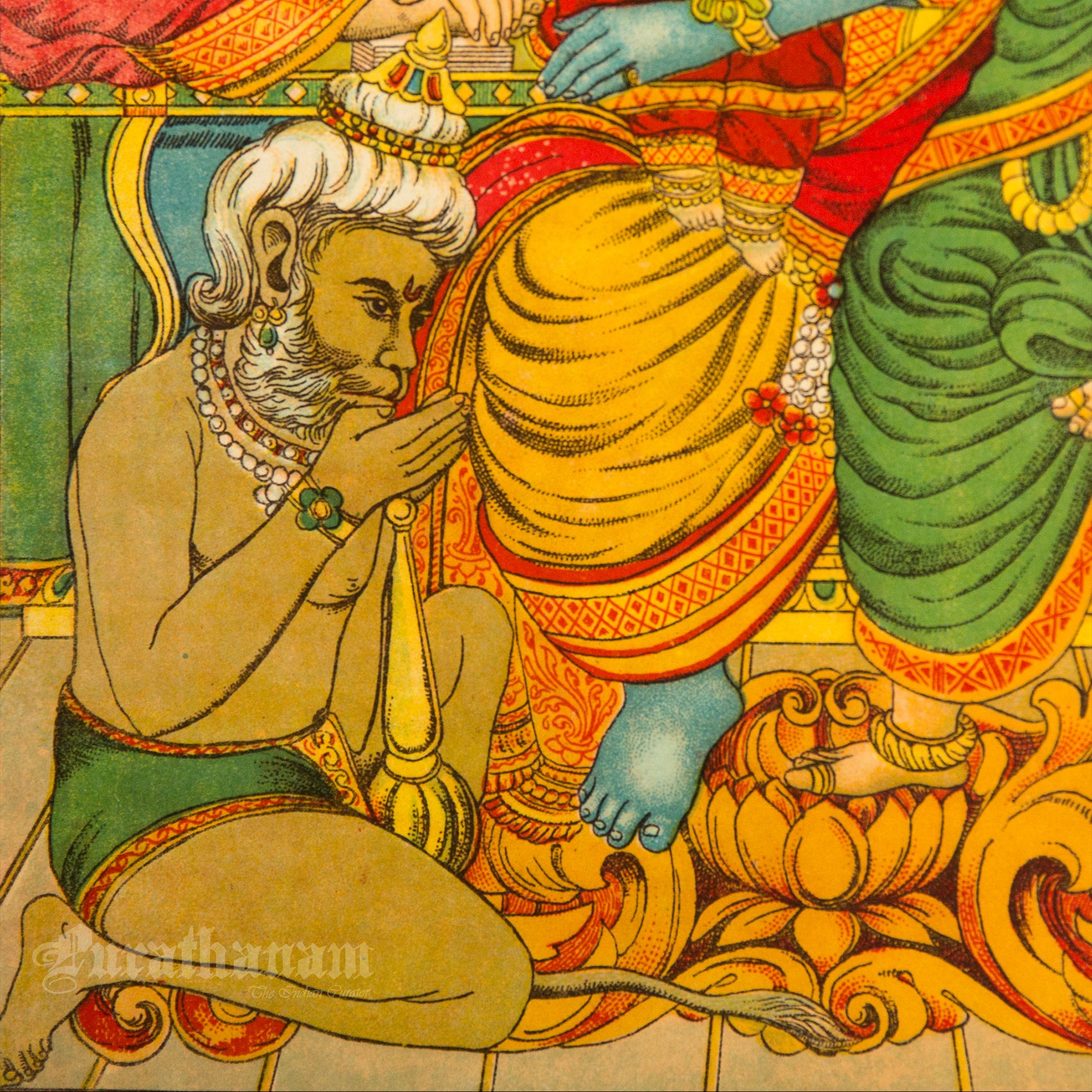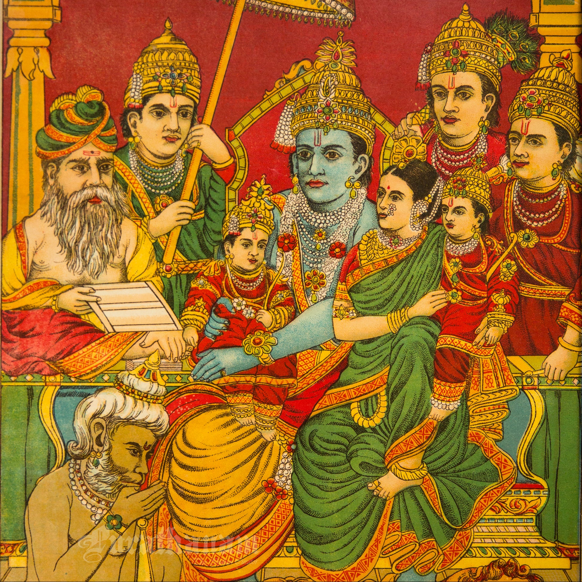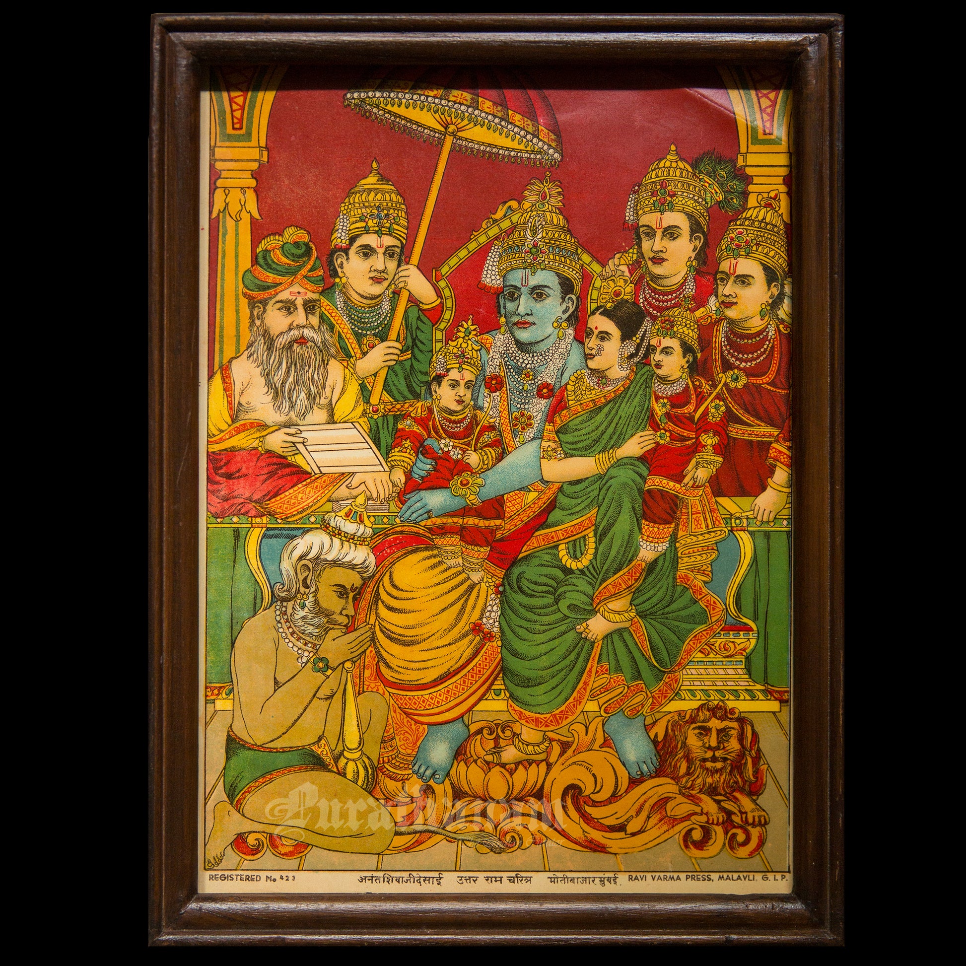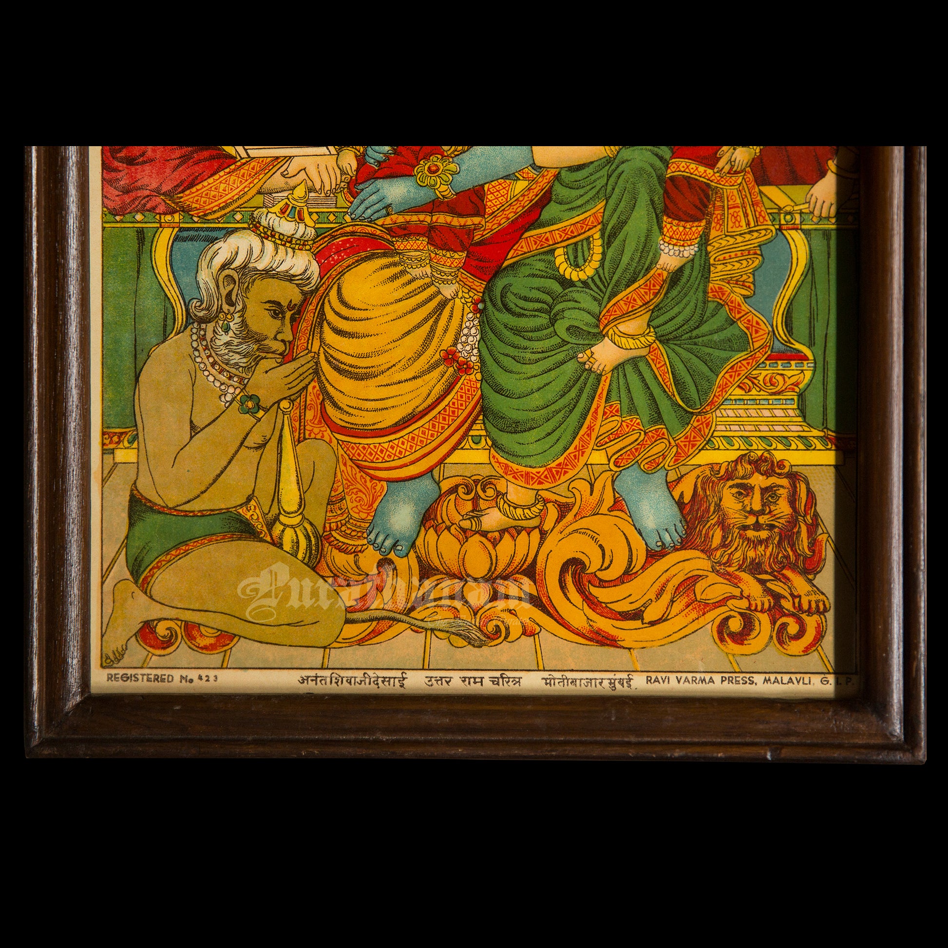 This is an oleograph print from 1920s- 1930s of Uttar Ram Charitra by Ravi Varma an Indian painter who achieved recognition for his depiction of scenes from the epics of the Mahabharata and Ramayana.