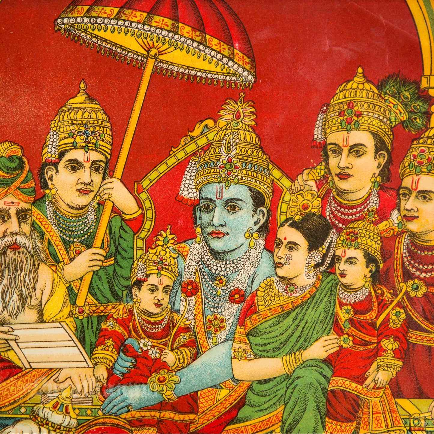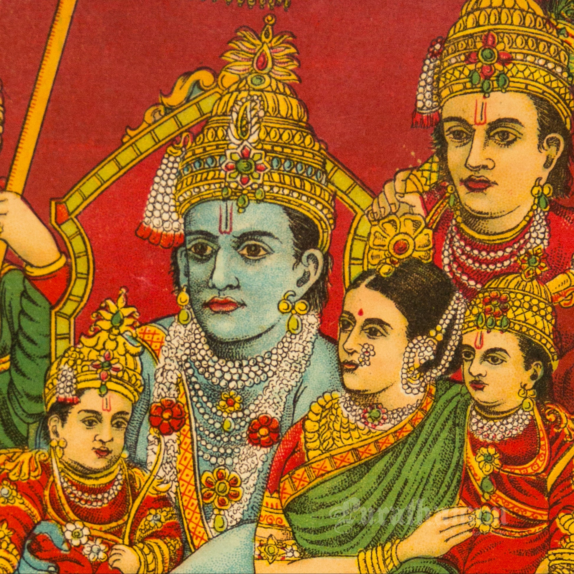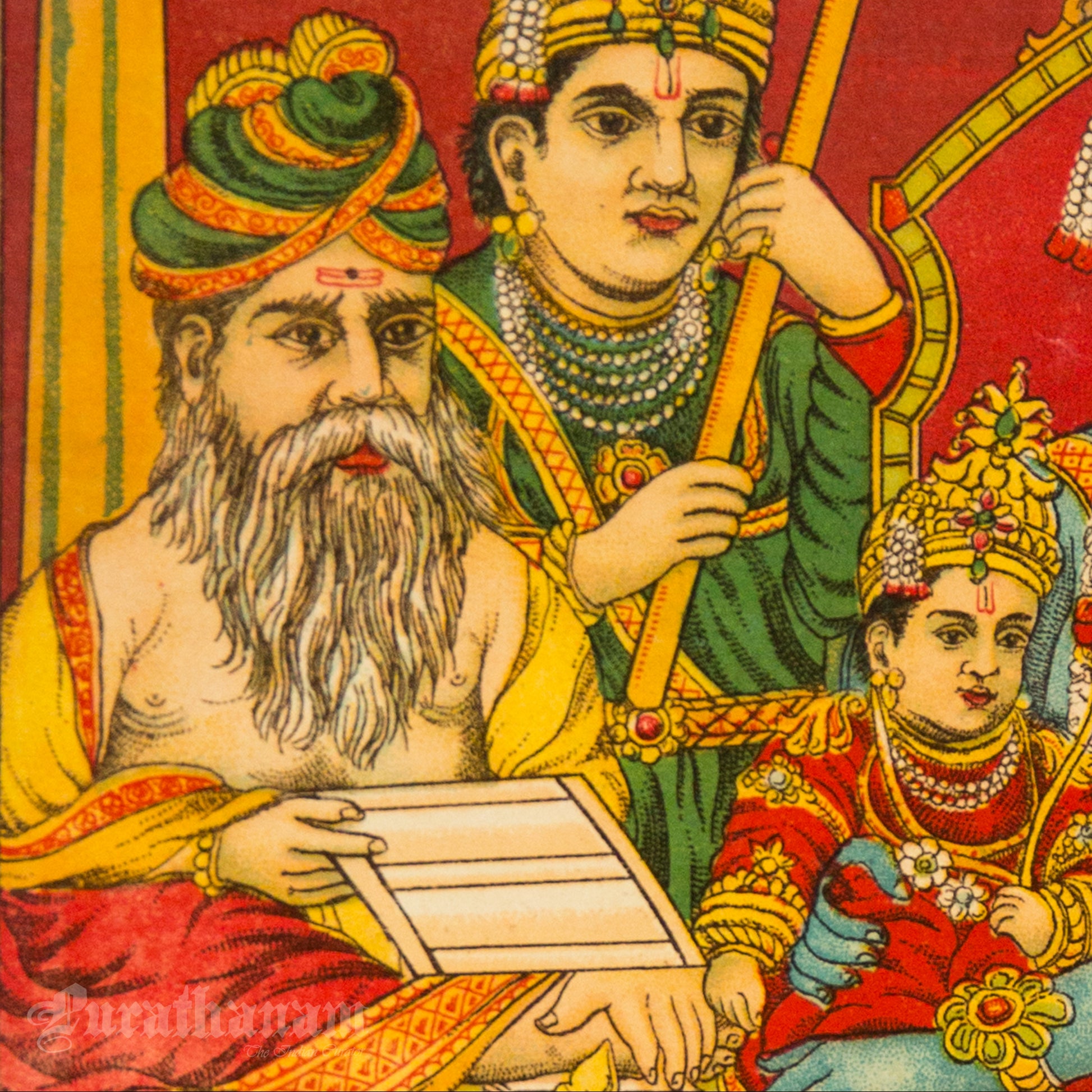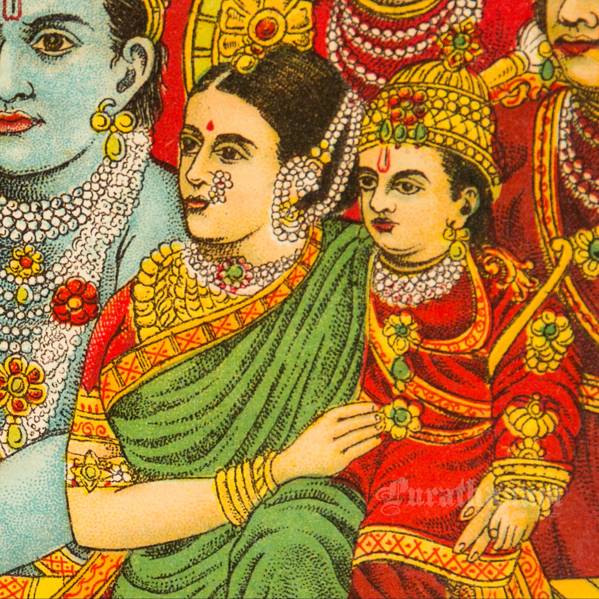 This is an oleograph print from 1920s- 1930s of Uttar Ram Charitra by Ravi Varma an Indian painter who achieved recognition for his depiction of scenes from the epics of the Mahabharata and Ramayana.