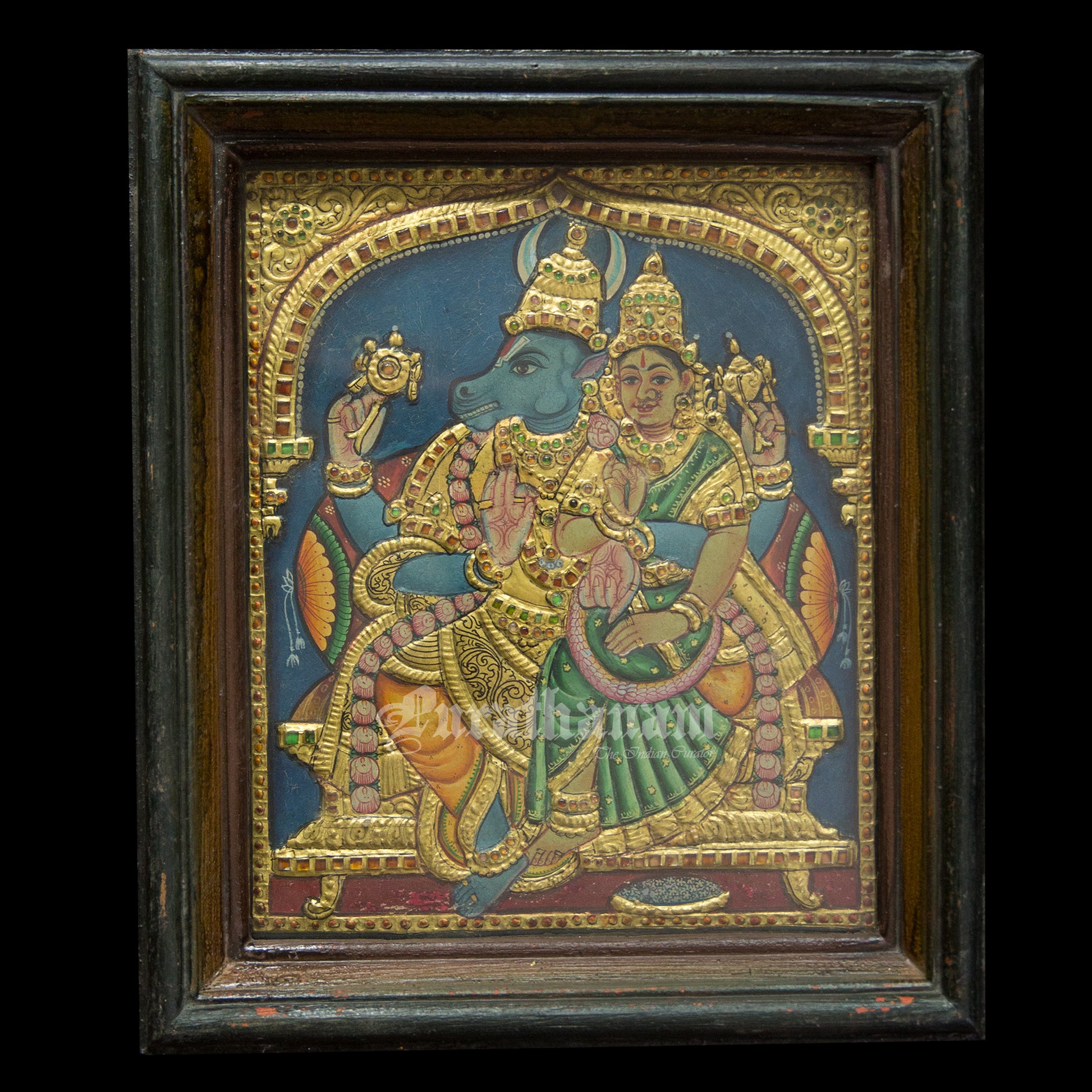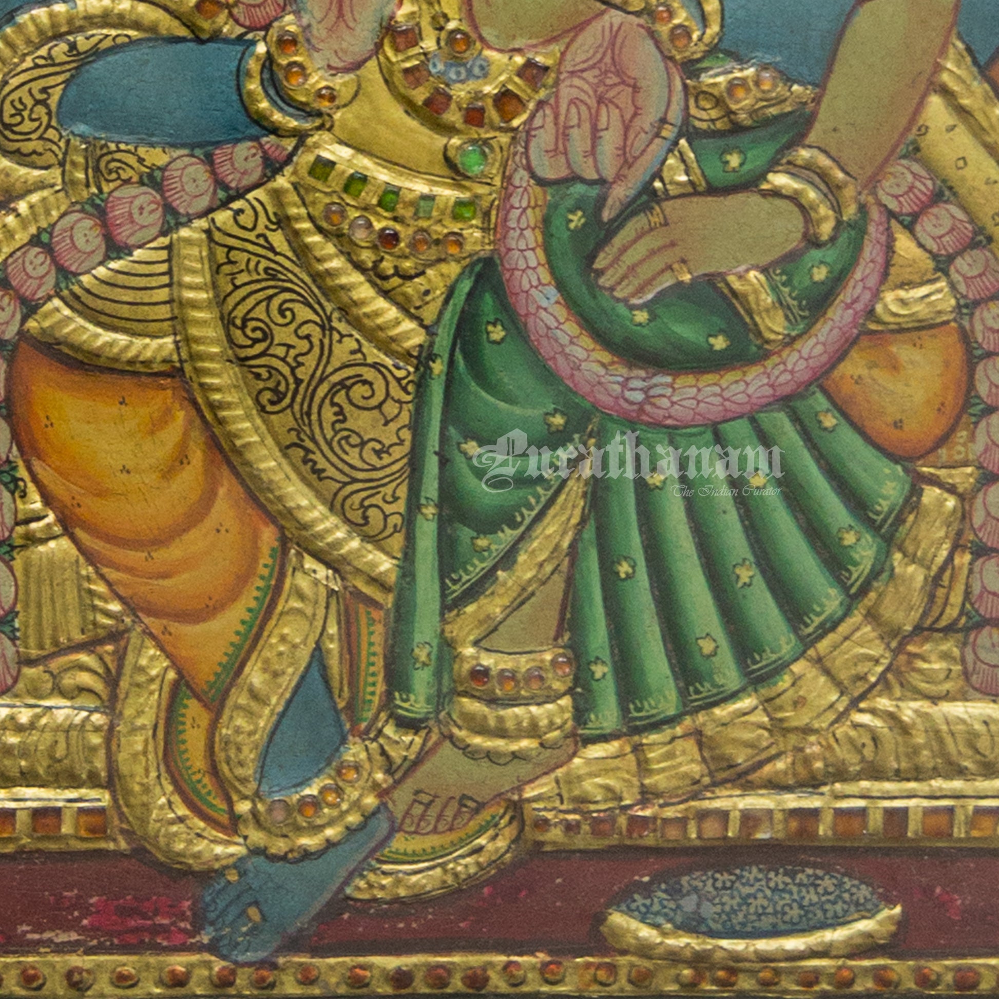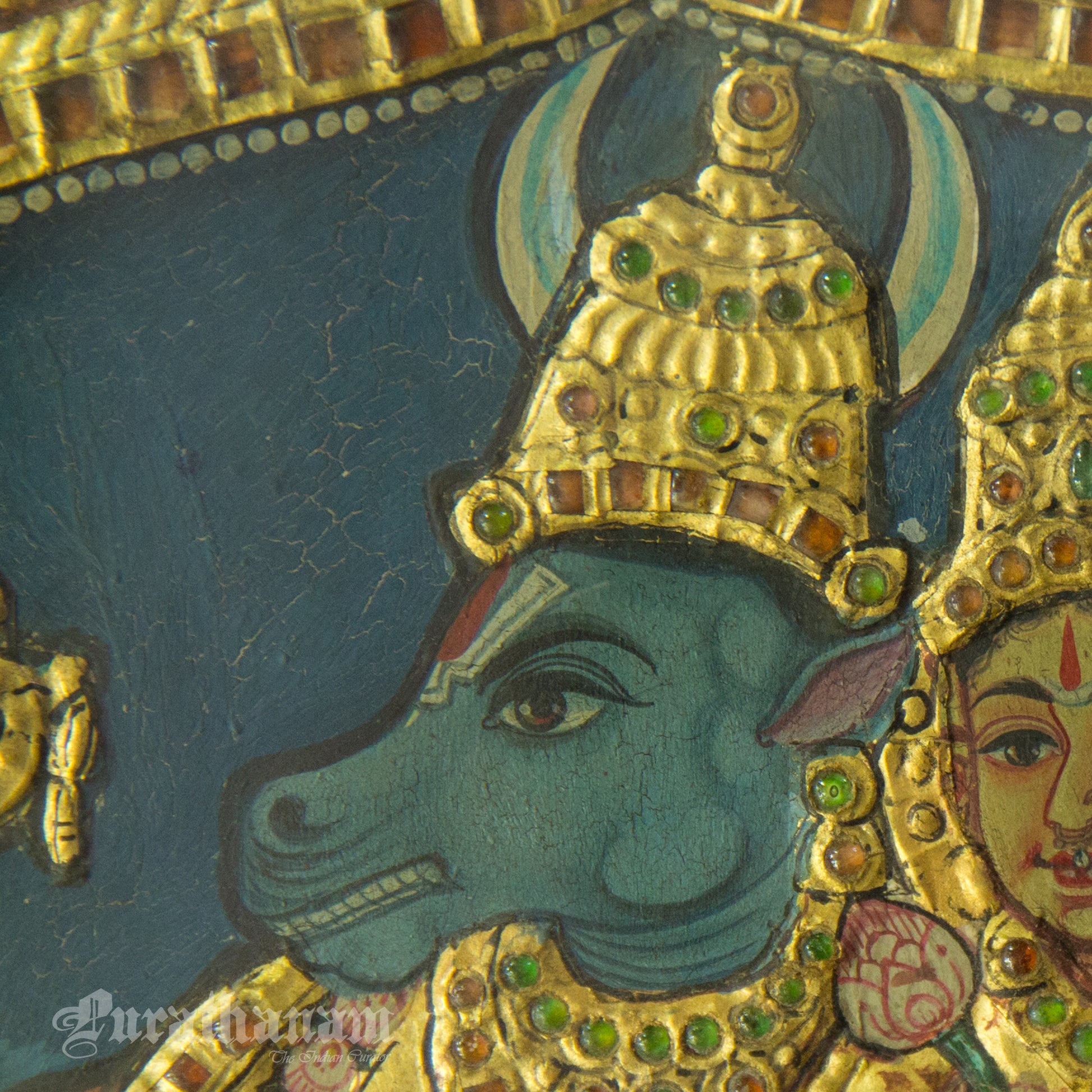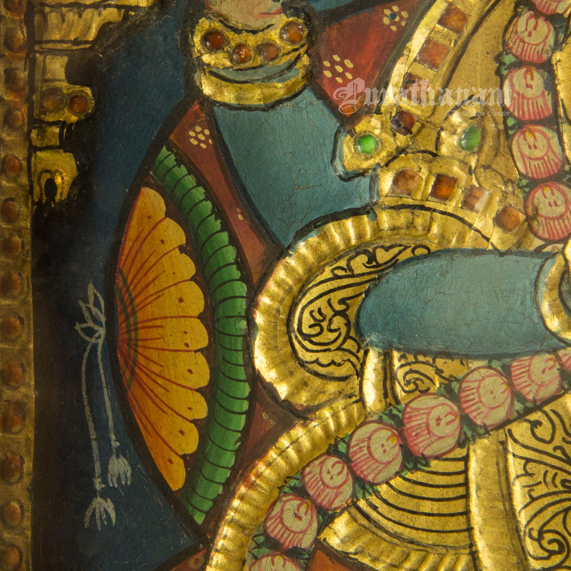 - Natural Colors: The color medium used in early Tanjavur paintings was made from organic vegetable dyes, resulting in lighter shades compared to modern-day Tanjore paintings. These natural colors were not affected by light exposure at the time, as the paintings were mostly kept indoors and lit by dim traditional lamps. However, with the invention of electricity and the use of brighter lighting, it became harder for these colors to survive over time.