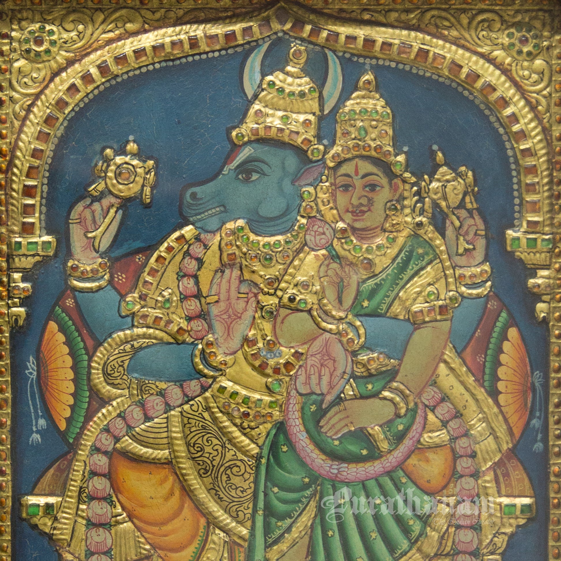 Here is a beautiful Tanjore painting of Varaha Lakshmi. Varaha (Boar) is the avatar of the Hindu deity Vishnu, in the form of a boar. Varaha is generally listed as third in the Dashavatara, the ten principal Avatars of Vishnu.