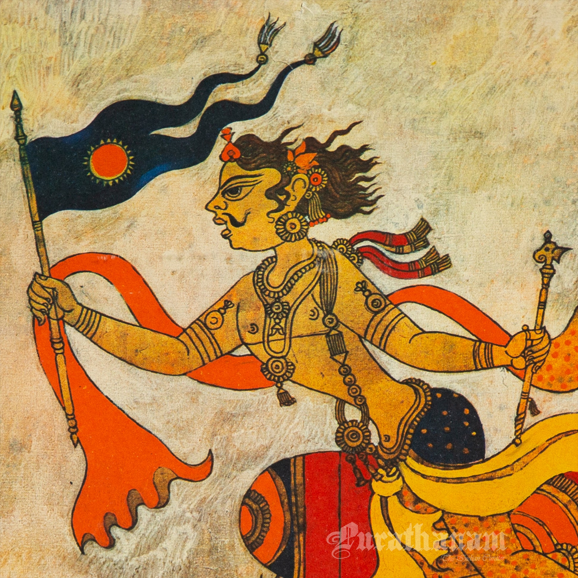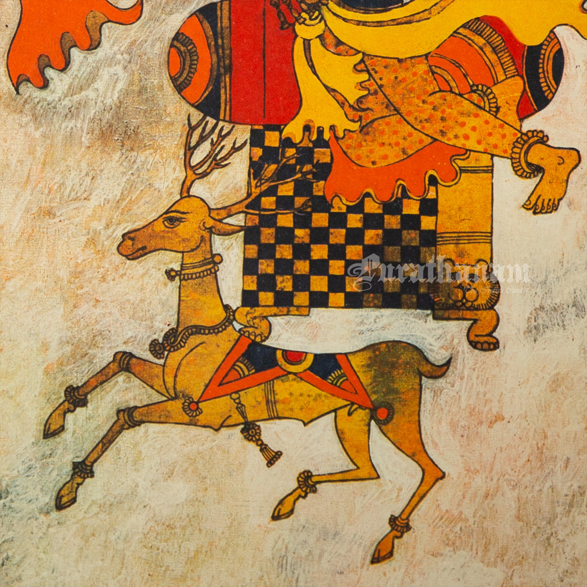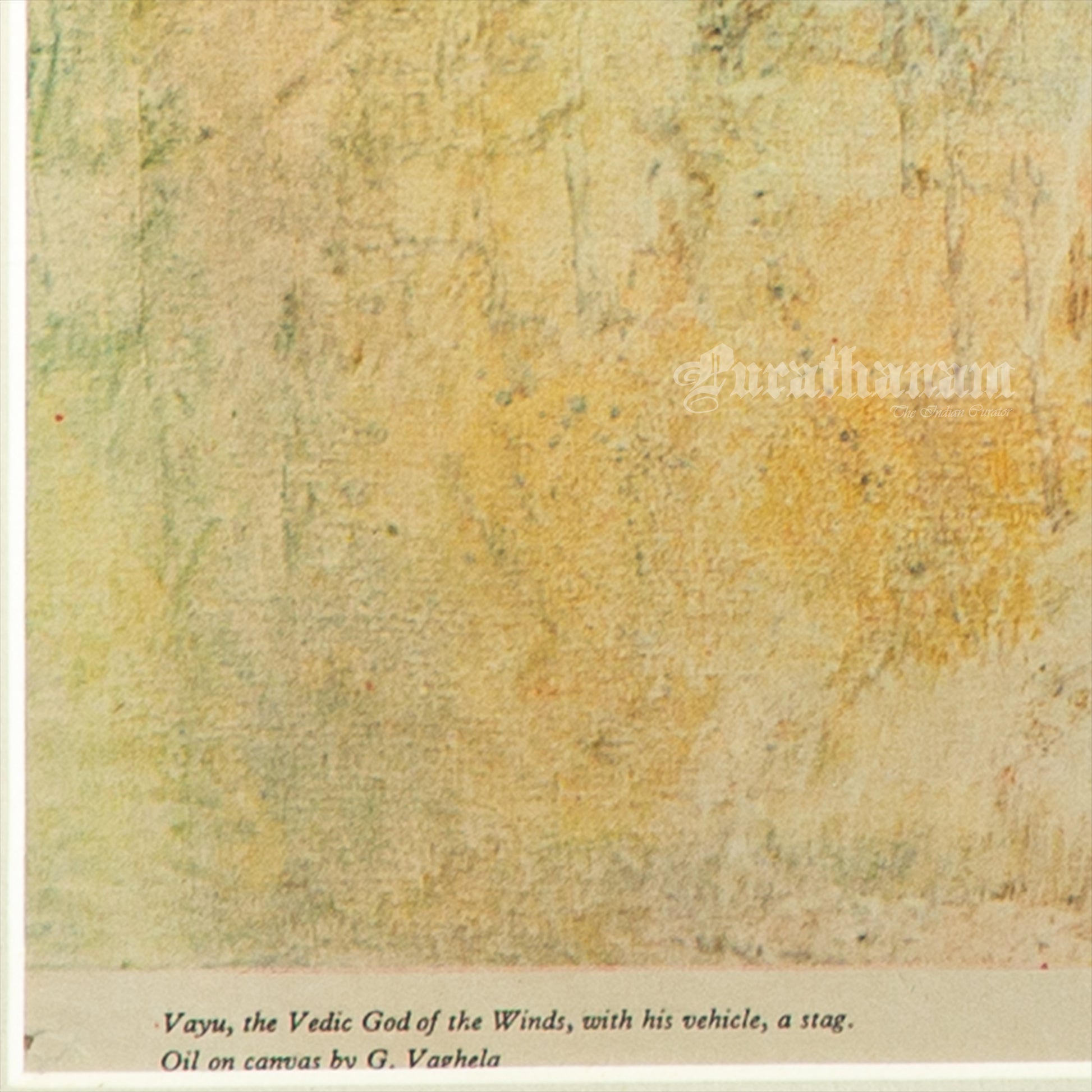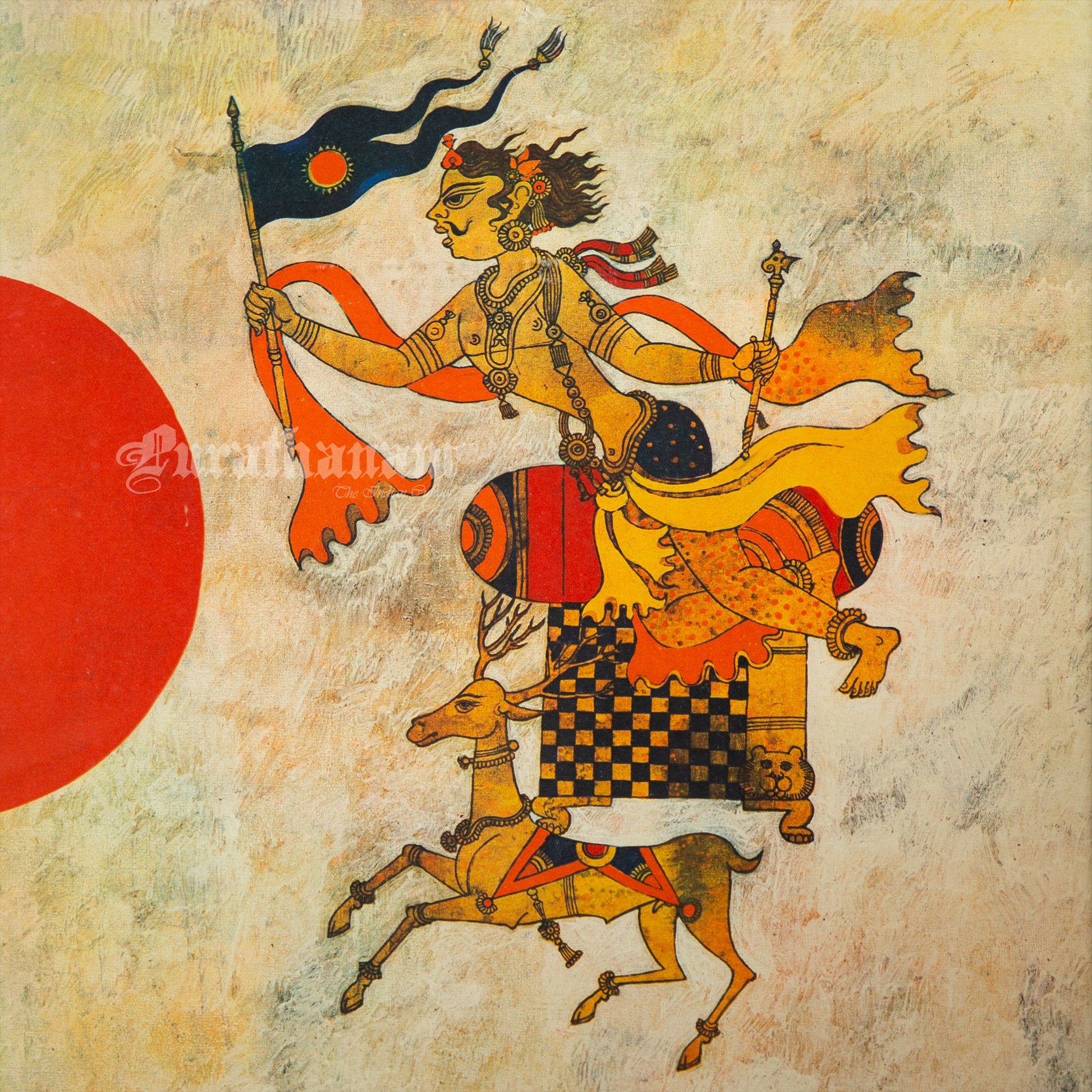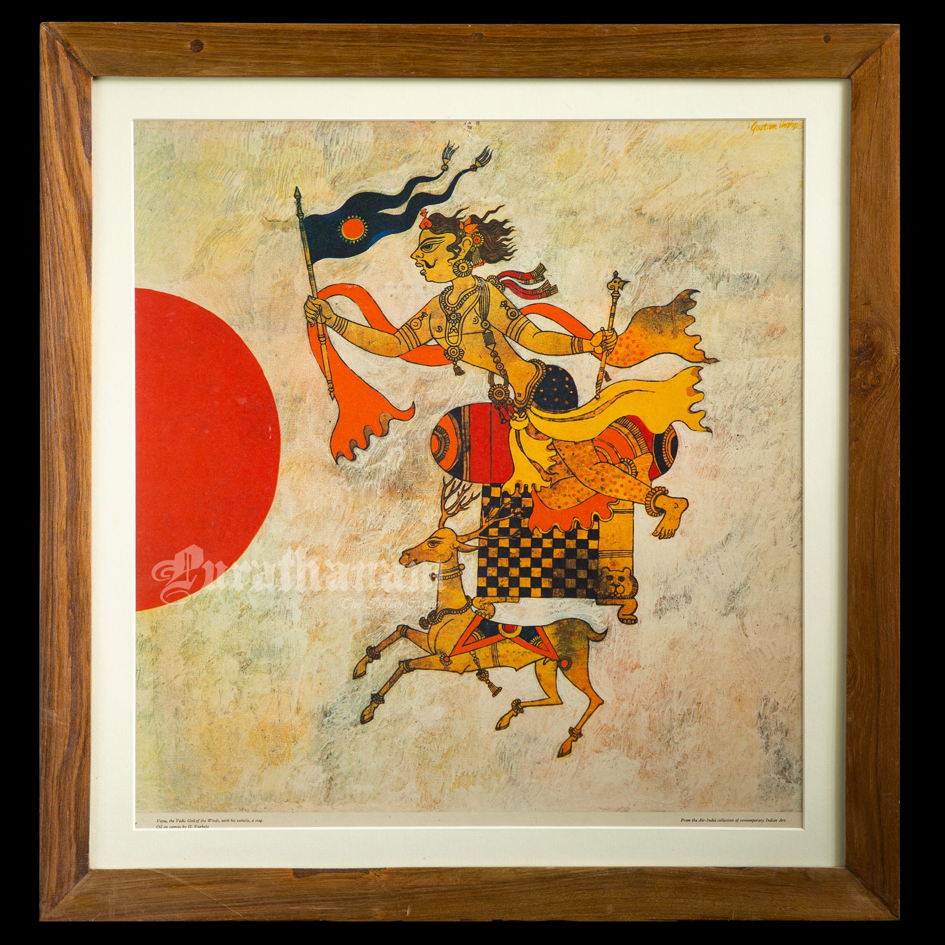 Here we have a limited edition print of Varuna from the Air-India collection of contemporary Indian art. This is originally an oil on canvas from the art collection of Air India and this print is one of their limited edition prints of Varuna, the vedic God of winds, with his vehicle a stag. This beautiful art is a work of a 20th century artist Gautham Vaghela.