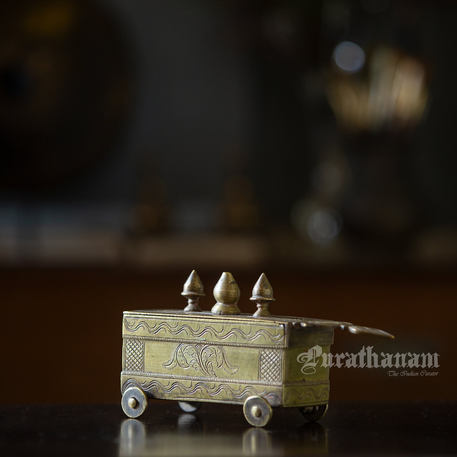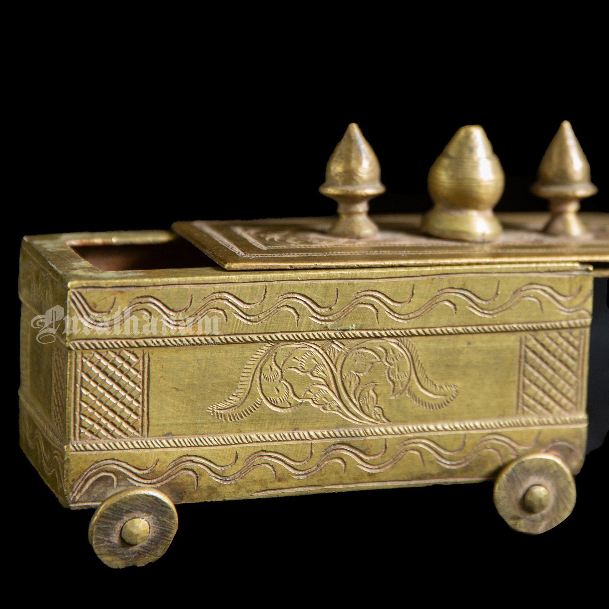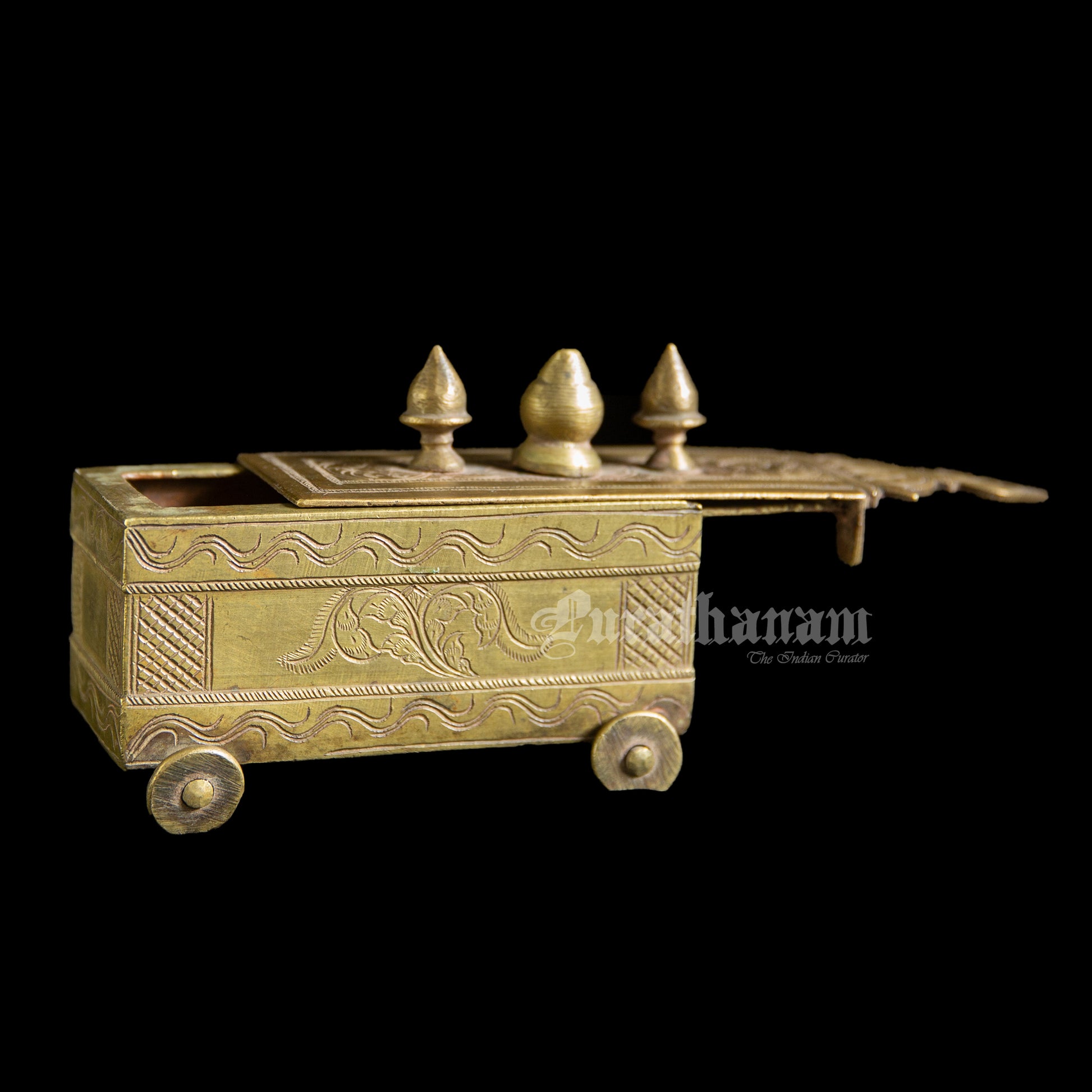 Here we have a beautiful designed vintage Bhasma box or vibhuti box (Holy ash) which has a sliding lid. It is all the way from Karnataka.