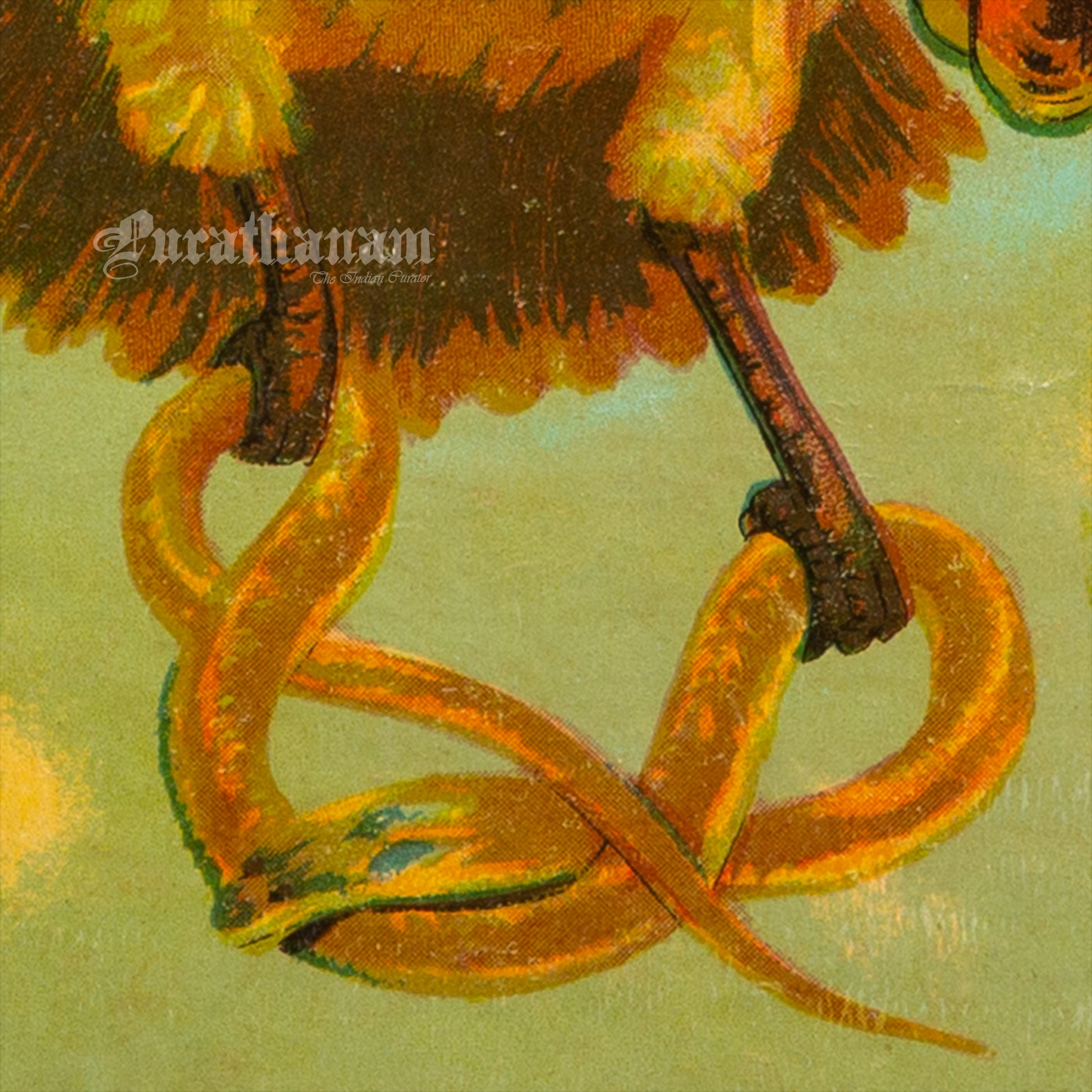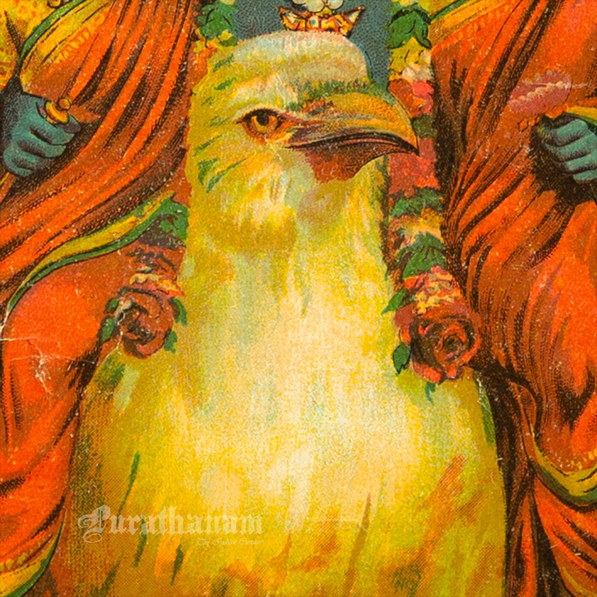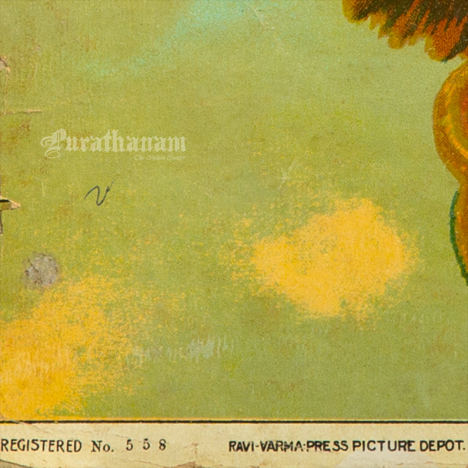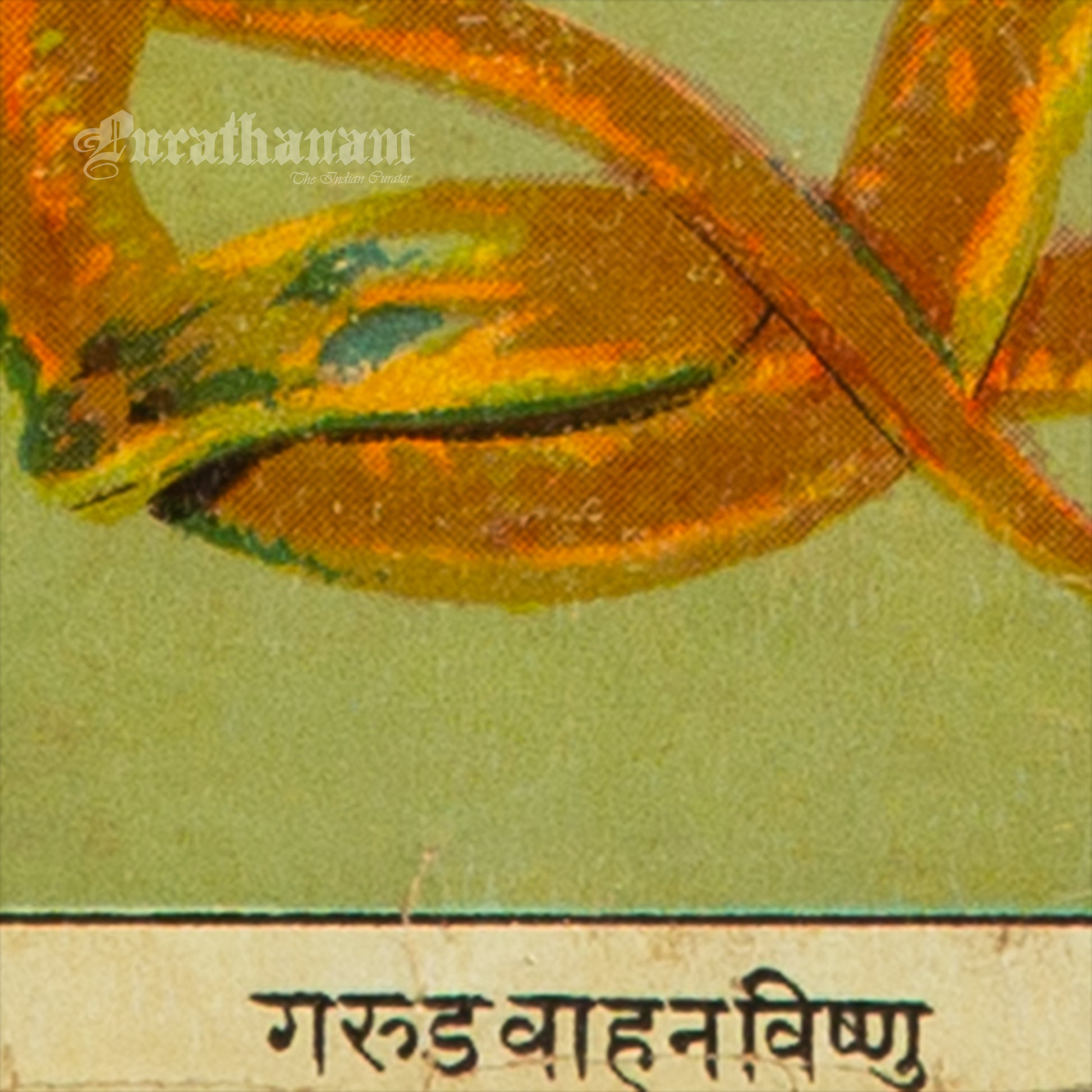This is an oleograph print from 1920s of Vishnu Garudwahan by Ravi Varma an Indian who achieved recognition for his depiction of scenes from the epics of the Mahabharata and Ramayana.