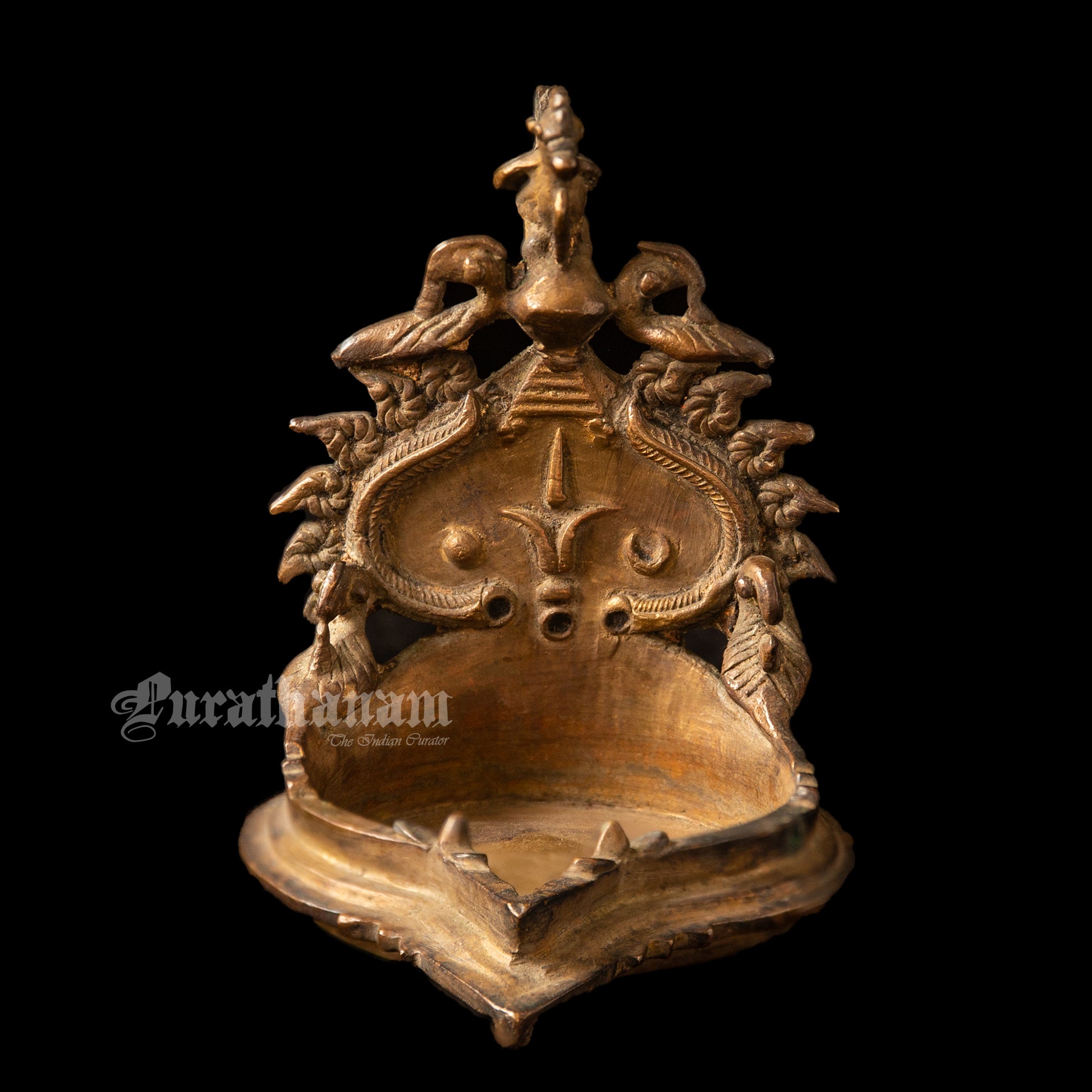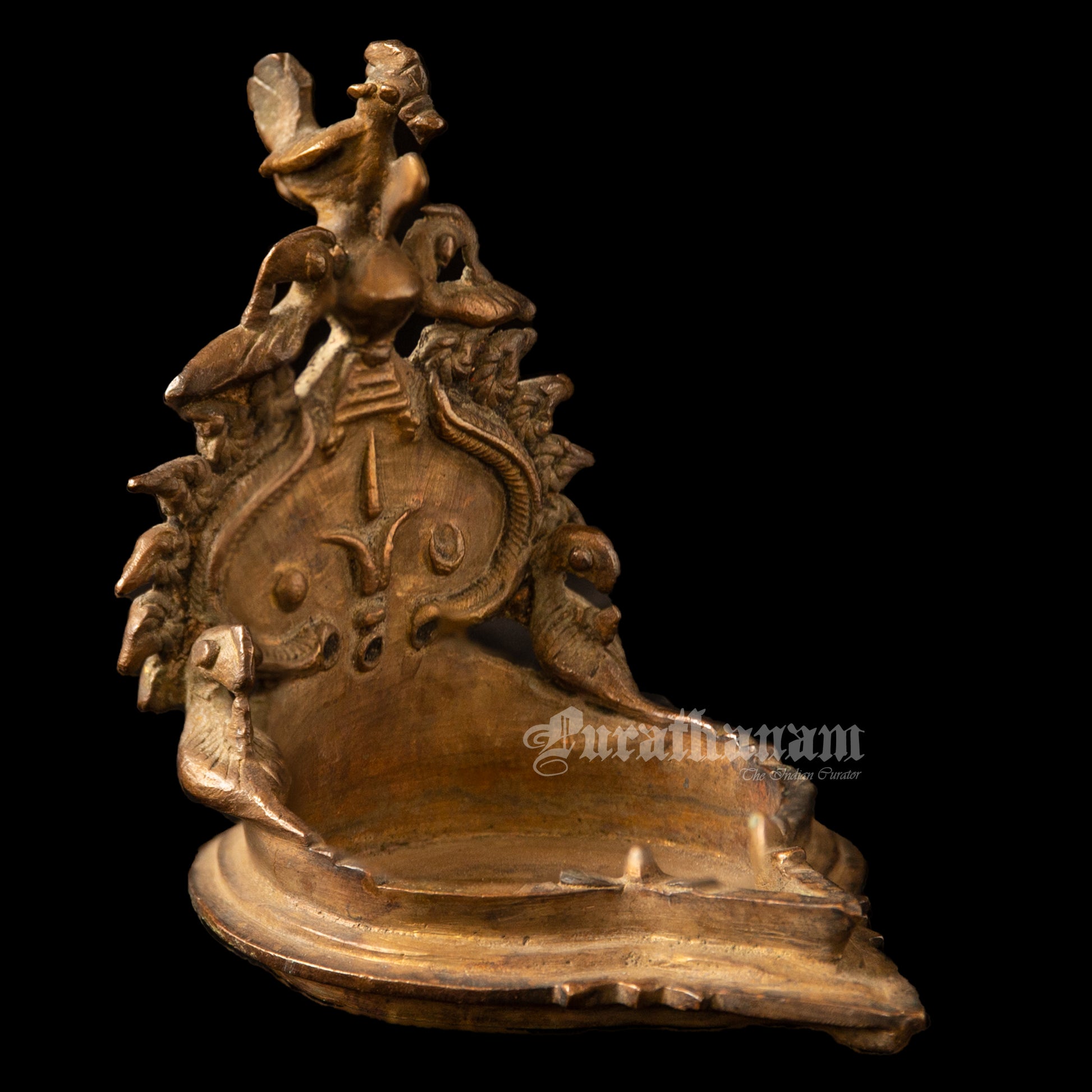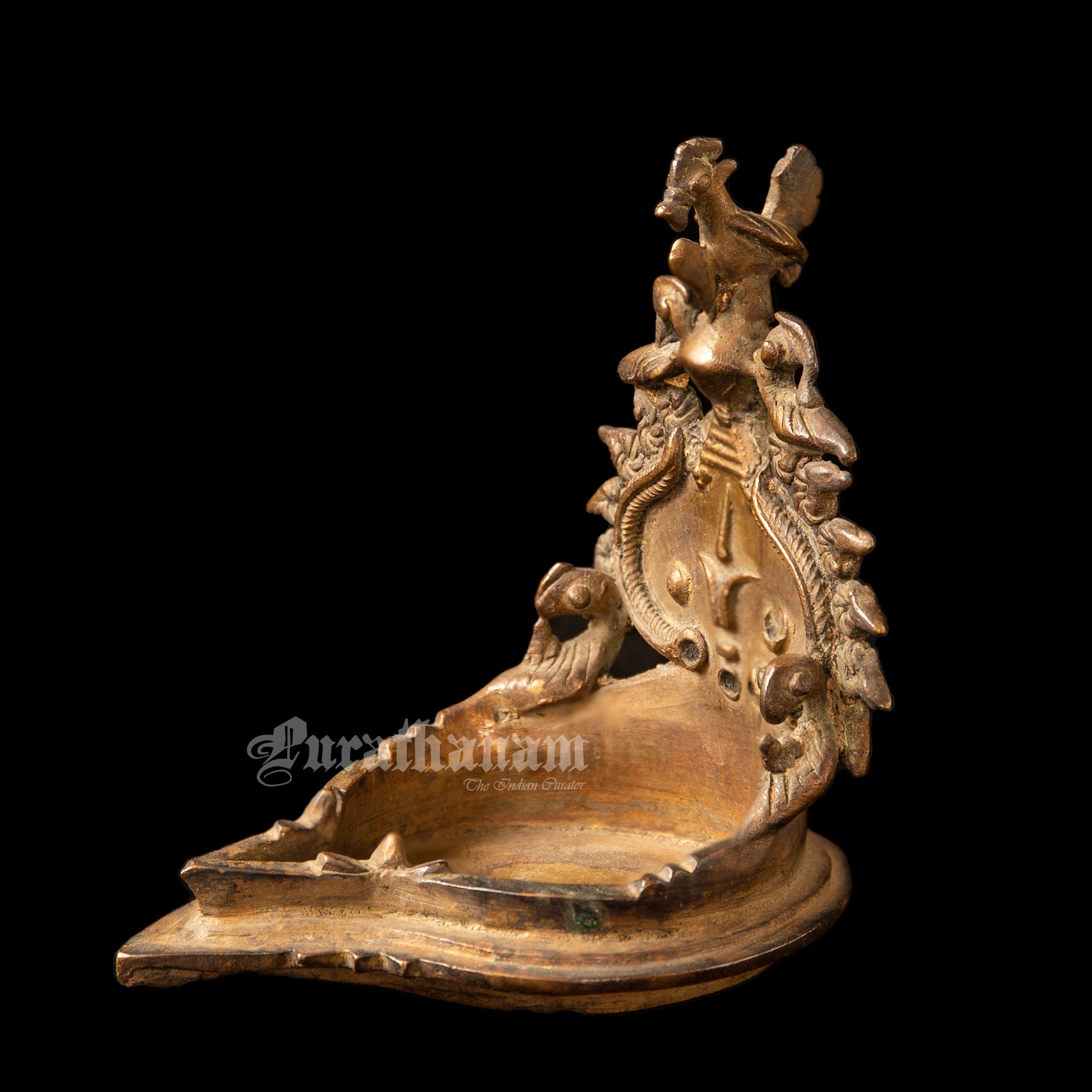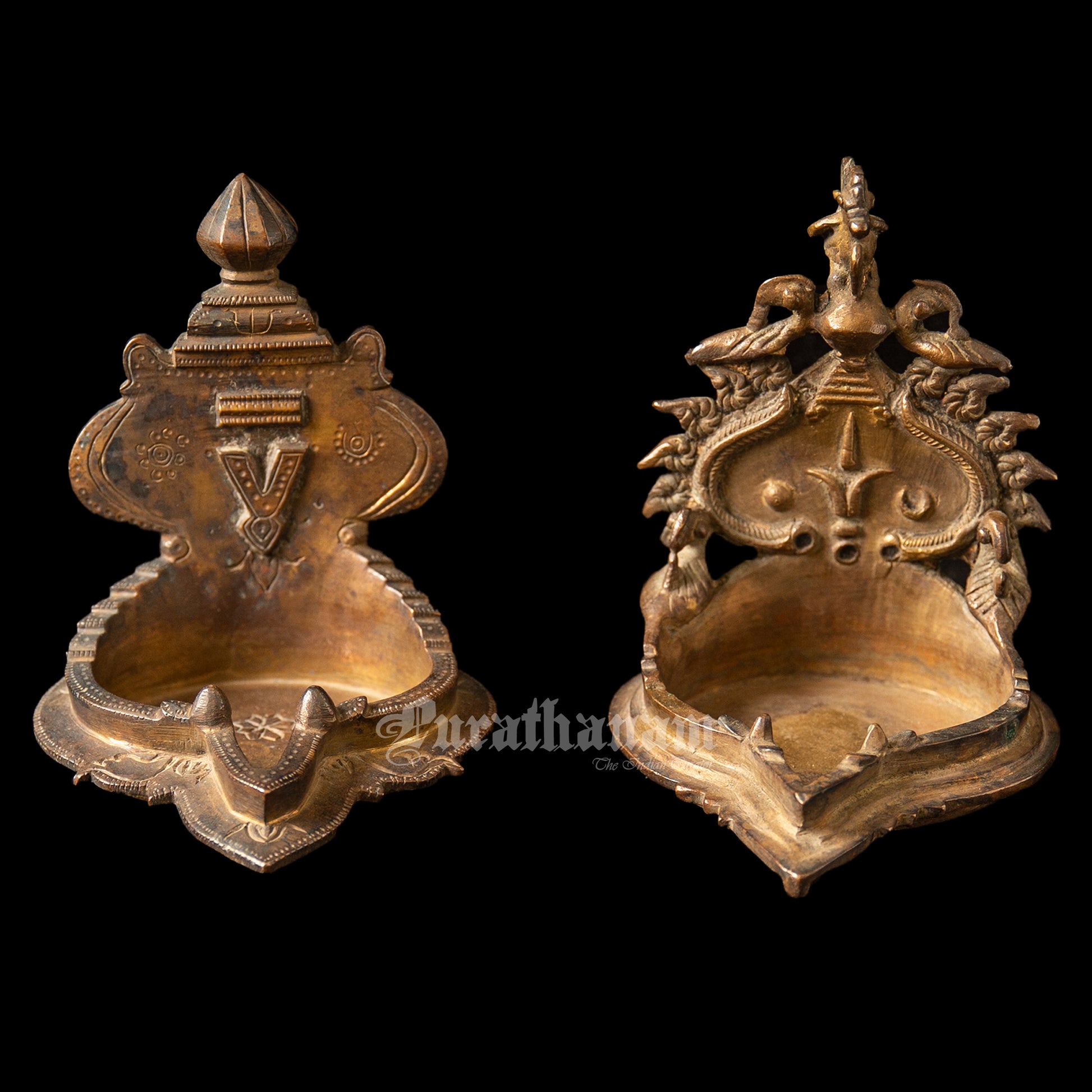 Here we have Vishnu Lakshmi votive oil lamp made of brass.. It has a beautiful hand carved pattern of sun and moon on the either sides of “Sricharanam” symbol of Lord Vishnu at the centre. It also has a peahen design carved on its crown and ornamented with conch motif around the lamp.