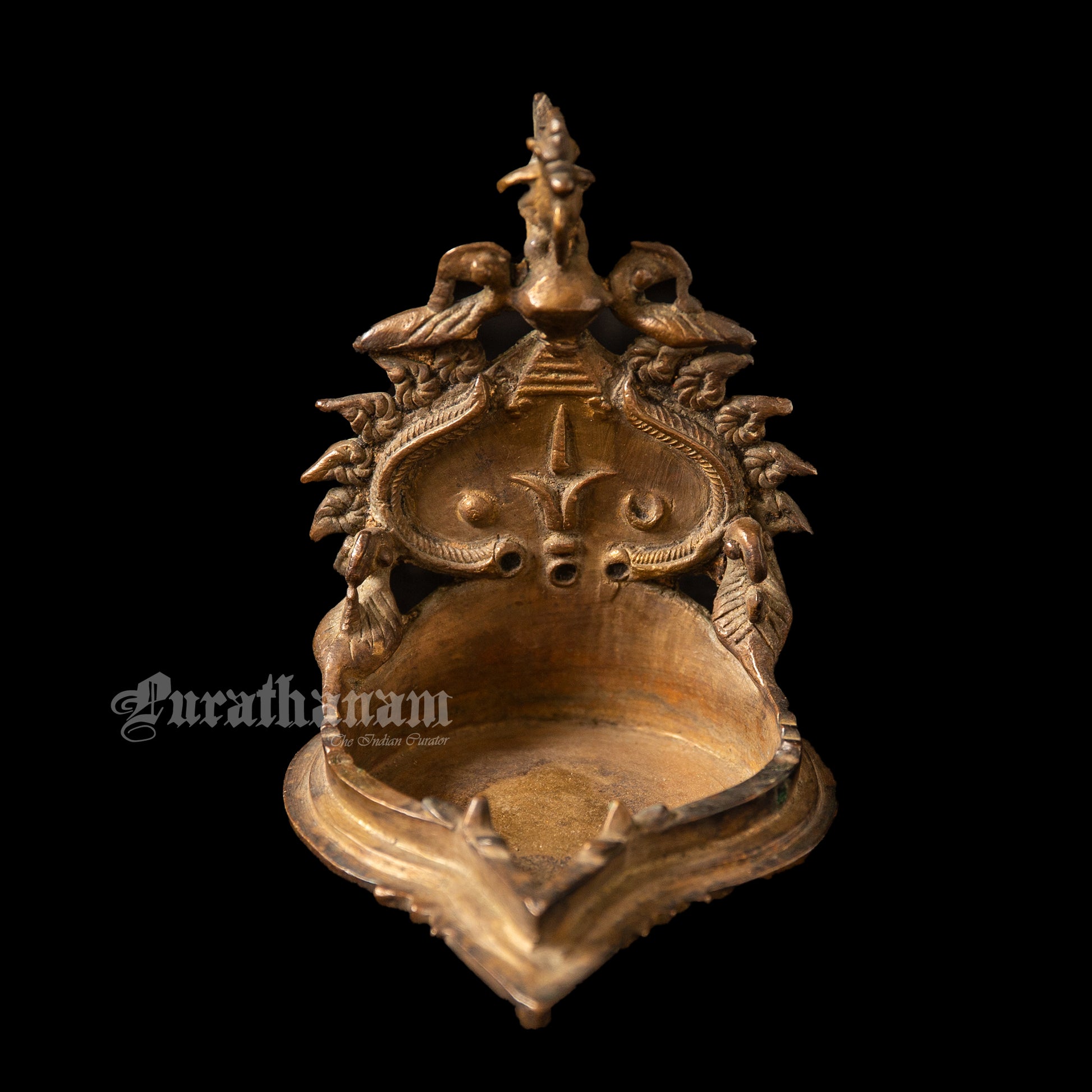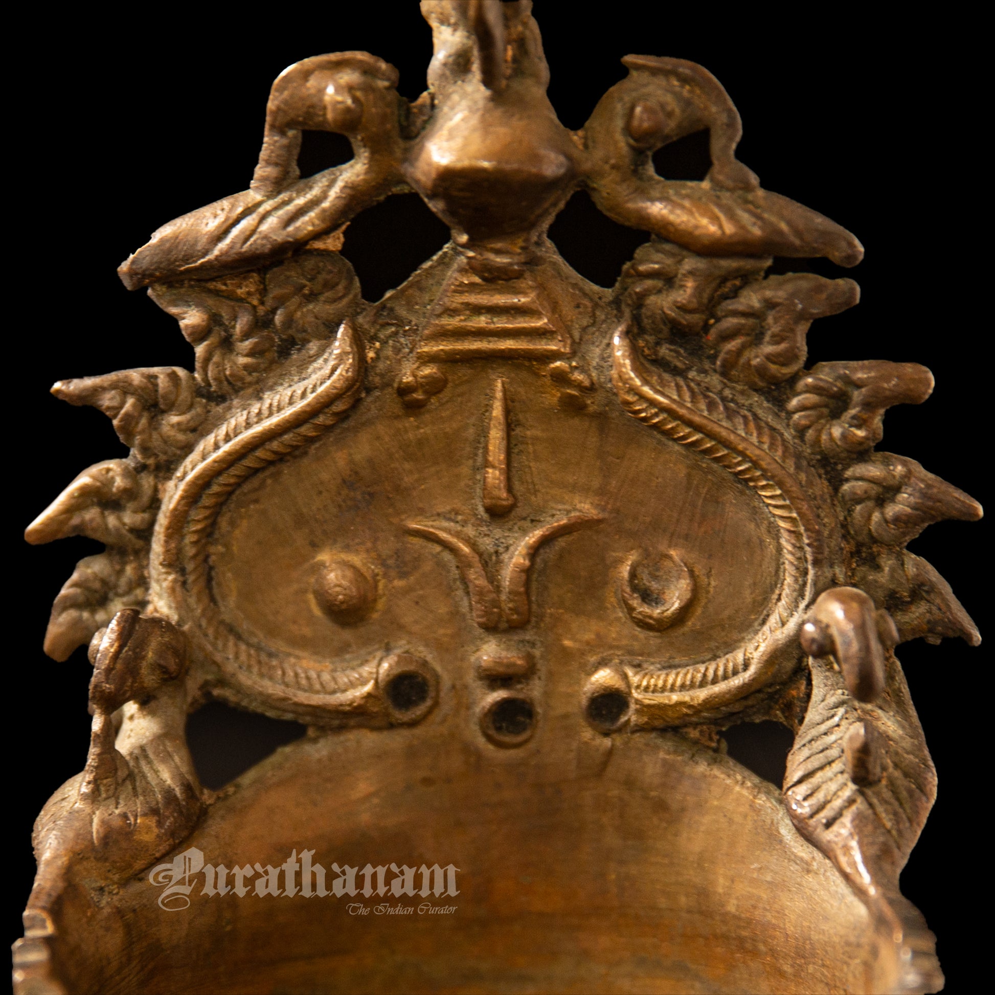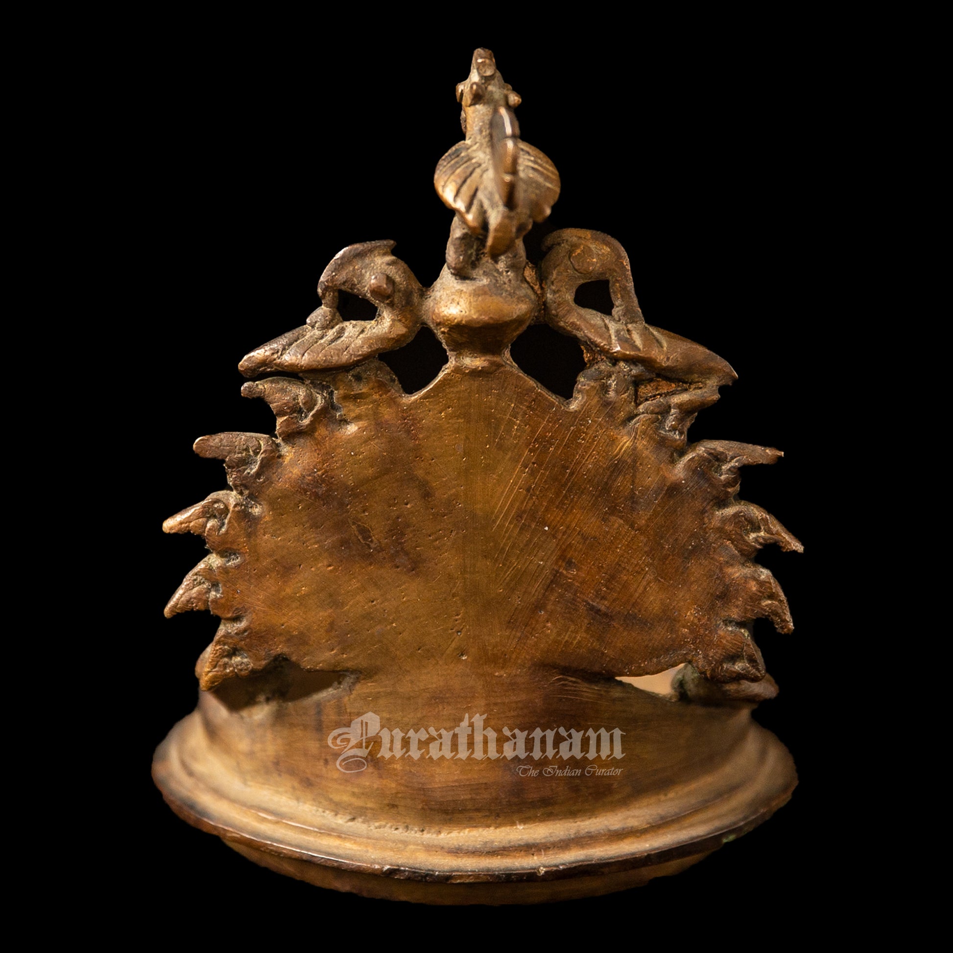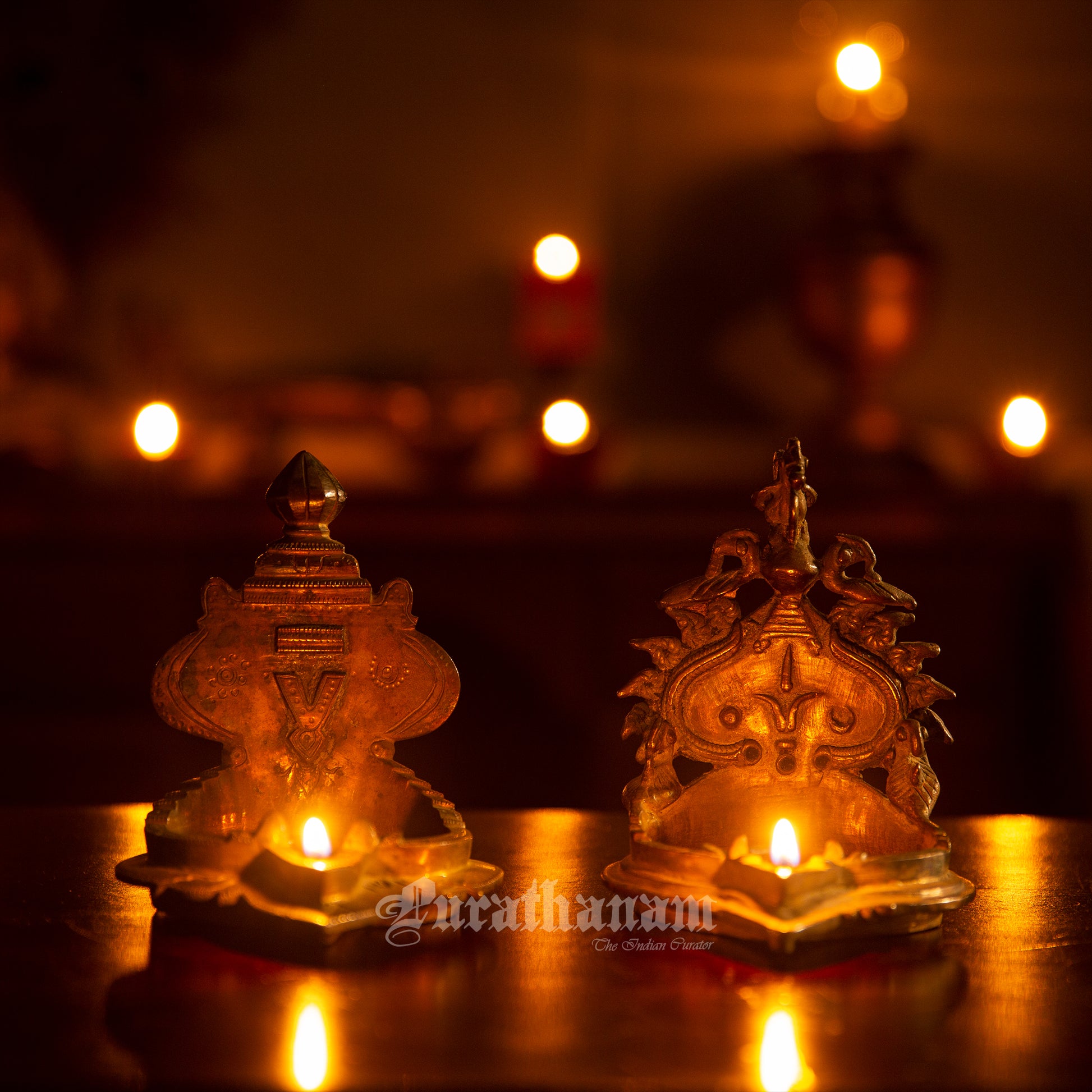 Here we have Vishnu Lakshmi votive oil lamp made of brass.. It has a beautiful hand carved pattern of sun and moon on the either sides of “Sricharanam” symbol of Lord Vishnu at the centre. It also has a peahen design carved on its crown and ornamented with conch motif around the lamp.