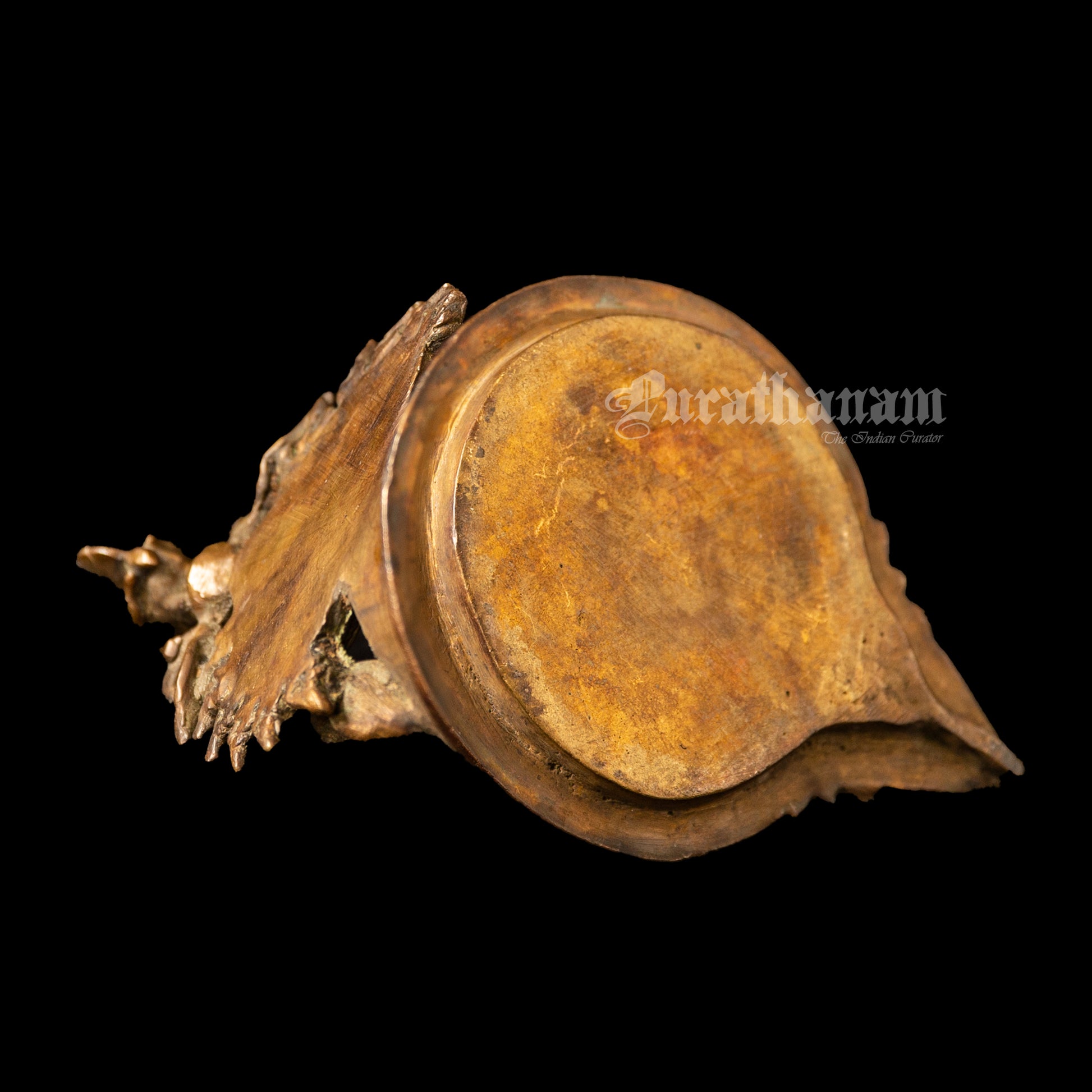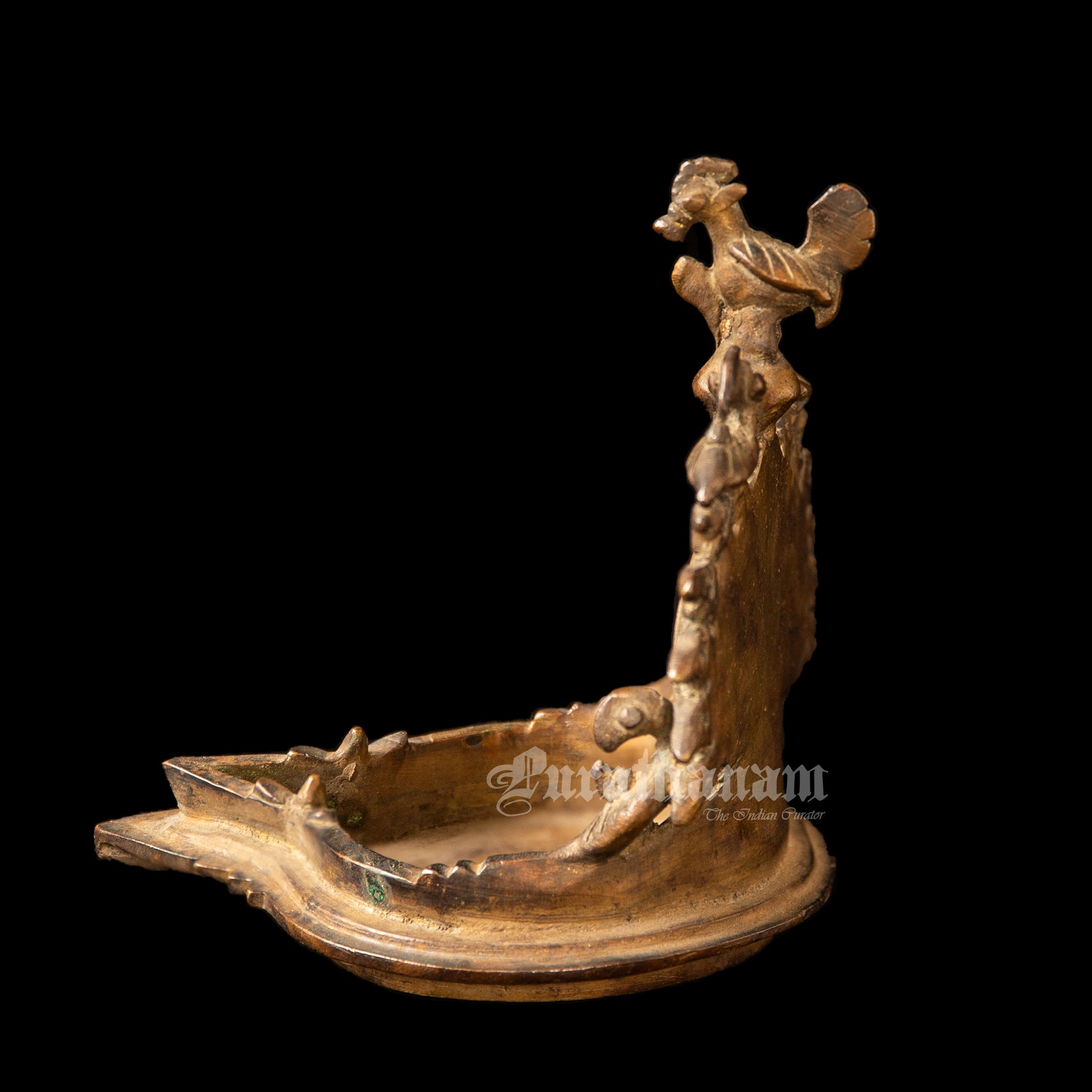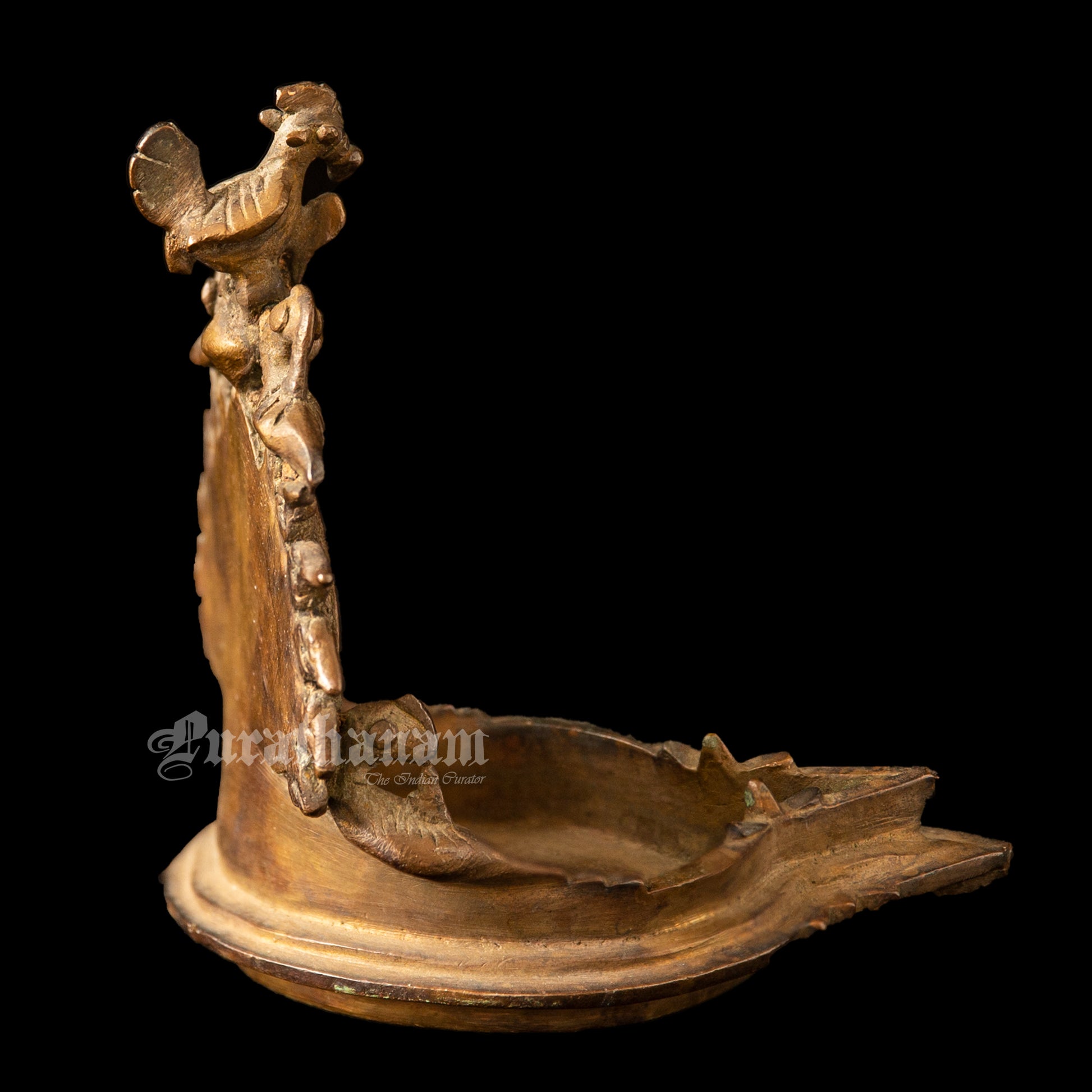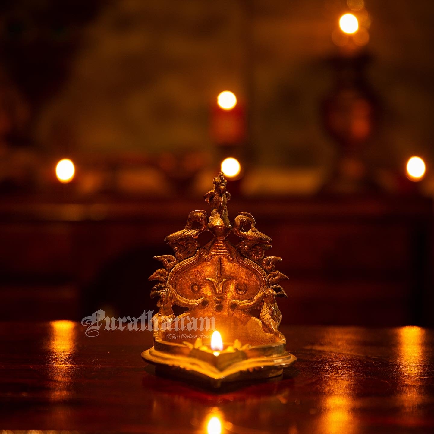 Here we have Vishnu Lakshmi votive oil lamp made of brass.. It has a beautiful hand carved pattern of sun and moon on the either sides of “Sricharanam” symbol of Lord Vishnu at the centre. It also has a peahen design carved on its crown and ornamented with conch motif around the lamp.