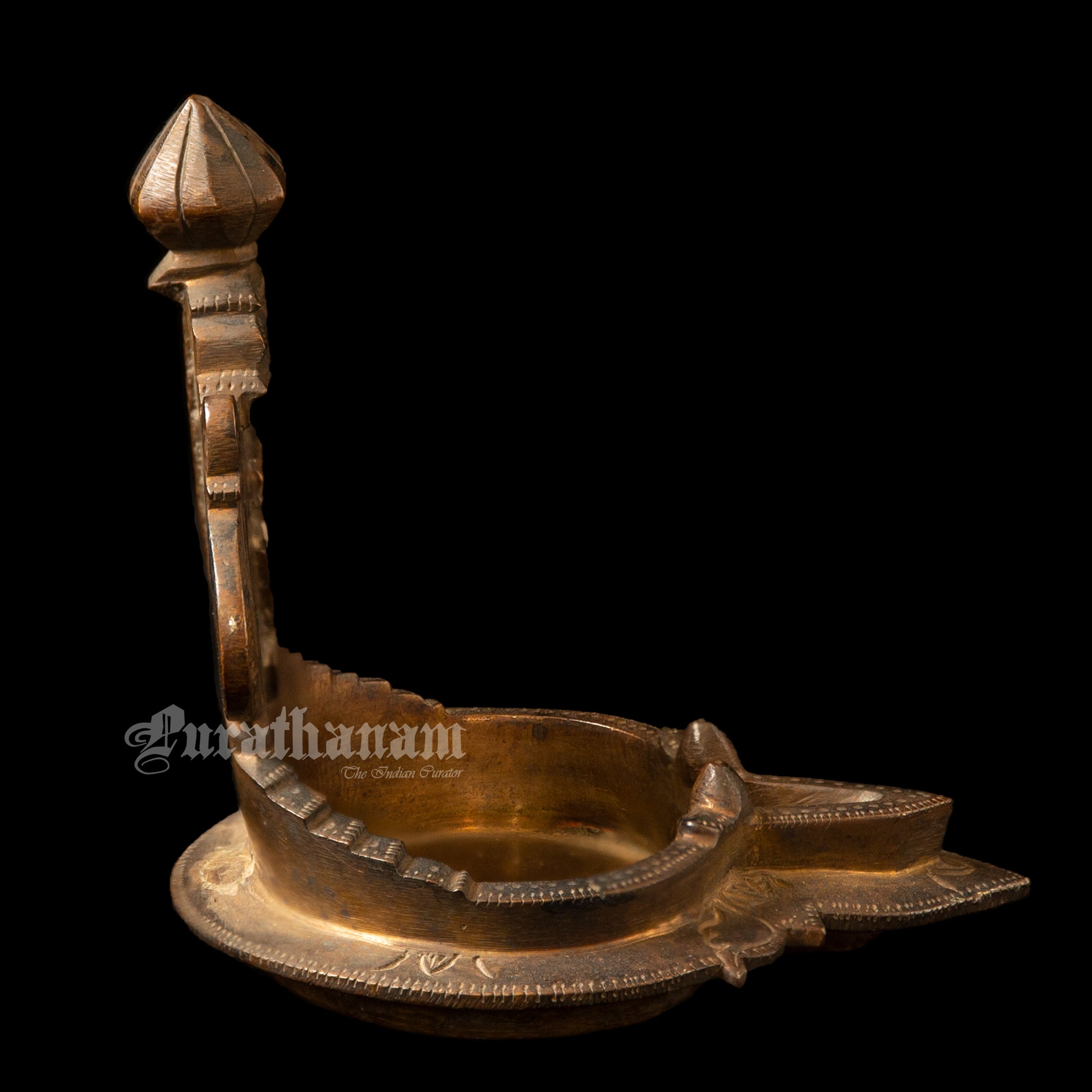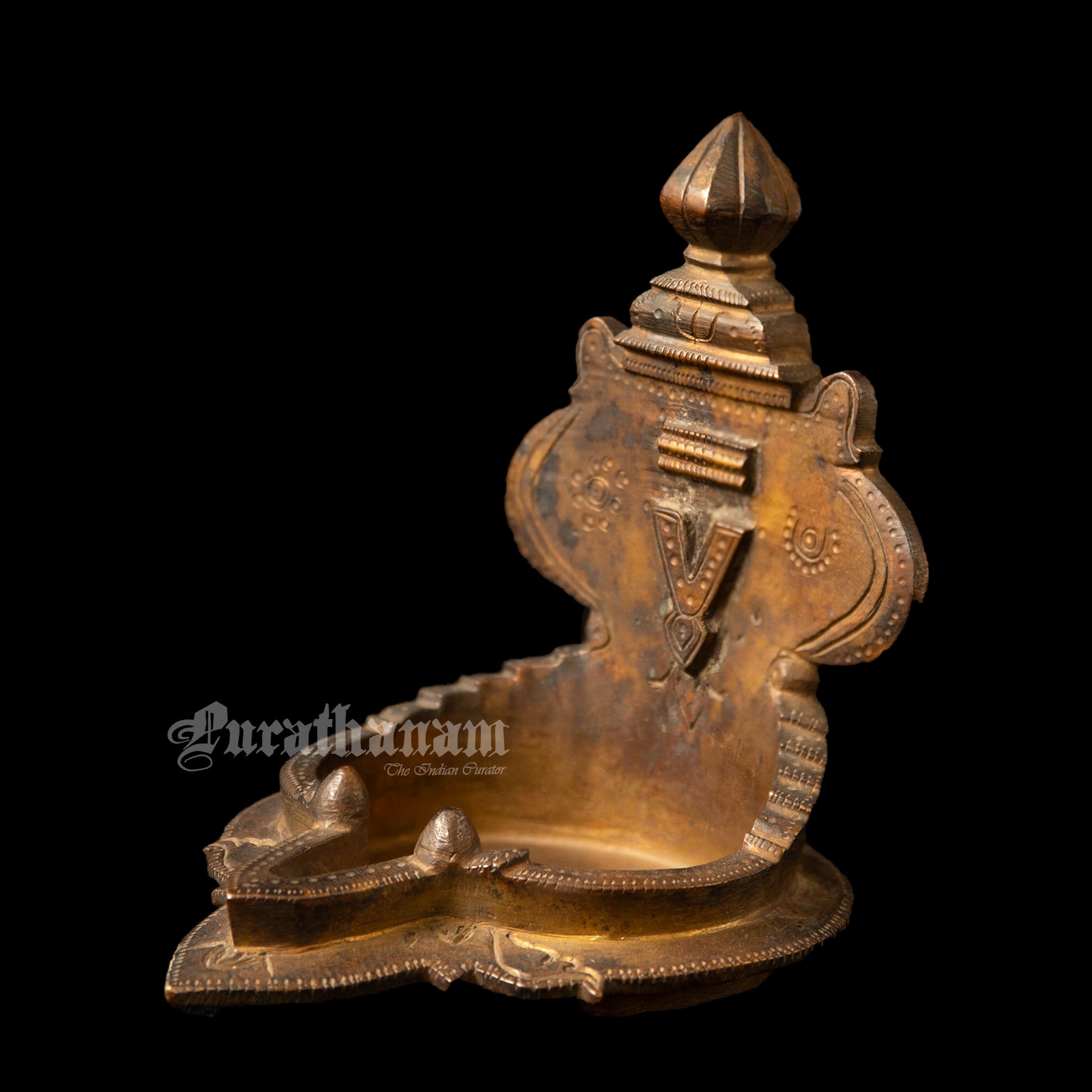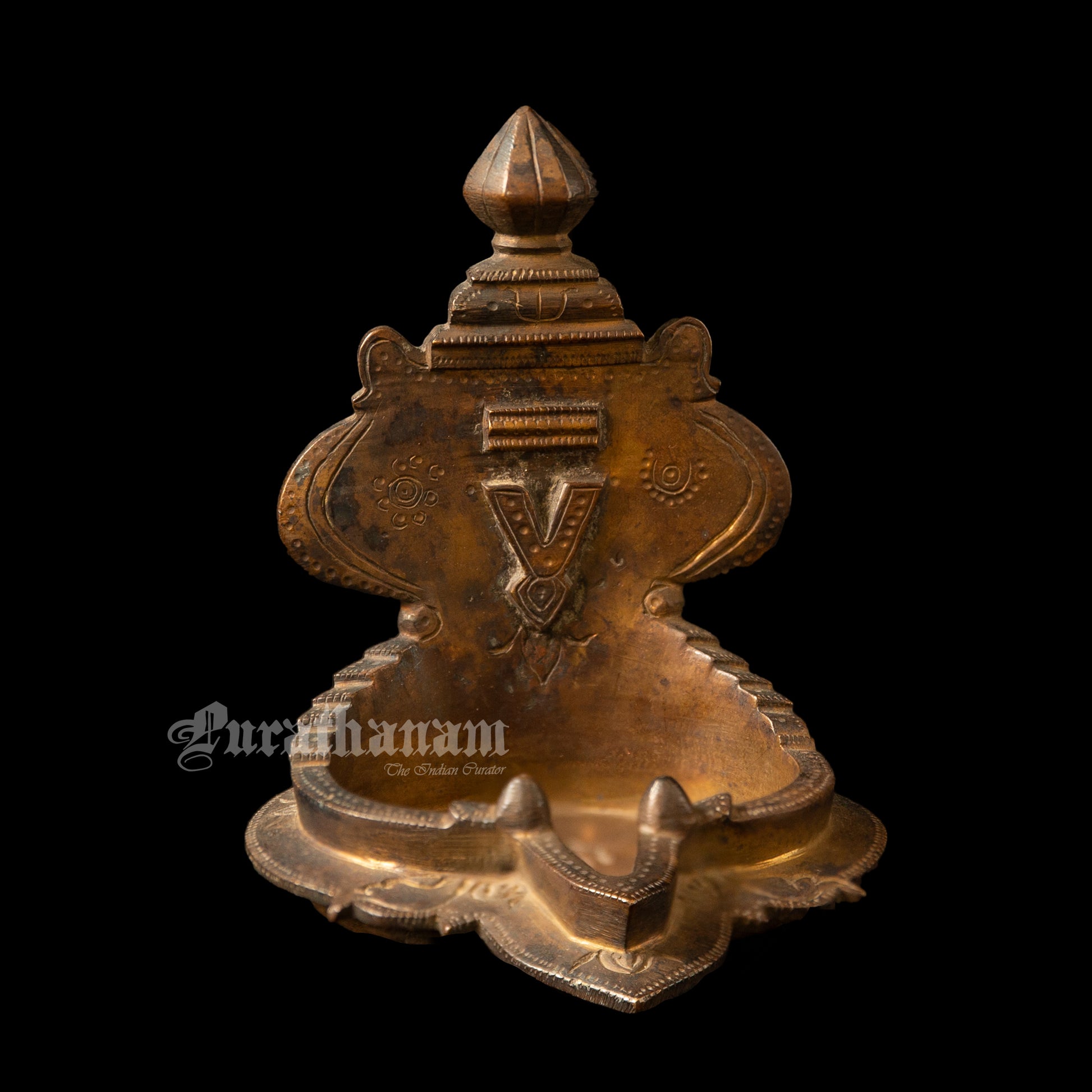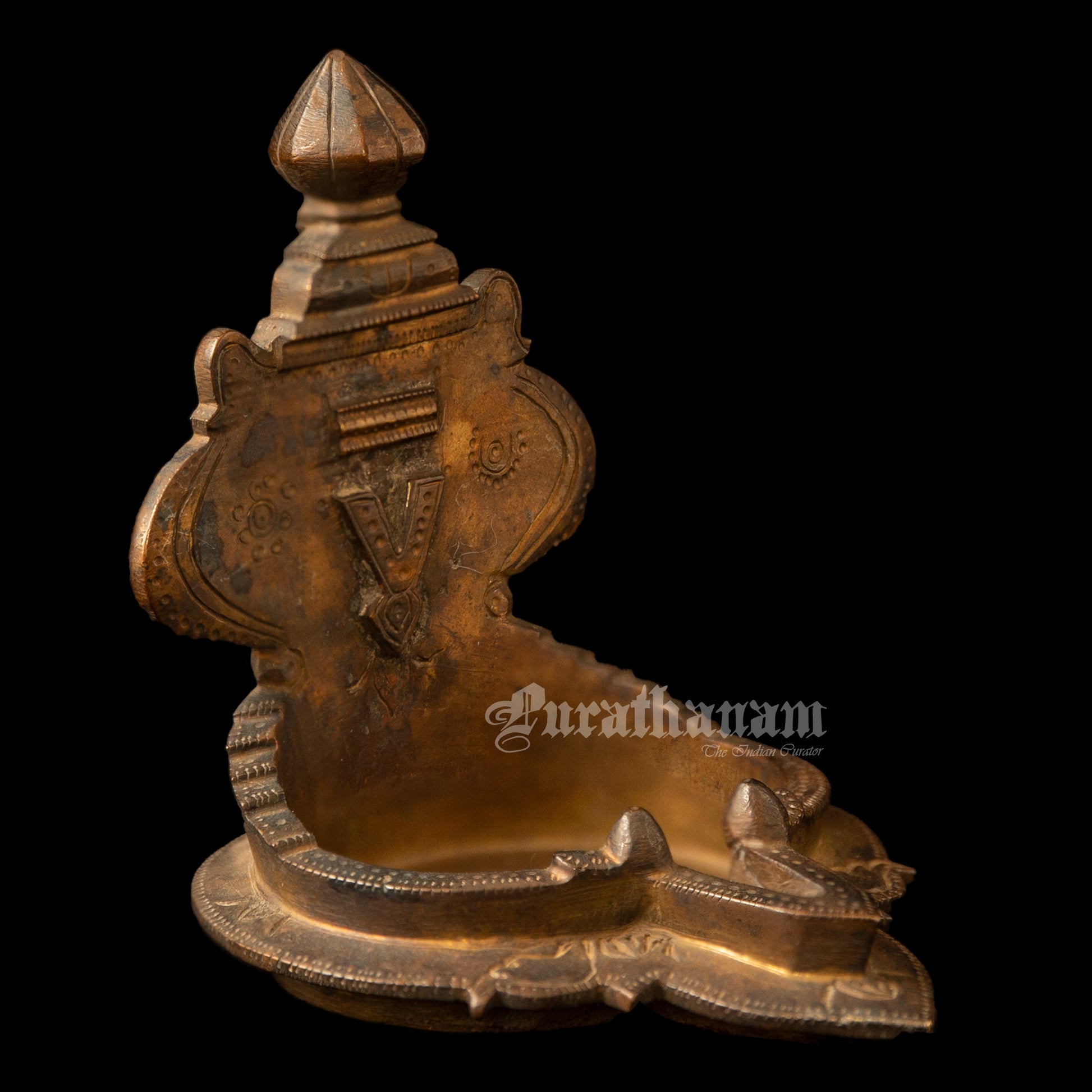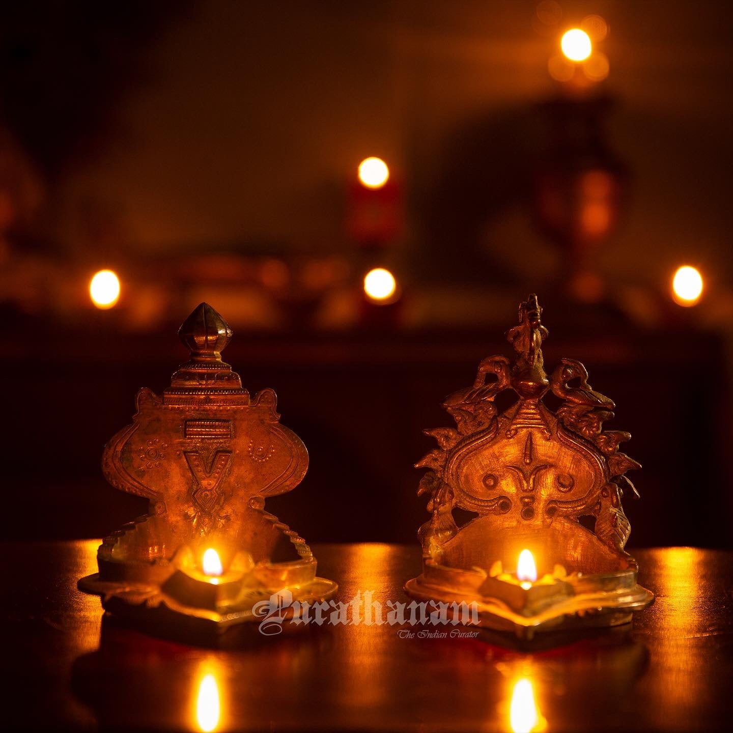 Here we have Vishnu Lakshmi votive oil lamp made of brass.. It has a beautiful hand carved pattern of sun and moon on the either sides of “Sricharanam” symbol of Lord Vishnu at the centre. It also has a flower design carved in the middle of the oil well.