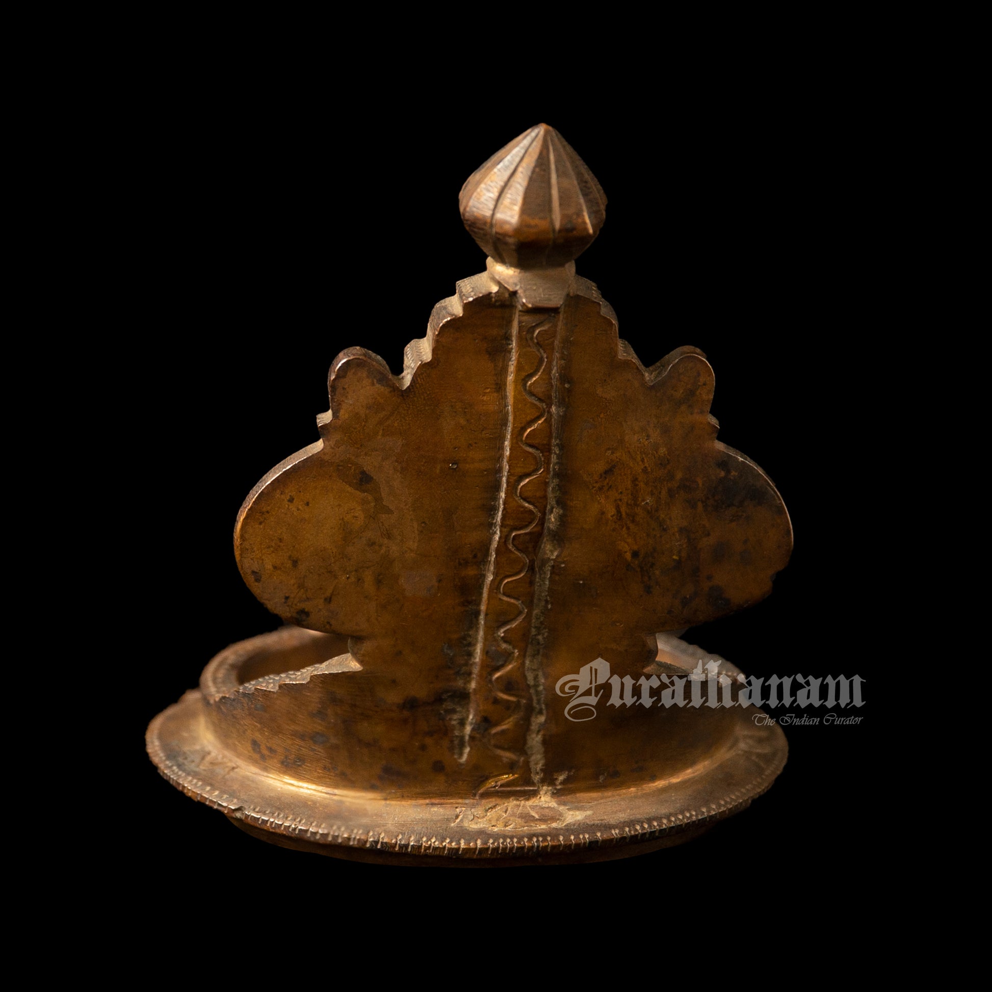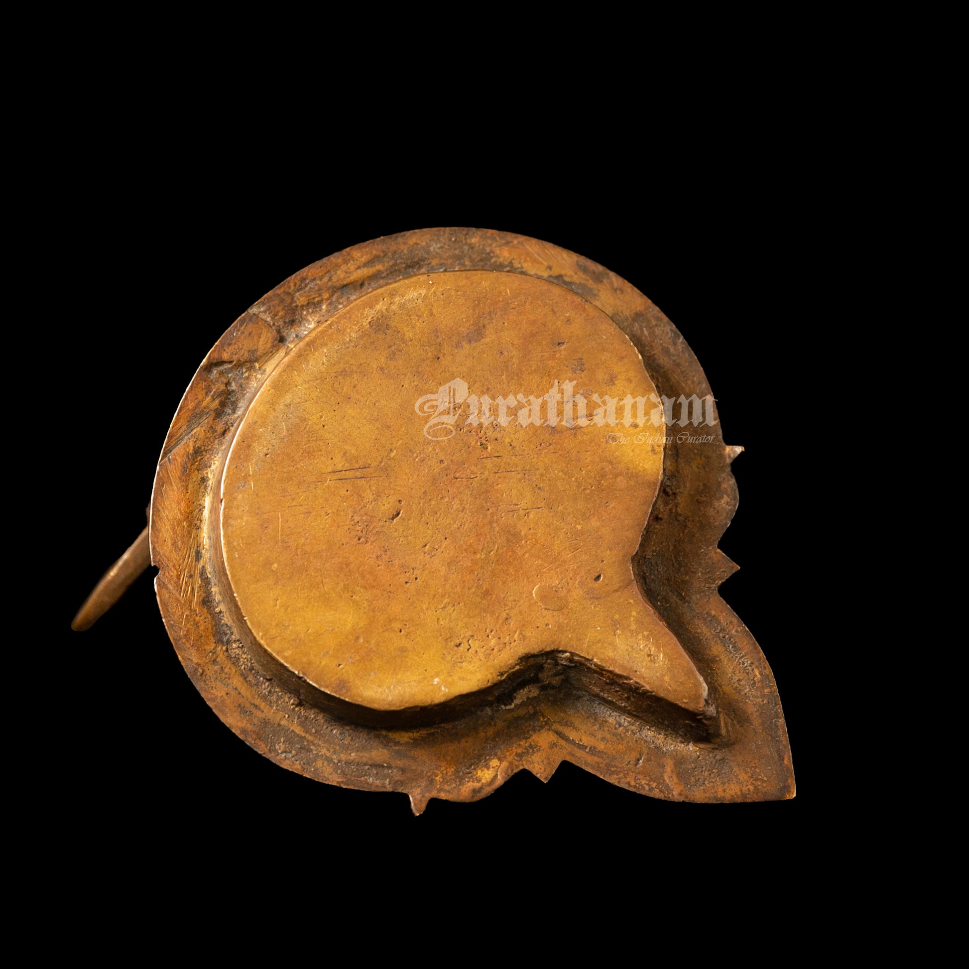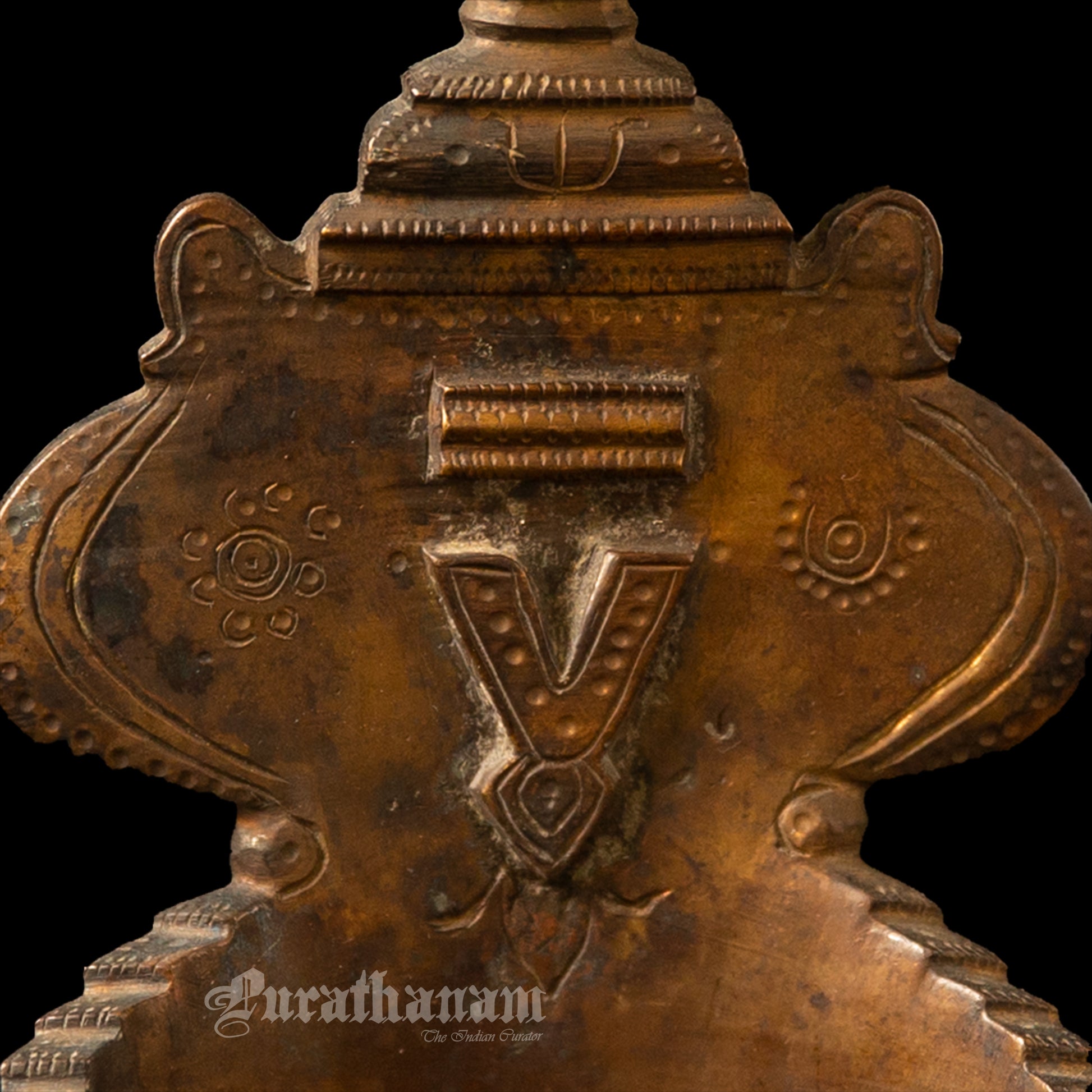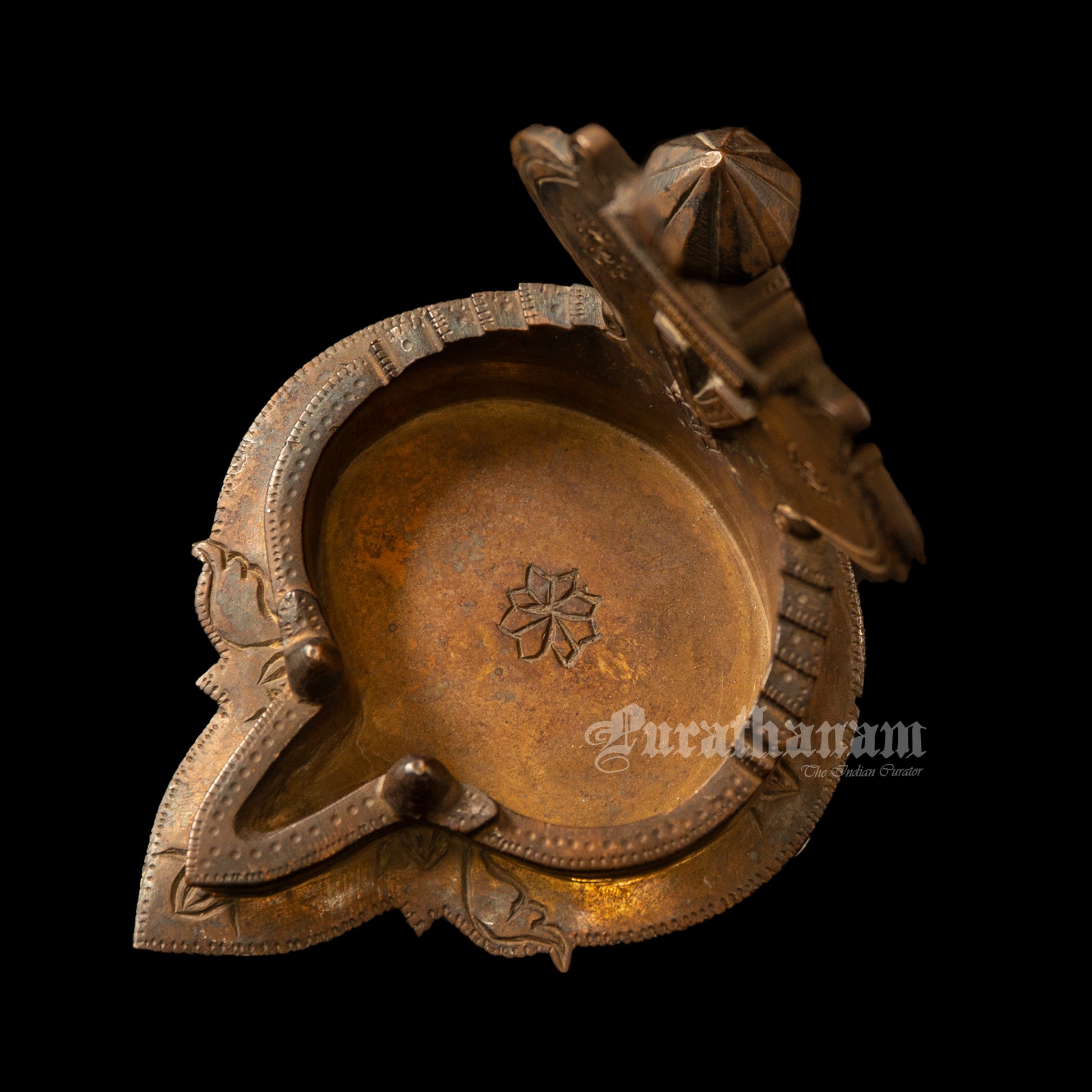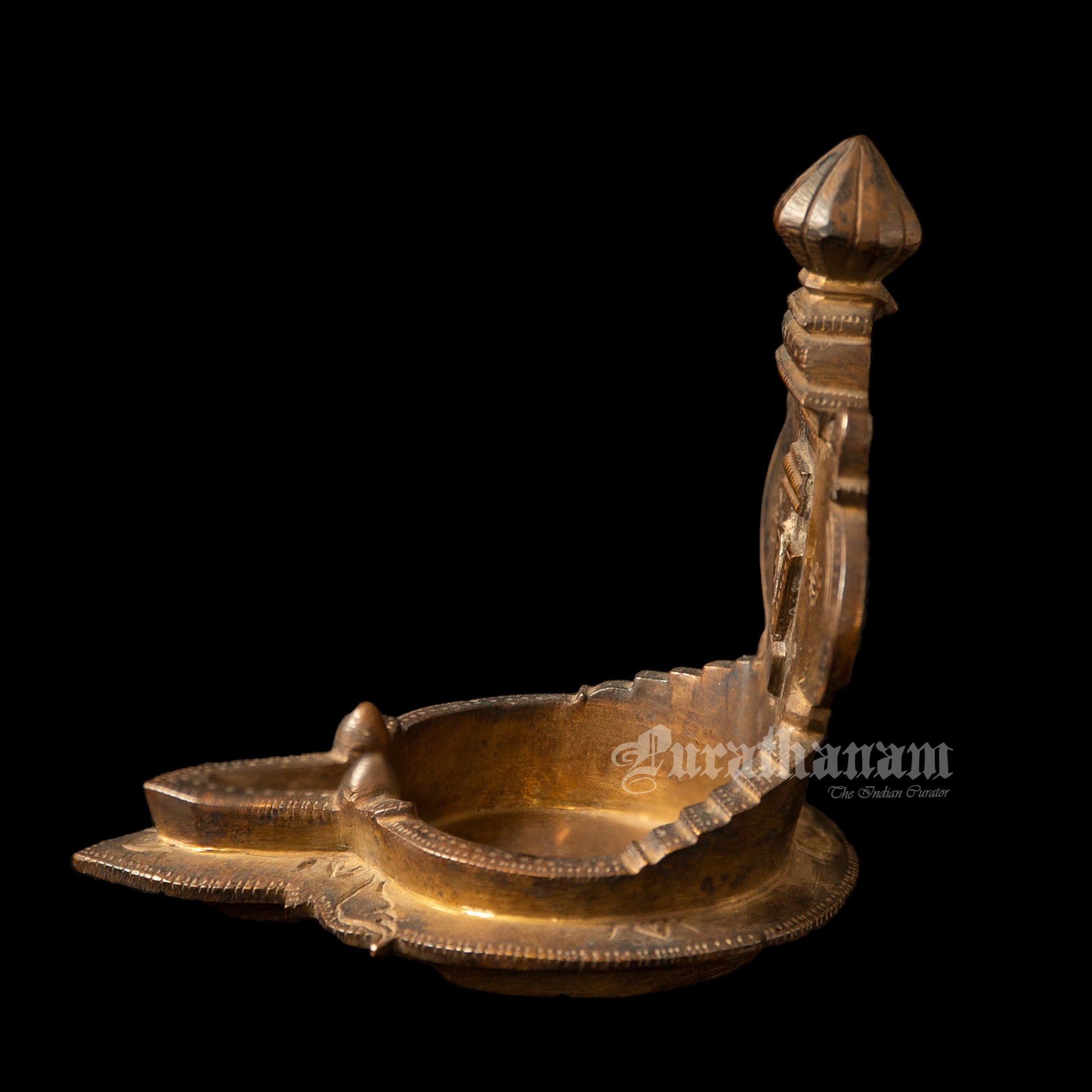 Here we have Vishnu Lakshmi votive oil lamp made of brass.. It has a beautiful hand carved pattern of sun and moon on the either sides of “Sricharanam” symbol of Lord Vishnu at the centre. It also has a flower design carved in the middle of the oil well.