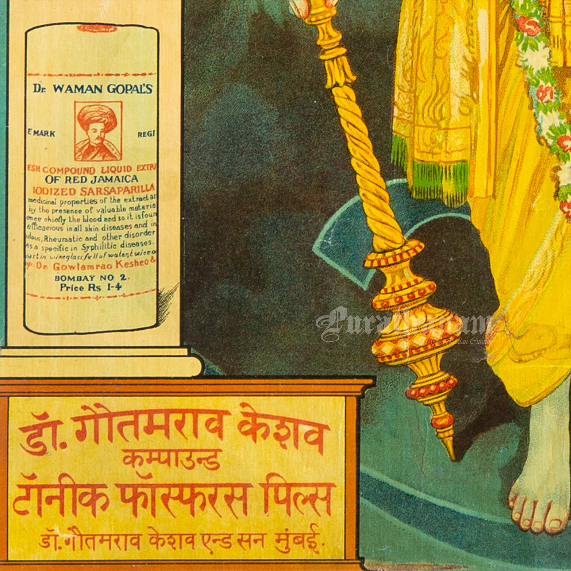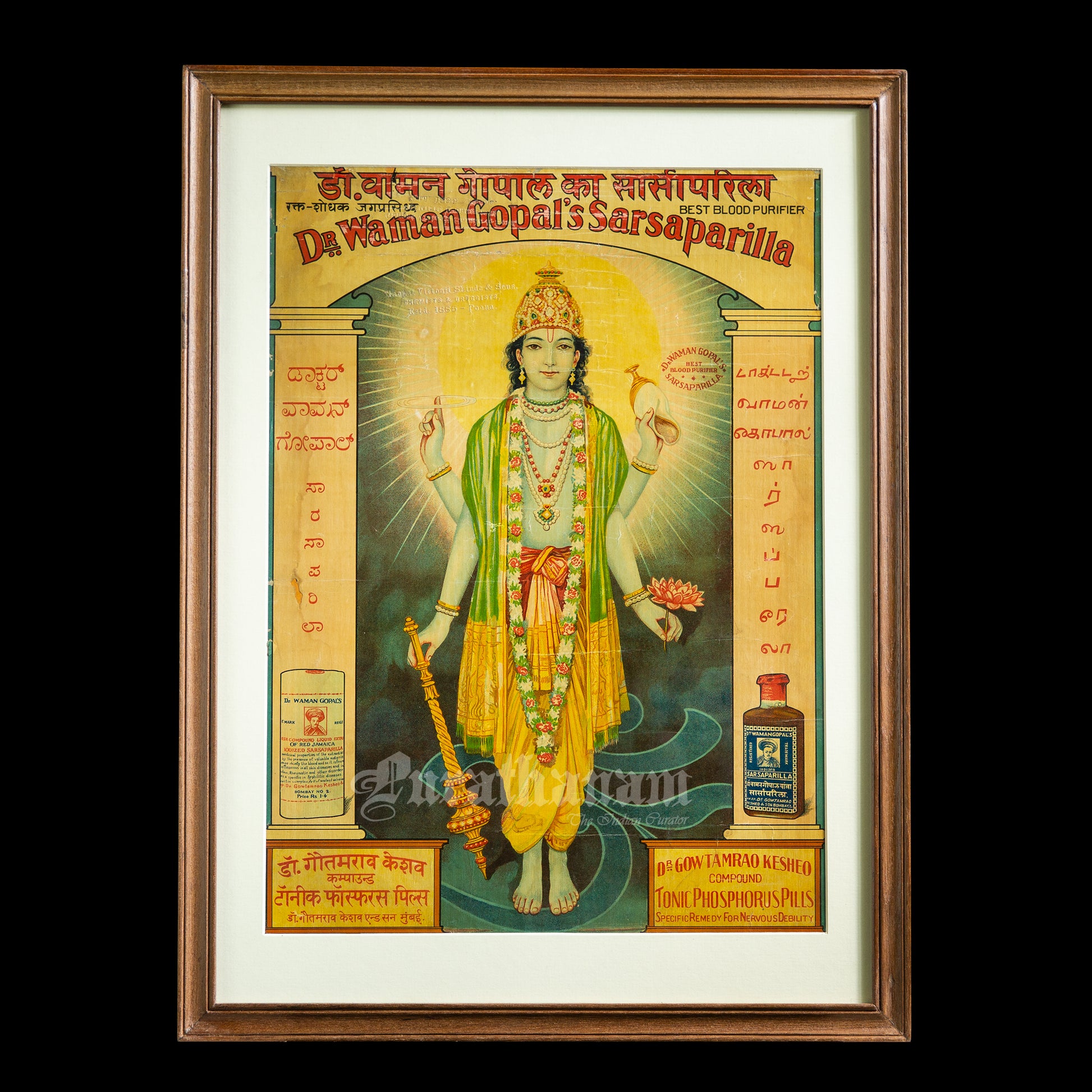 Here is a lithograph print of Vishnu which was printed in 1885 as a commercial poster for Dr. Waman Gopal’s Sarsaparila best Blood purifier.