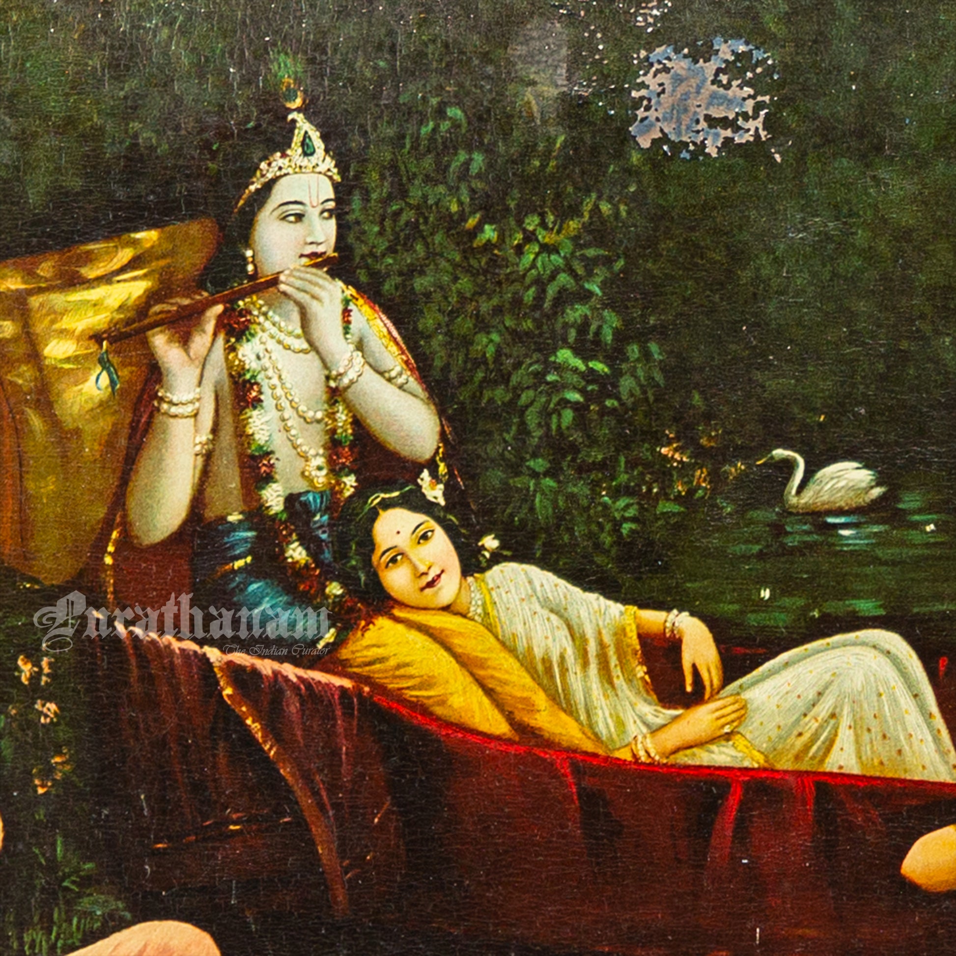 This is an oleograph print from 1928 of Ras Kreeda by Vasudeo Hiralal Pandya an Indian painter.