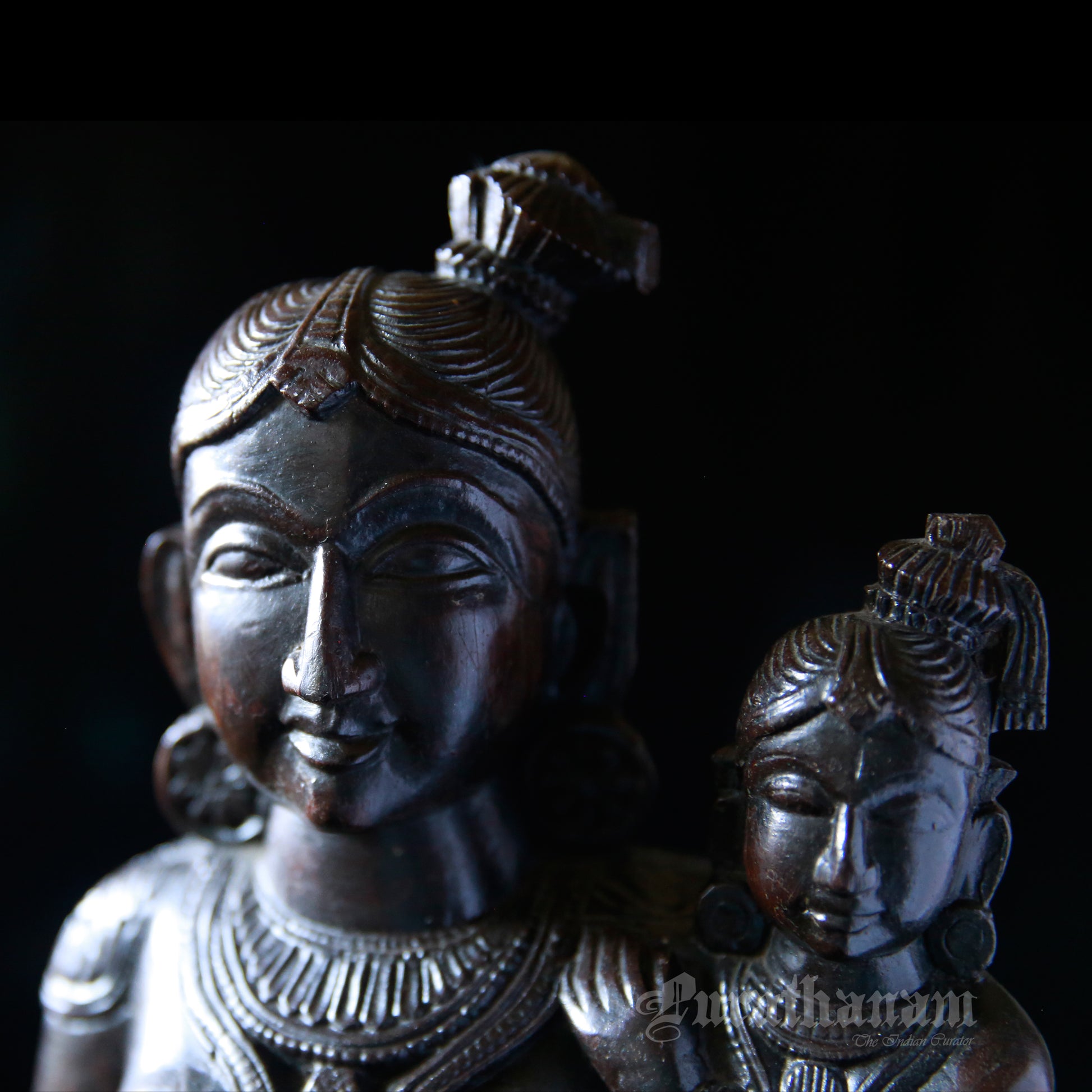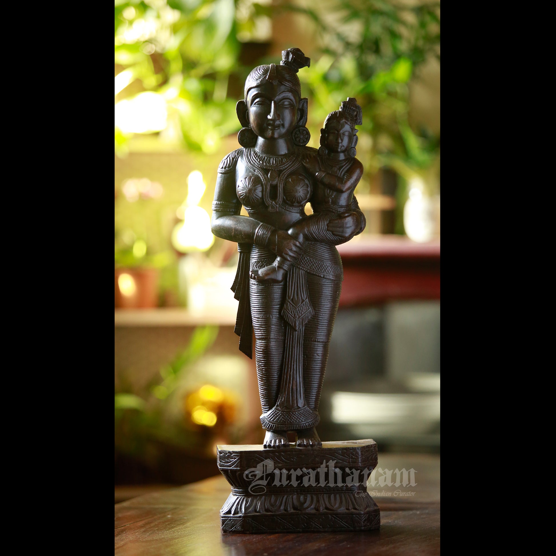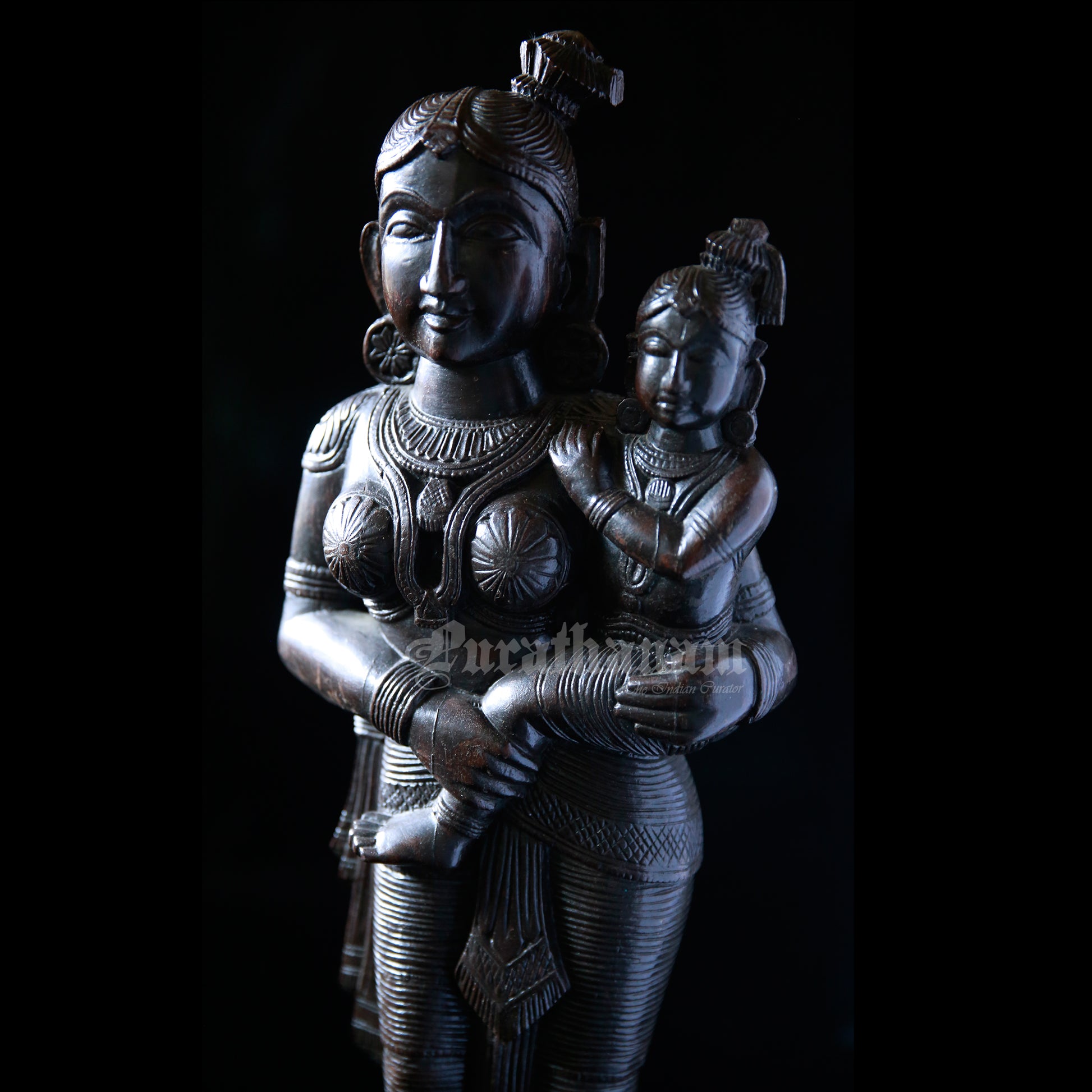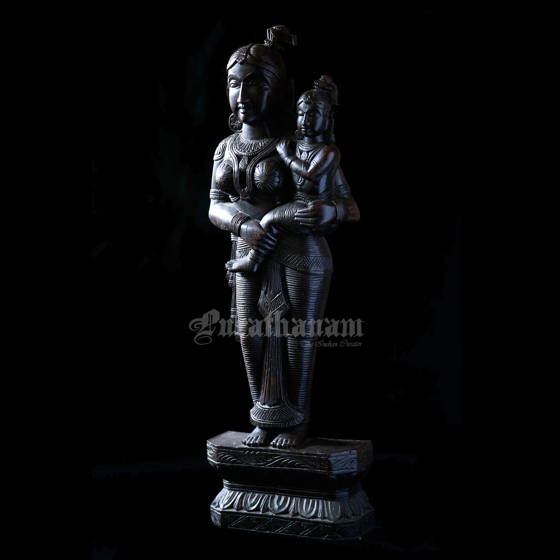 Made of a single block of Rosewood, this Yashodha Krishna statue is an eye catching piece of hand carved art. You will loose track of time looking at the details on the fabric she is wearing and her hair do. The details on young Krishna is immaculate. In mythology, Yashodha is Krishna's foster mom and she looks after him as her own. She is an epitome of motherhood, even without birthing Krishna. Not many remember Devaki as the mother of Krishna, such are Yashodha's tales of motherhood. This sixty year old wooden Yashodha with Krishna would bring a touch of gentleness to your space along with some love.