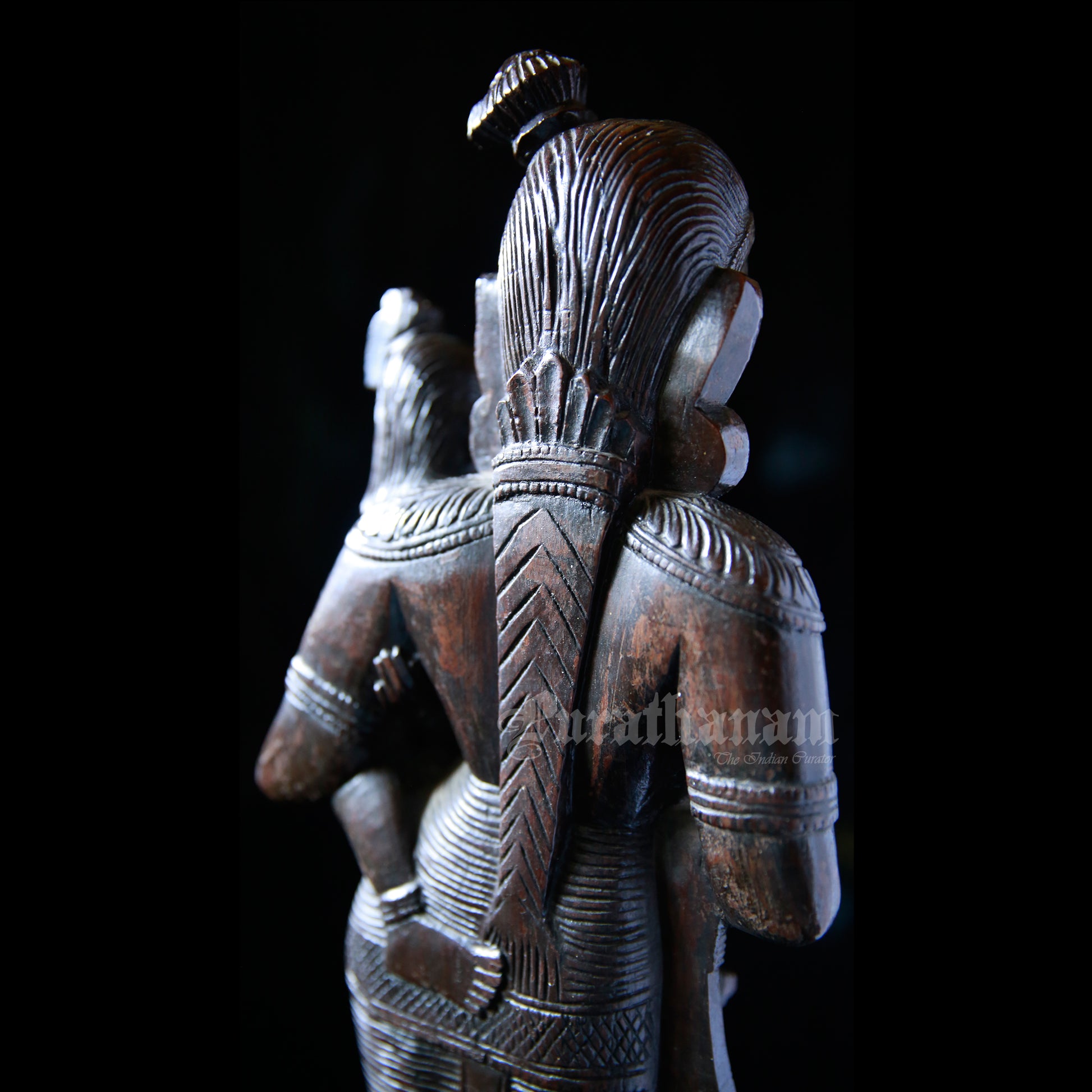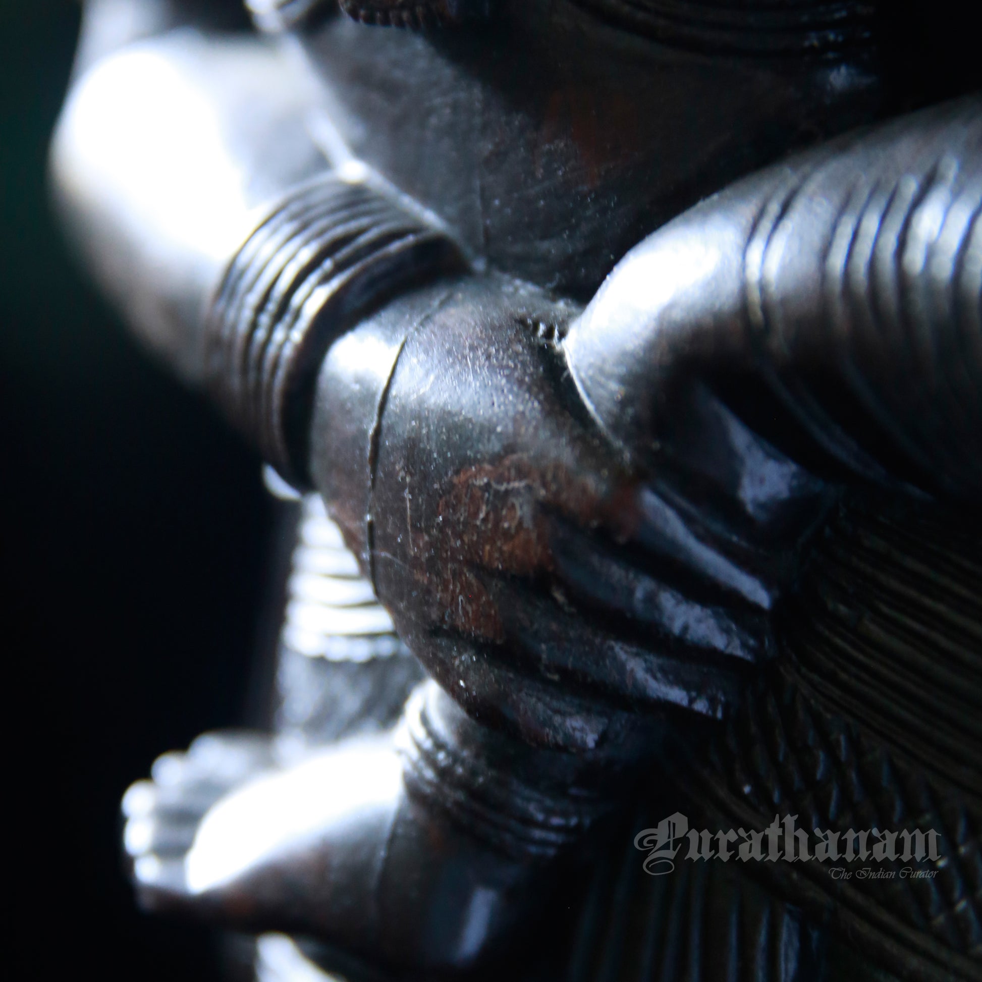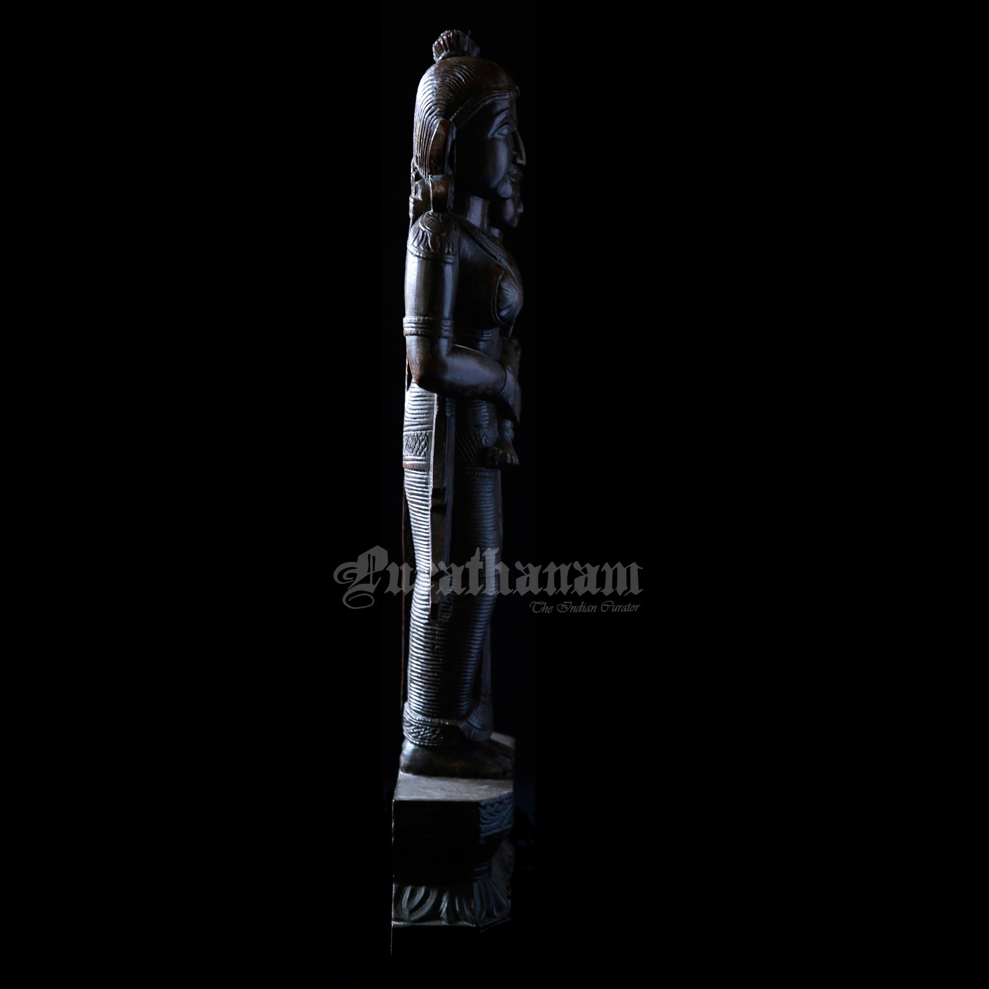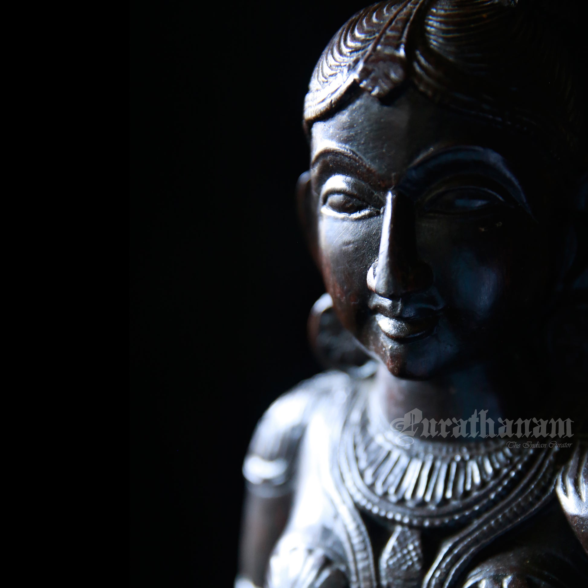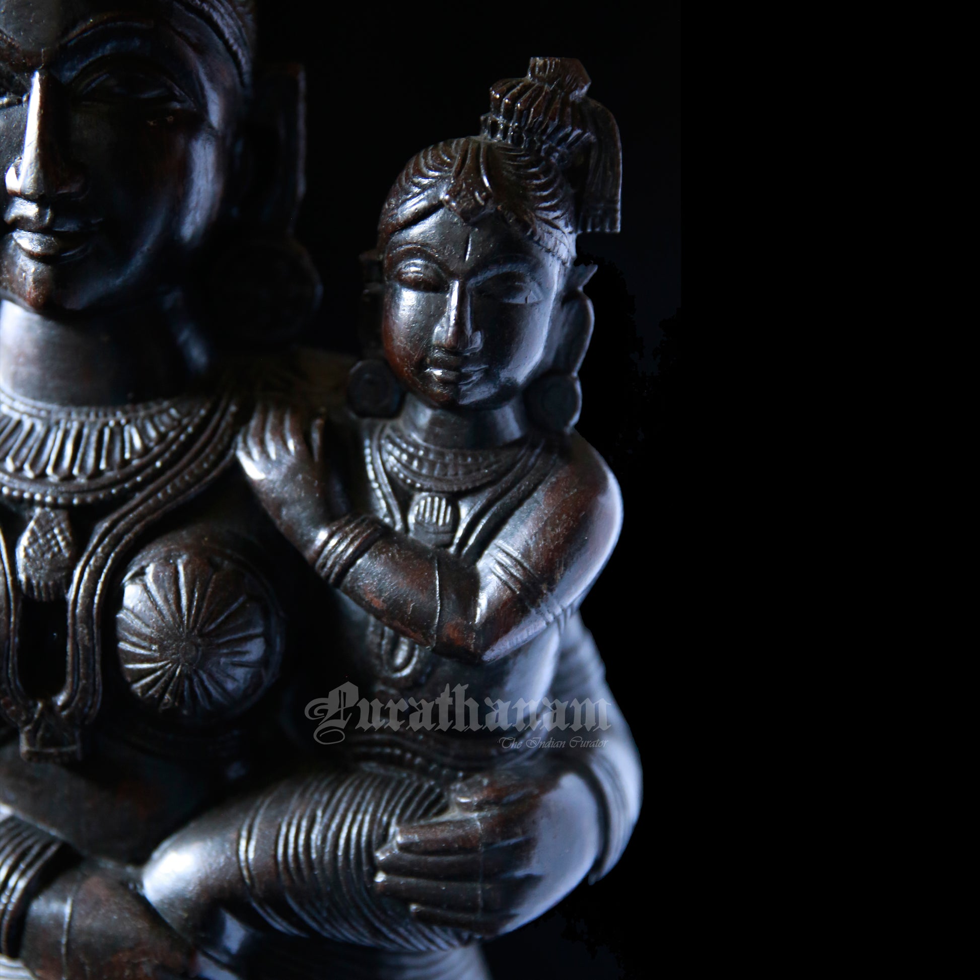 Made of a single block of Rosewood, this Yashodha Krishna statue is an eye catching piece of hand carved art. You will loose track of time looking at the details on the fabric she is wearing and her hair do. The details on young Krishna is immaculate. In mythology, Yashodha is Krishna's foster mom and she looks after him as her own. She is an epitome of motherhood, even without birthing Krishna. Not many remember Devaki as the mother of Krishna, such are Yashodha's tales of motherhood. This sixty year old wooden Yashodha with Krishna would bring a touch of gentleness to your space along with some love.