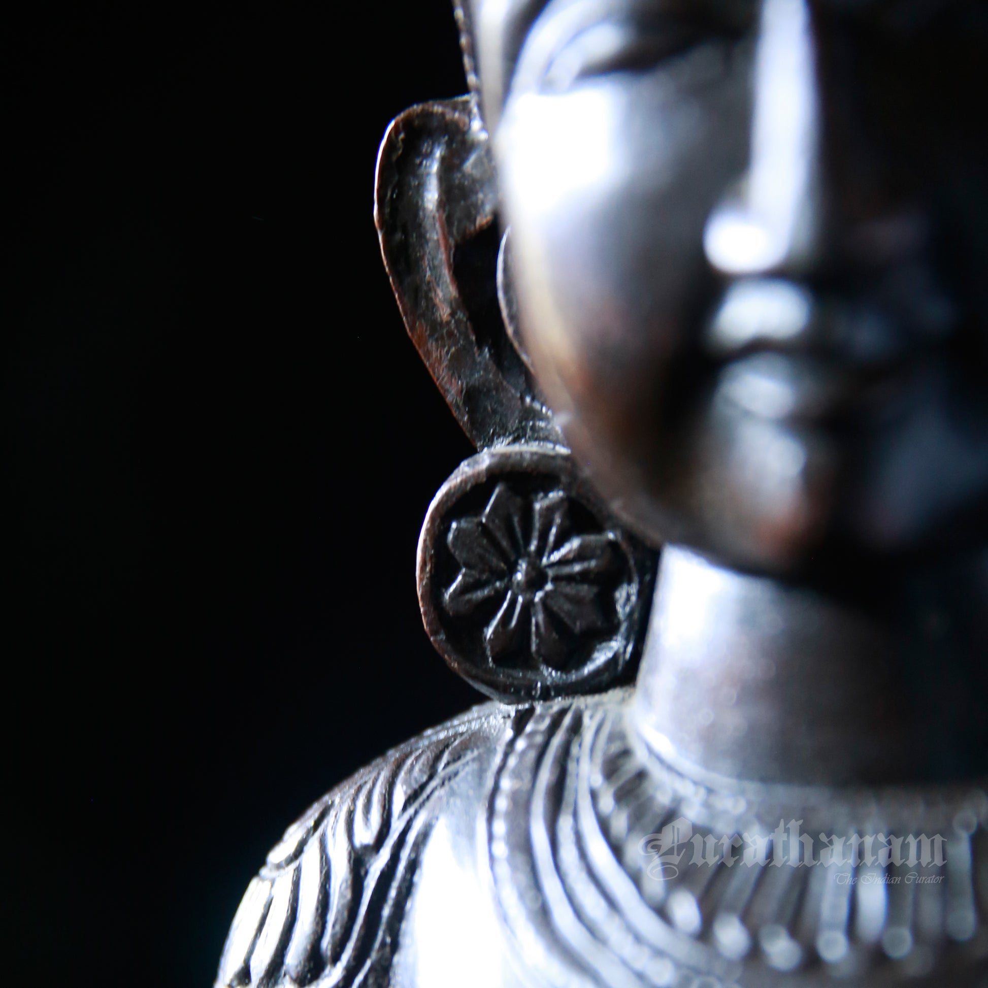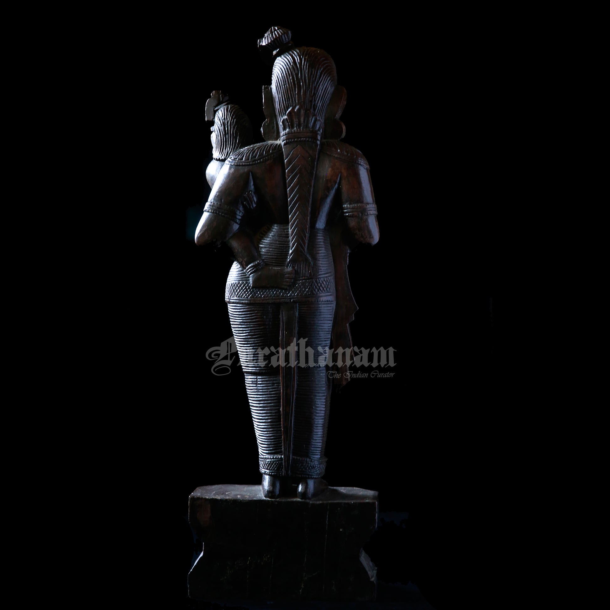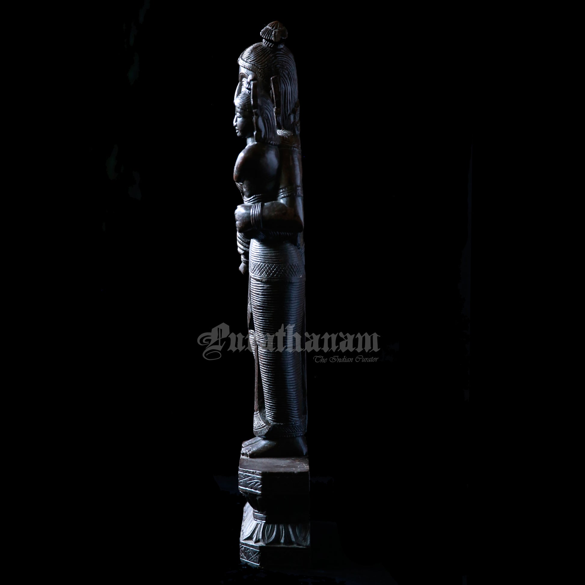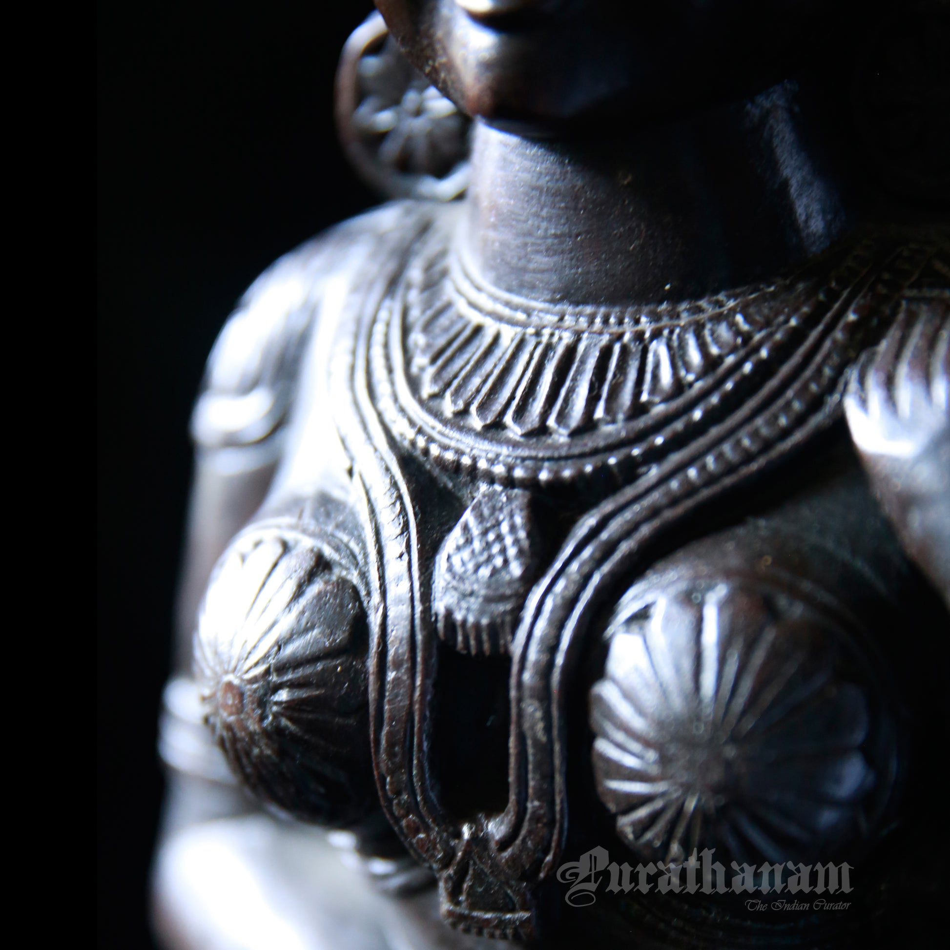 Made of a single block of Rosewood, this Yashodha Krishna statue is an eye catching piece of hand carved art. You will loose track of time looking at the details on the fabric she is wearing and her hair do. The details on young Krishna is immaculate. In mythology, Yashodha is Krishna's foster mom and she looks after him as her own. She is an epitome of motherhood, even without birthing Krishna. Not many remember Devaki as the mother of Krishna, such are Yashodha's tales of motherhood. This sixty year old wooden Yashodha with Krishna would bring a touch of gentleness to your space along with some love.